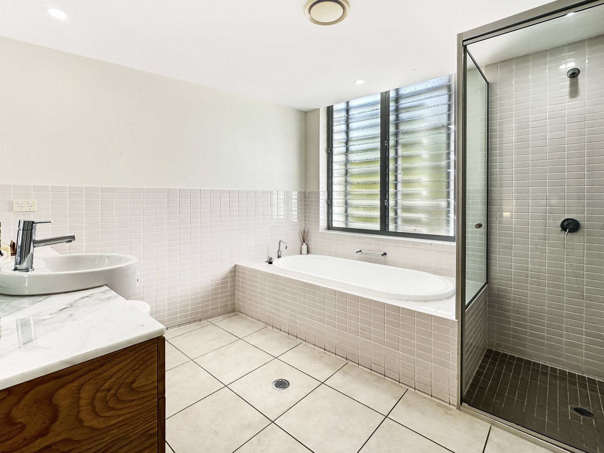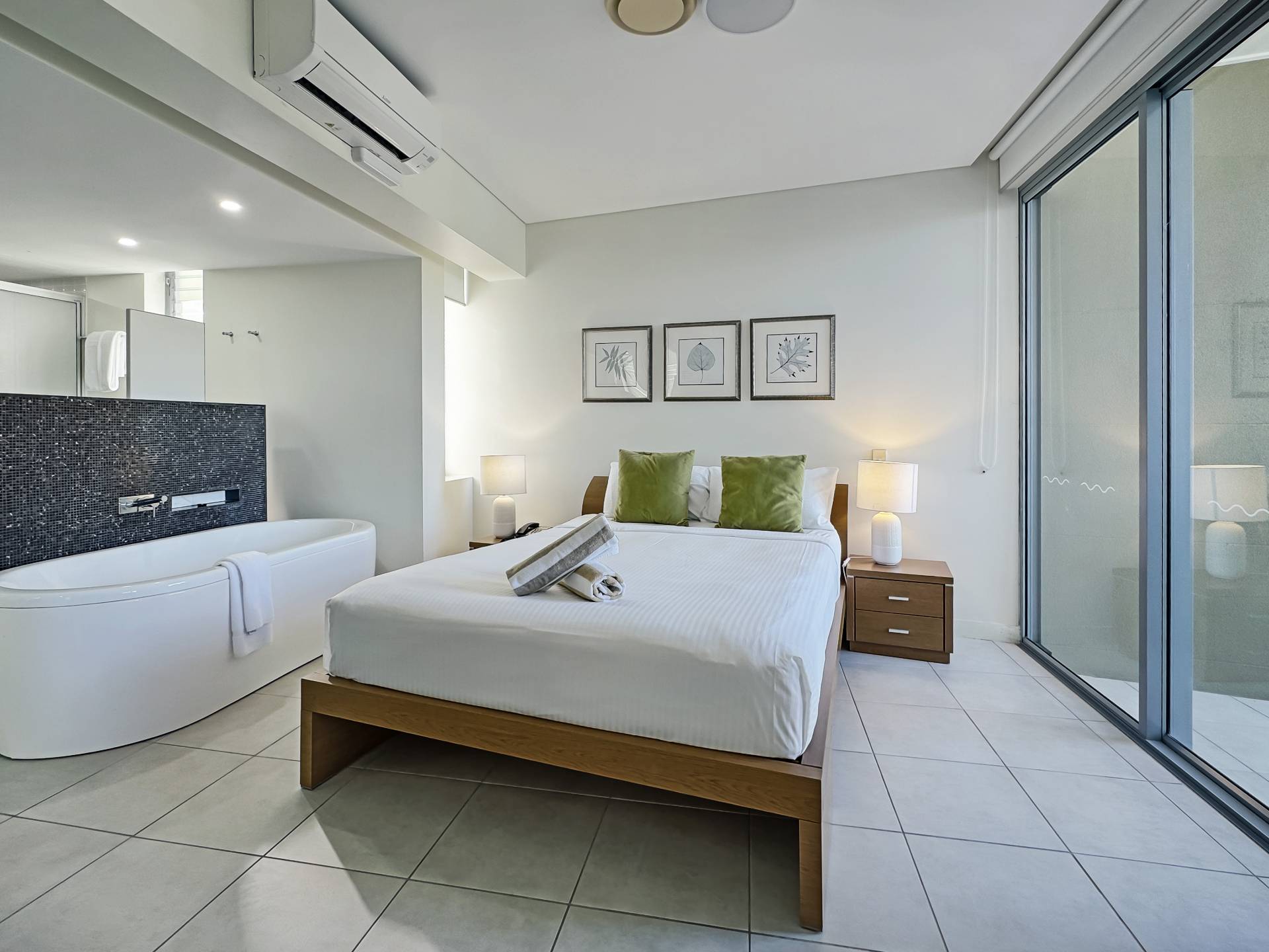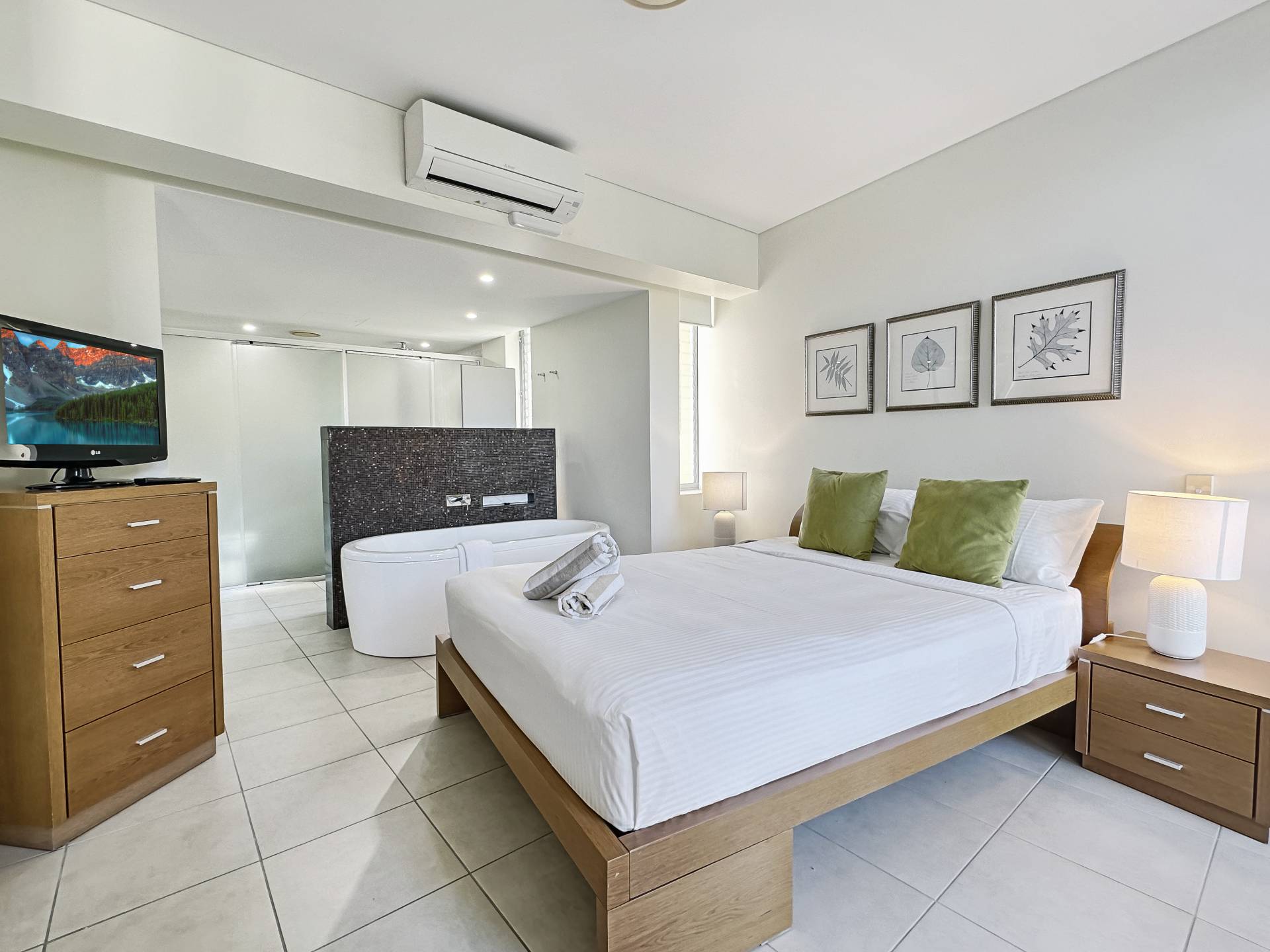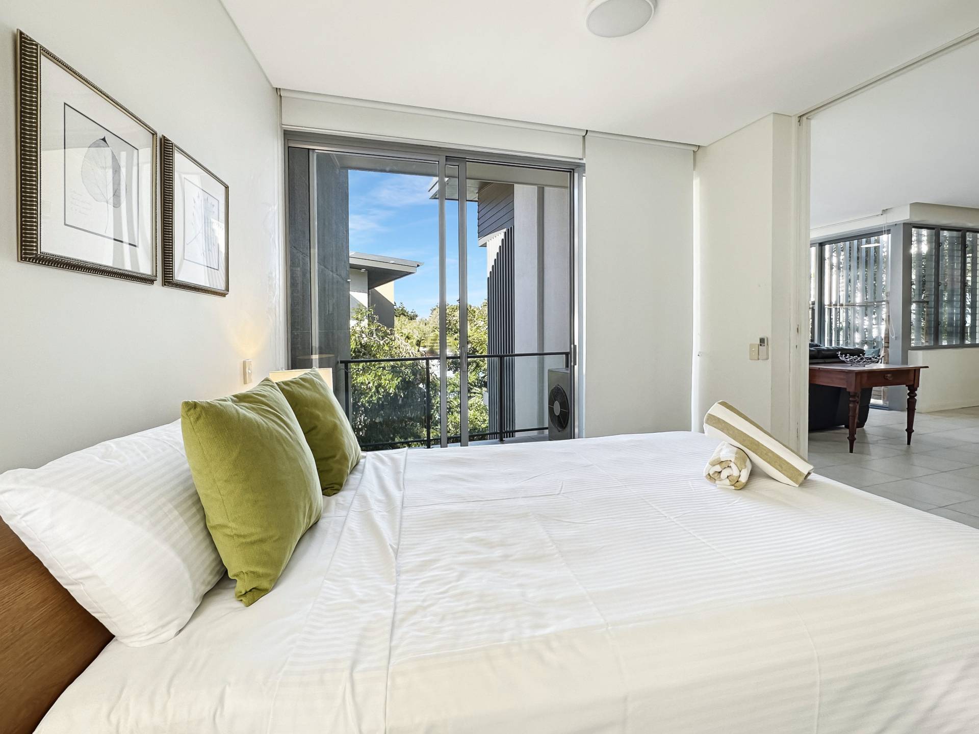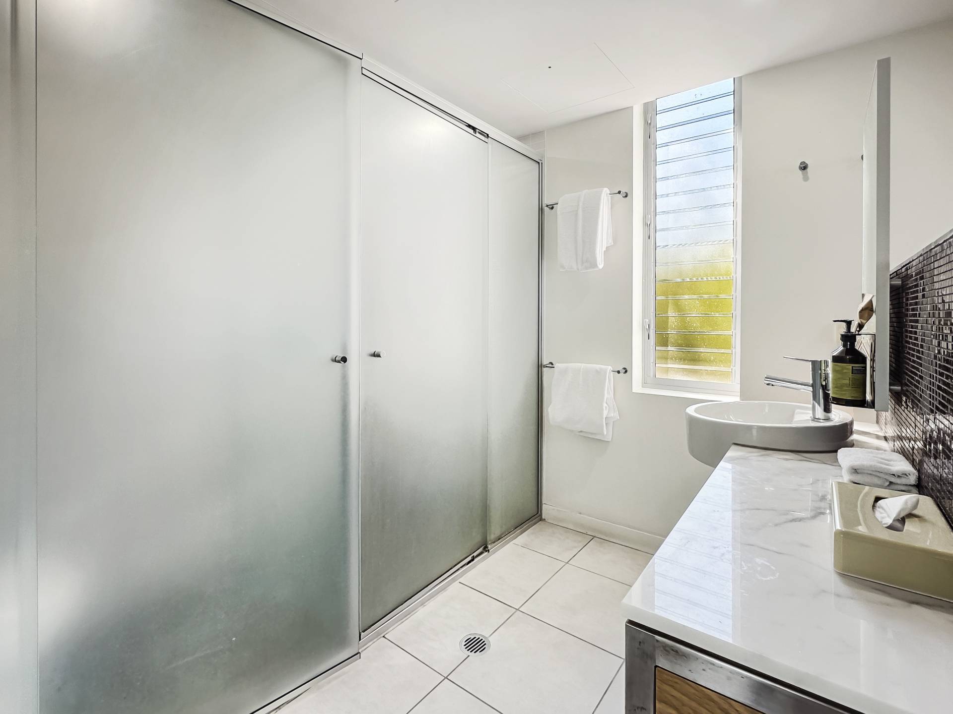 The master bedroom opens onto its own terrace and features an ensuite bathroom with bath, marble-topped vanity and separate shower. The second bedroom is very separately located to the rear of the apartment with the second bathroom adjacent - also with bath, separate shower and marble-topped vanity, so your guests can have their own space.