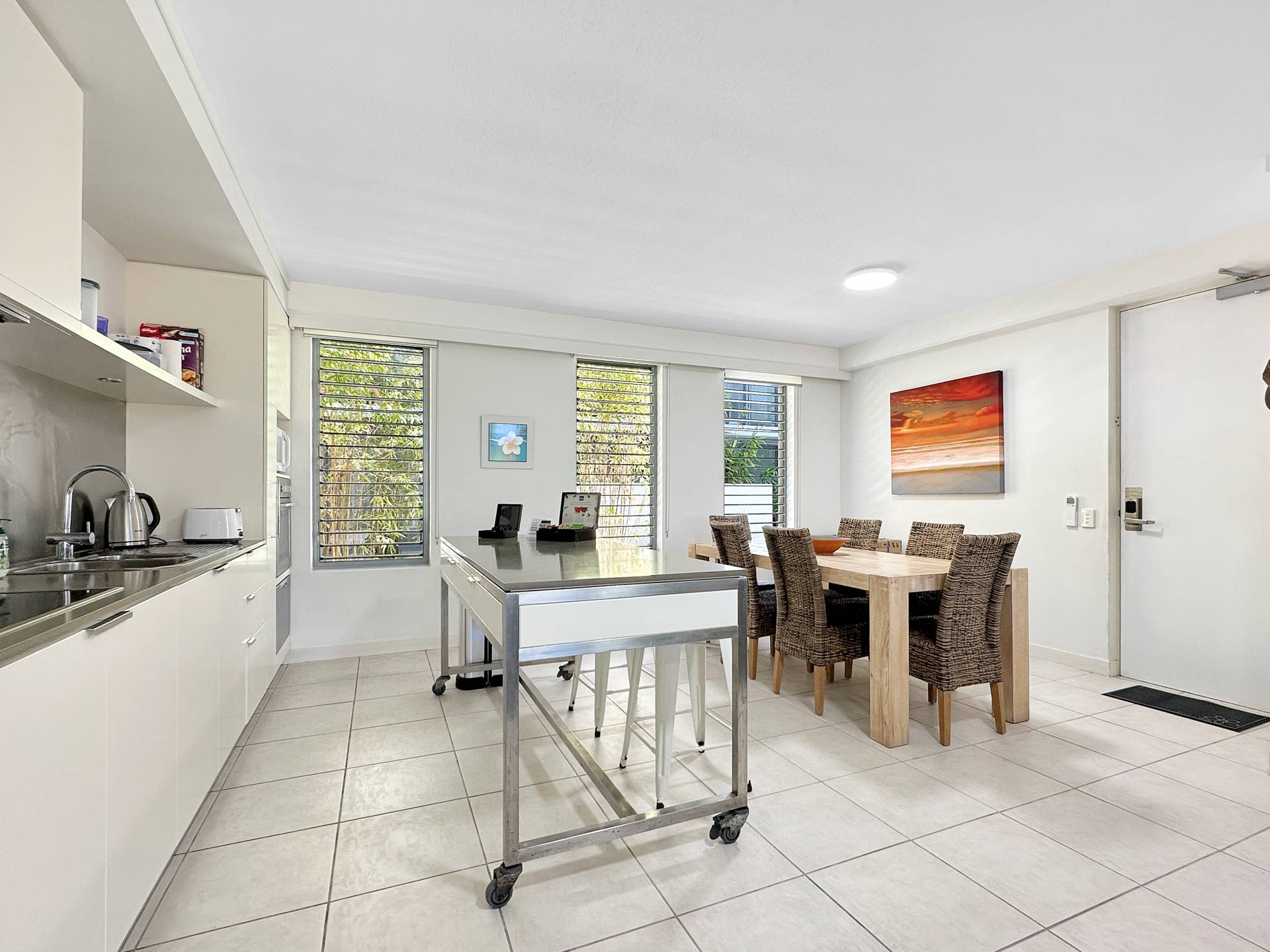 * Spacious open-plan living/dining/kitchen area opens onto large covered deck through floor-to-ceiling glass doors