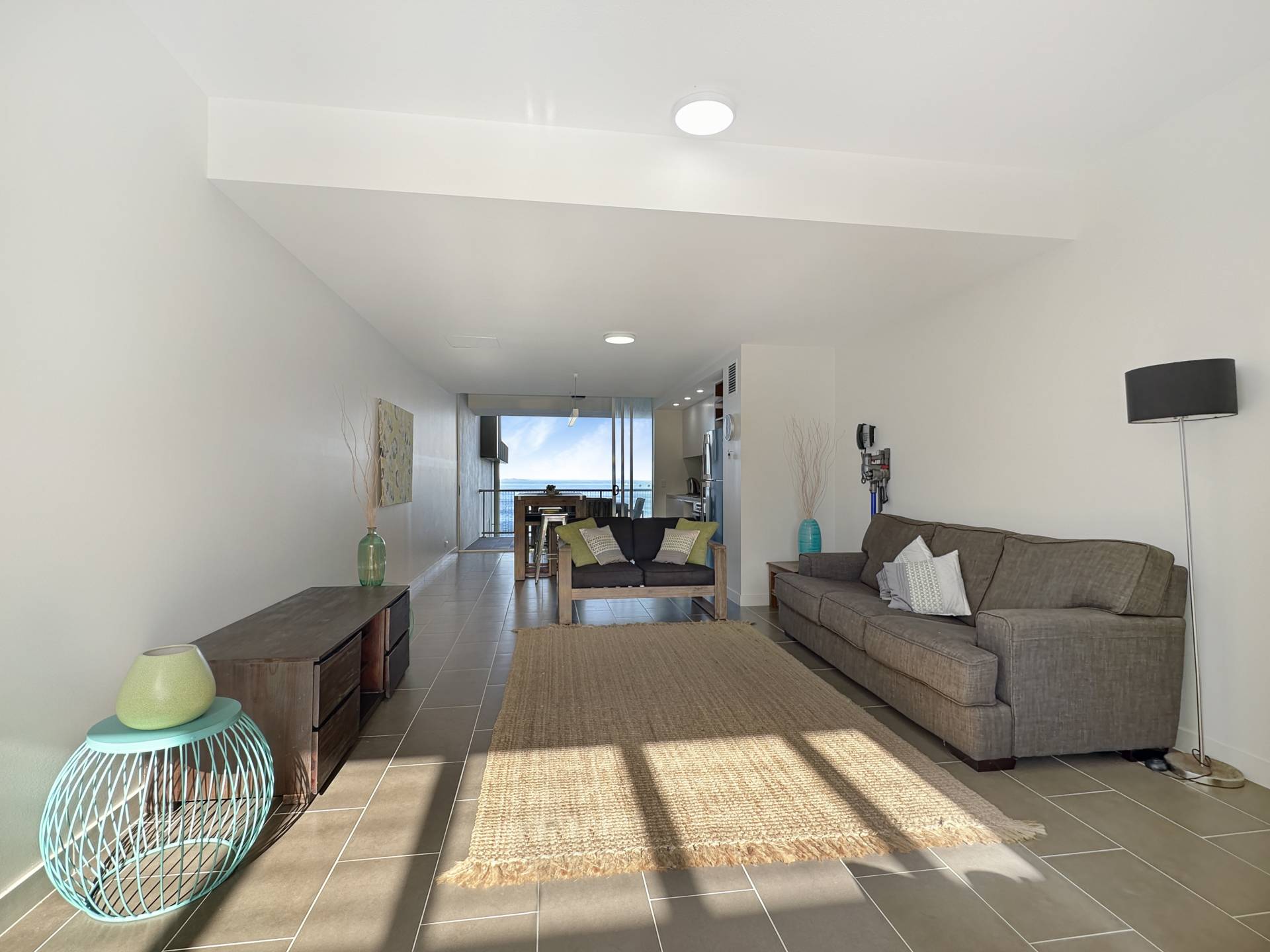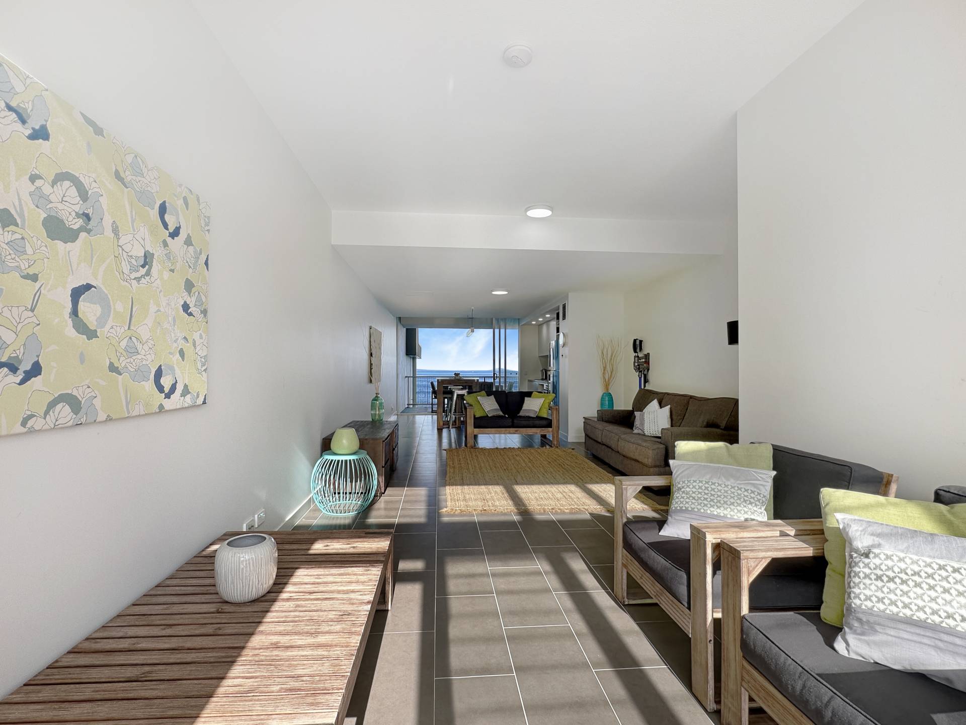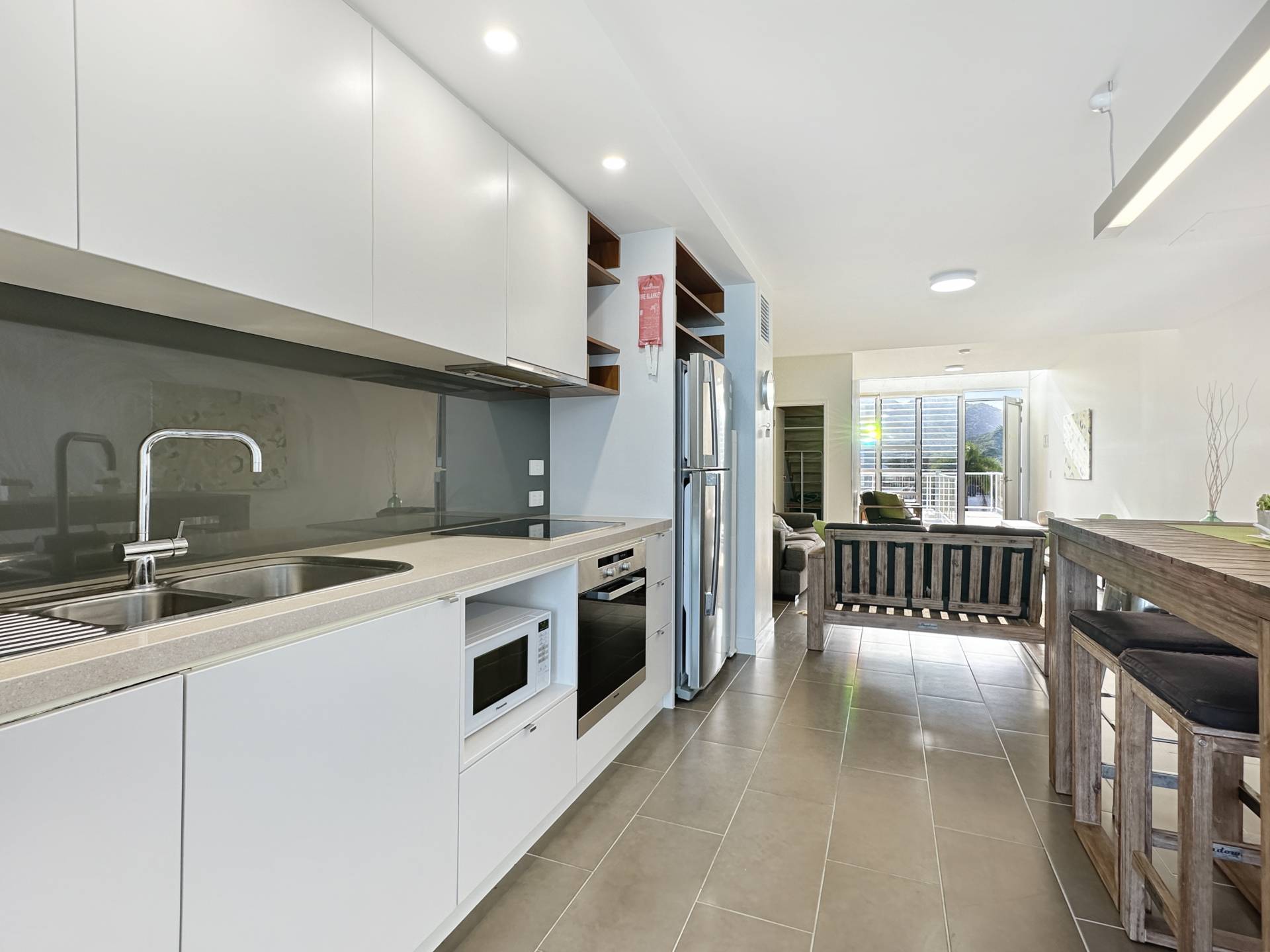 The open-plan living area makes the most of the views with a comfortable living area and stylish kitchen with stone benchtops and stainless steel appliances. The covered balcony is shaded from the summer sun and sheltered to capture just the right amount of cooling ocean breeze, ideal for relaxing with a refreshing drink after a hard day at the beach or one of the resort’s four pools.