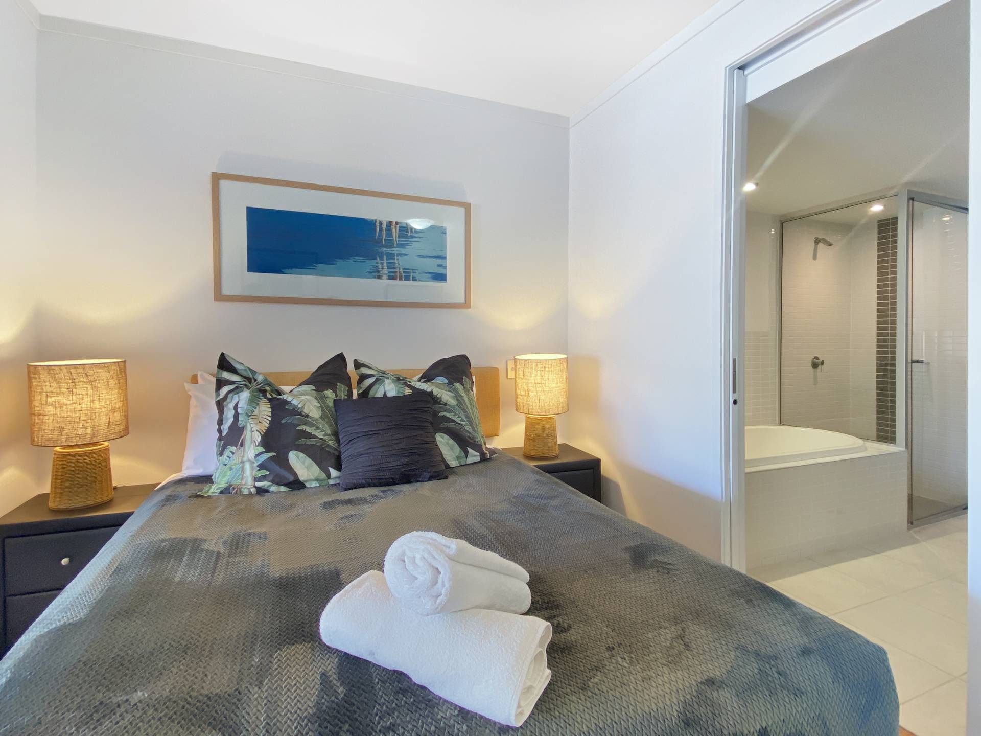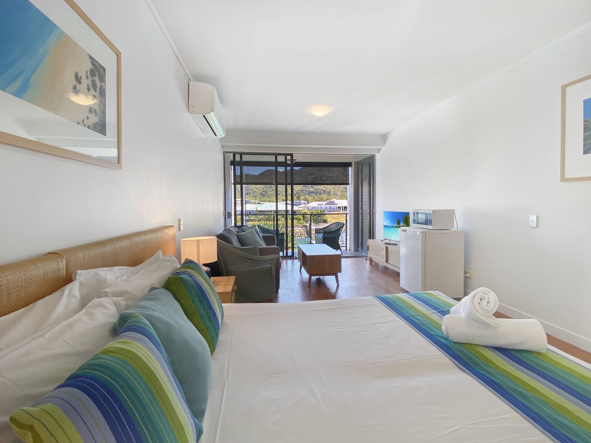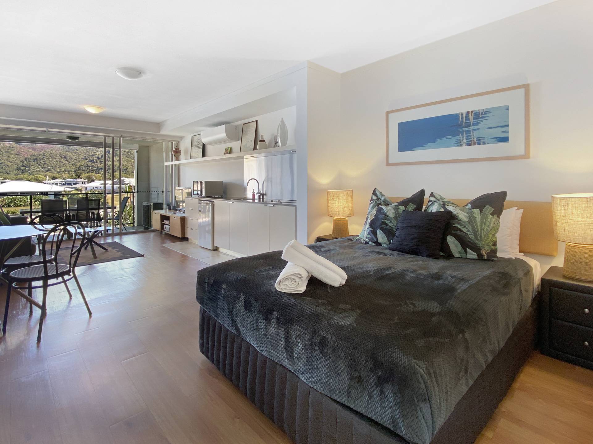 * The larger studio unit is comfortable for longer stays with a kitchenette, dining area, lounge, bathroom and laundry. Floor to ceiling glass doors open onto the balcony with its beautiful water views.