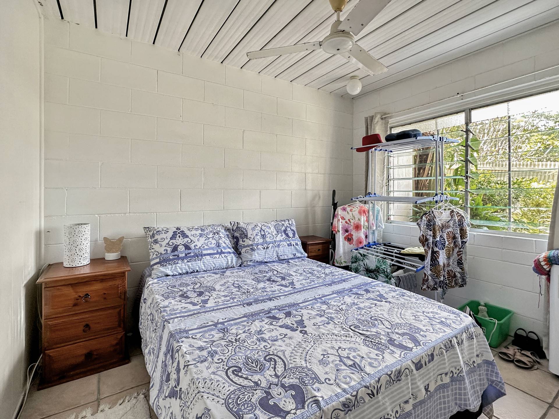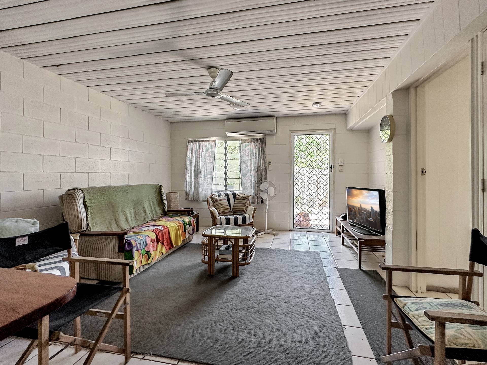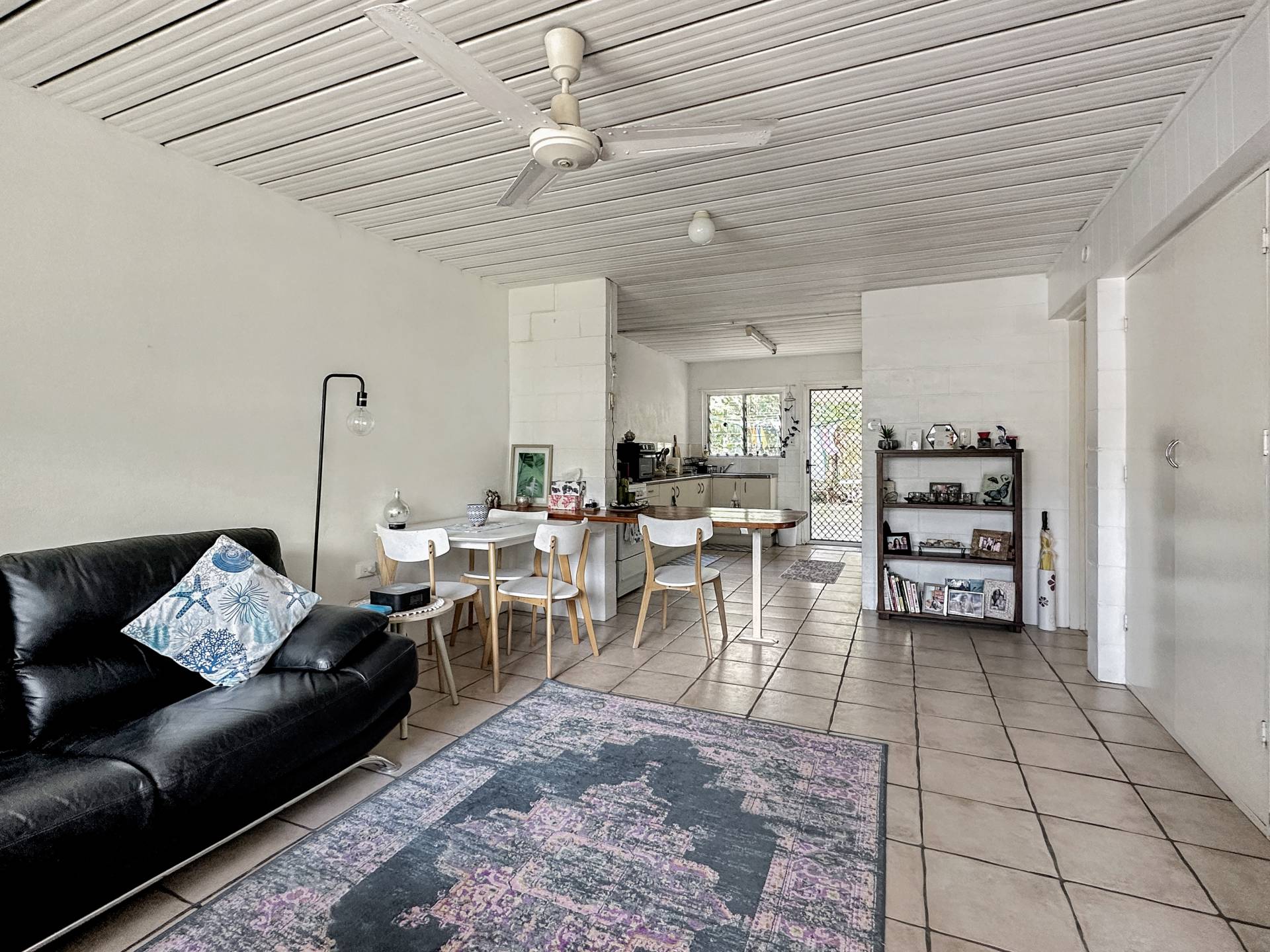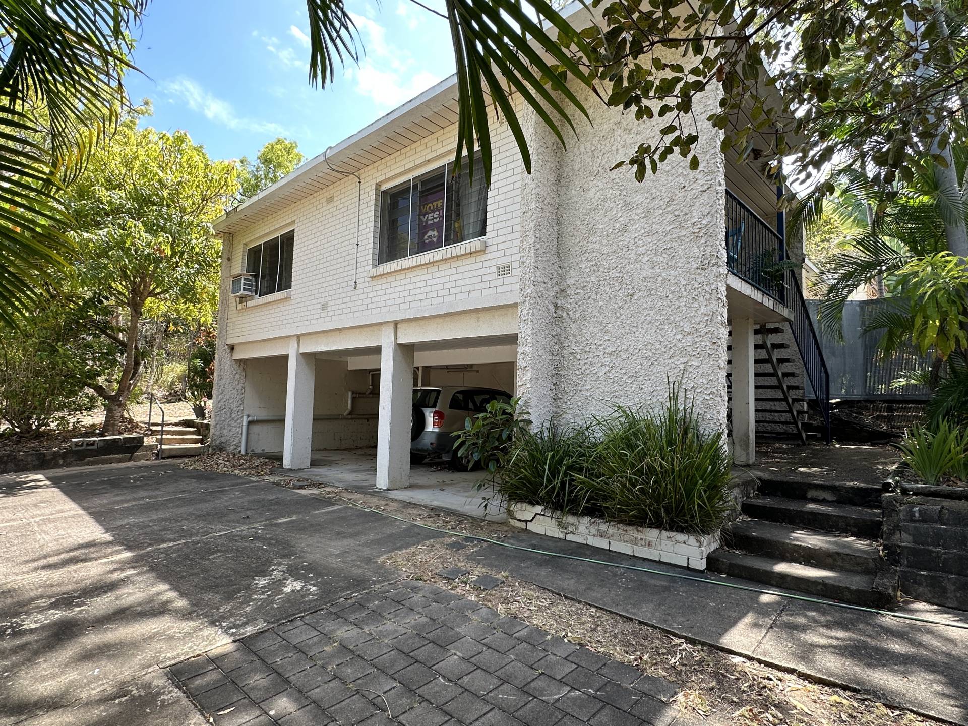 There are three undercover carports at the front of the property above which is unit 1 with stair access on both sides of the building. The small balcony at the front door enjoys a lovely view up to Hawkings Point. The living/dining/kitchen has a split system air con but is otherwise in need of an update, however, the current tenant has been happily living there for years and finds it perfectly comfortable! The bedroom is a good size and has a nice elevated view out over Picnic Bay through the louvre windows, with a box air con, ceiling fan and built-in-robe. The bathroom/laundry is in original condition and opens to the back steps and garden.