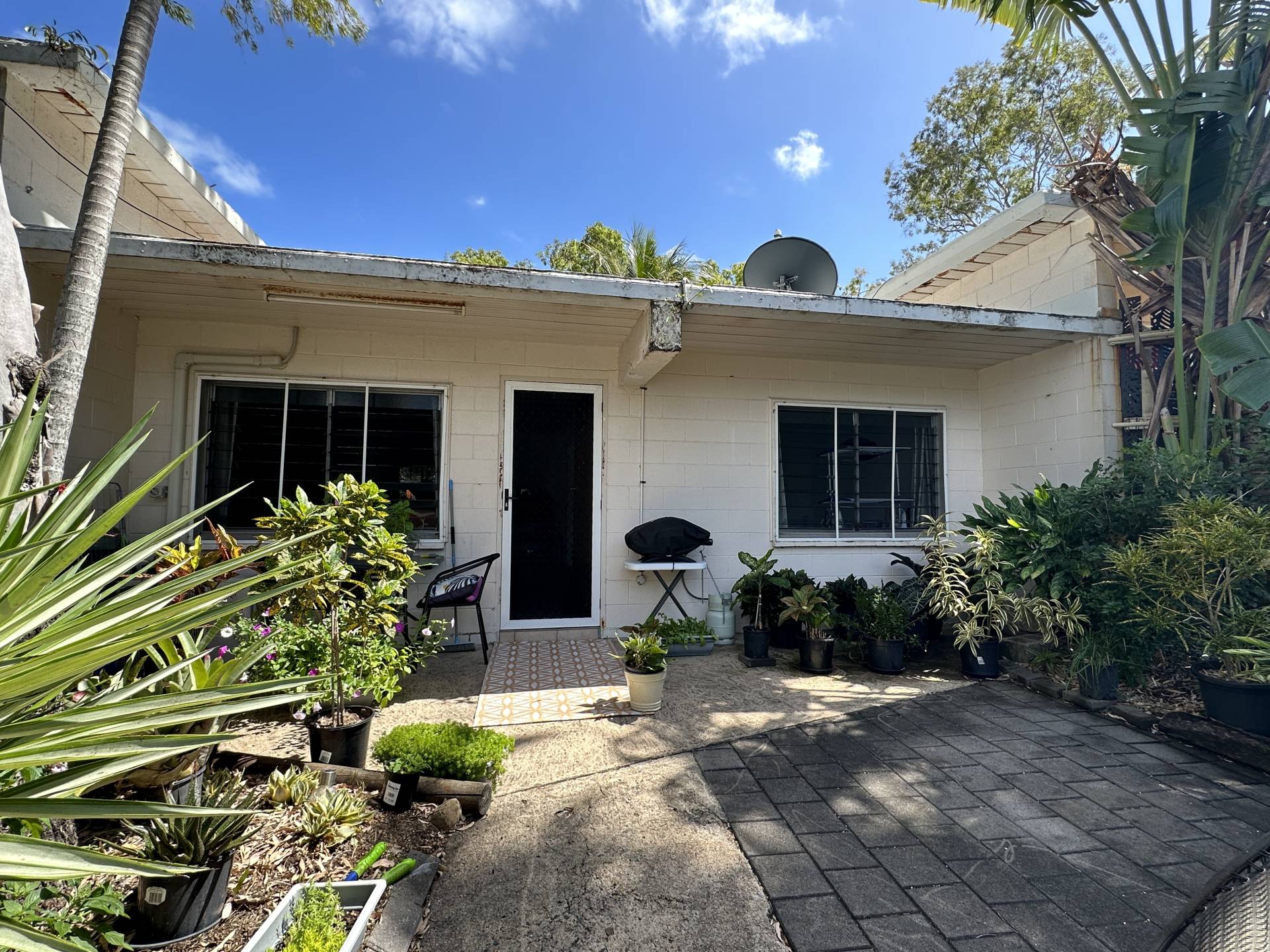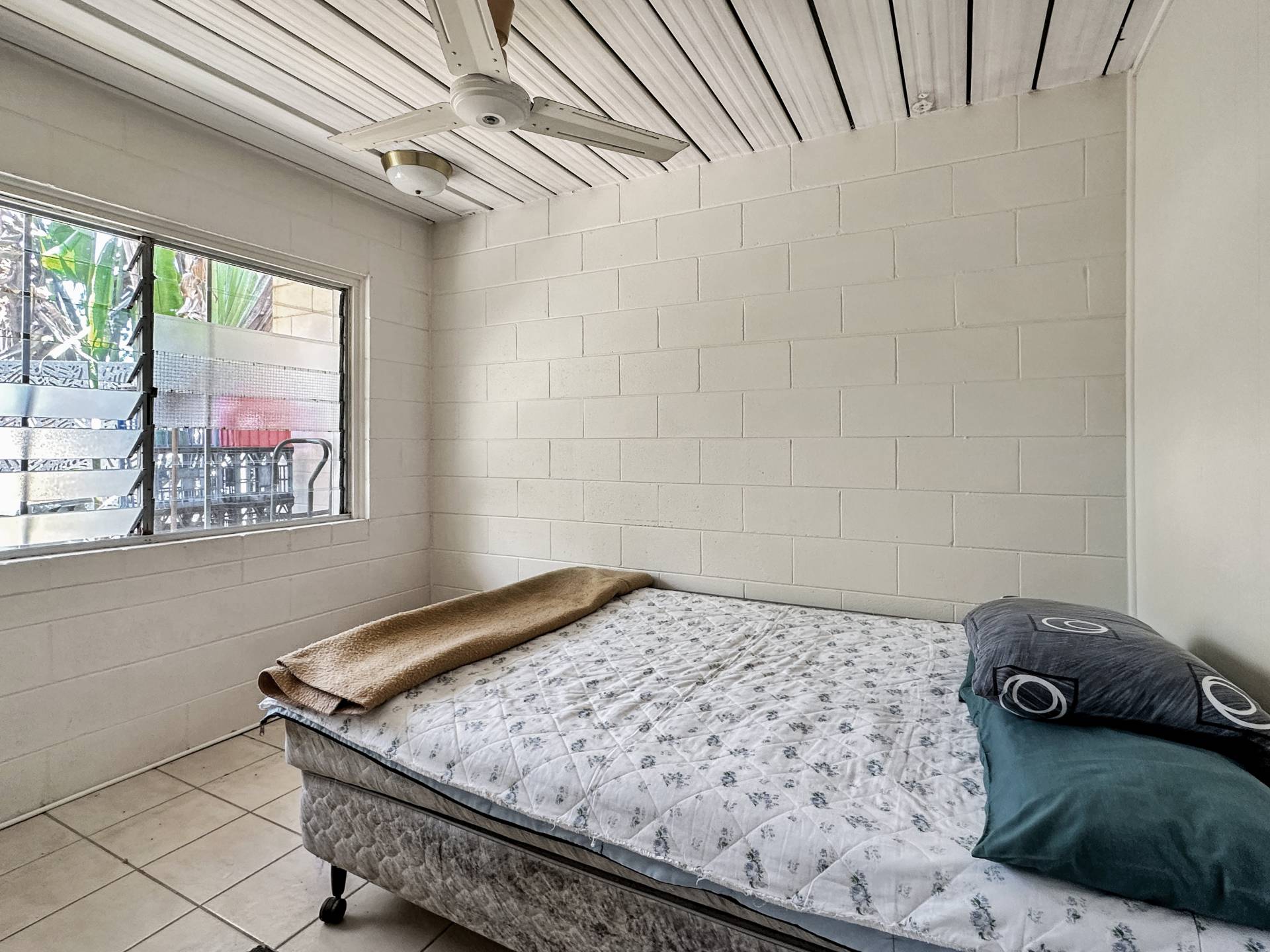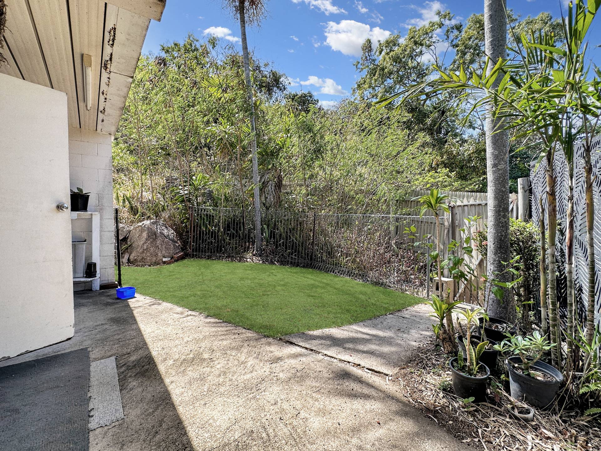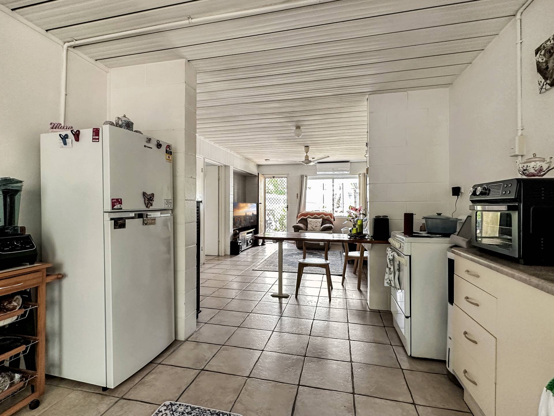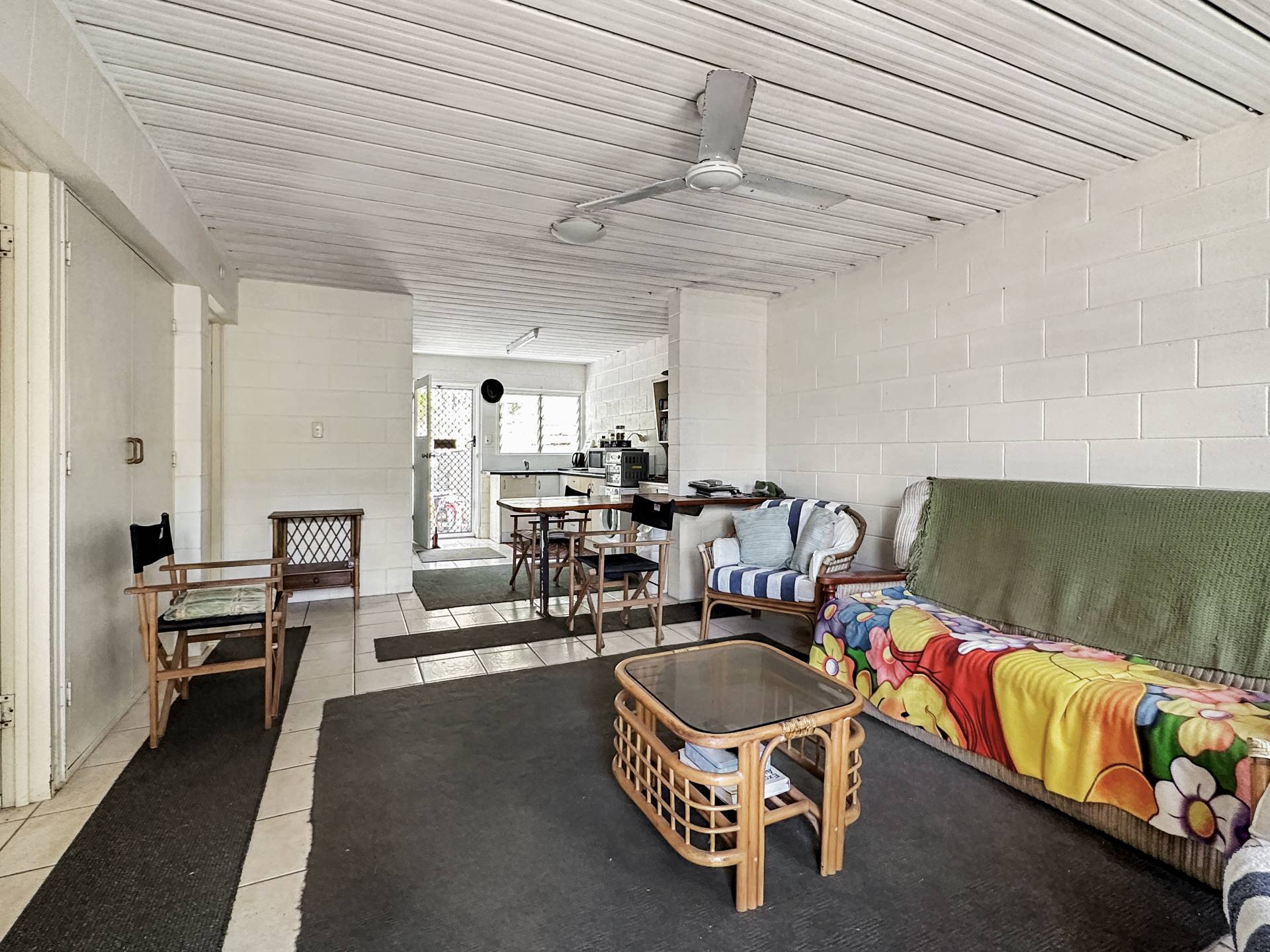 There are three undercover carports at the front of the property above which is unit 1 with stair access on both sides of the building. The small balcony at the front door enjoys a lovely view up to Hawkings Point. The living/dining/kitchen has a split system air con but is otherwise in need of an update, however, the current tenant has been happily living there for years and finds it perfectly comfortable! The bedroom is a good size and has a nice elevated view out over Picnic Bay through the louvre windows, with a box air con, ceiling fan and built-in-robe. The bathroom/laundry is in original condition and opens to the back steps and garden.