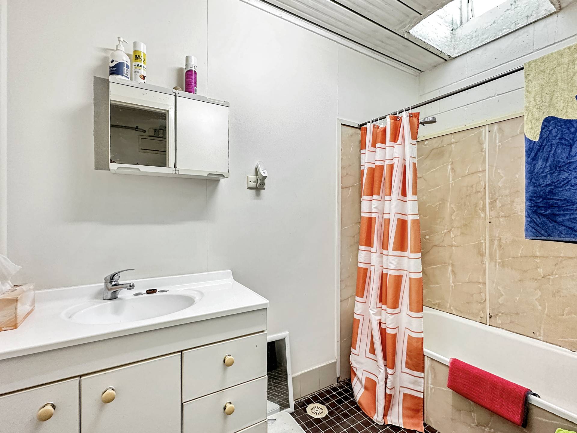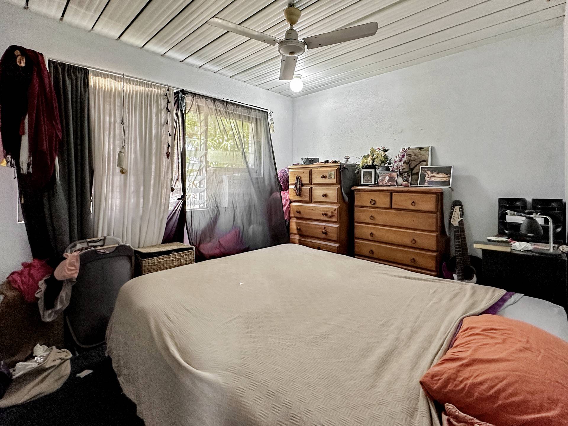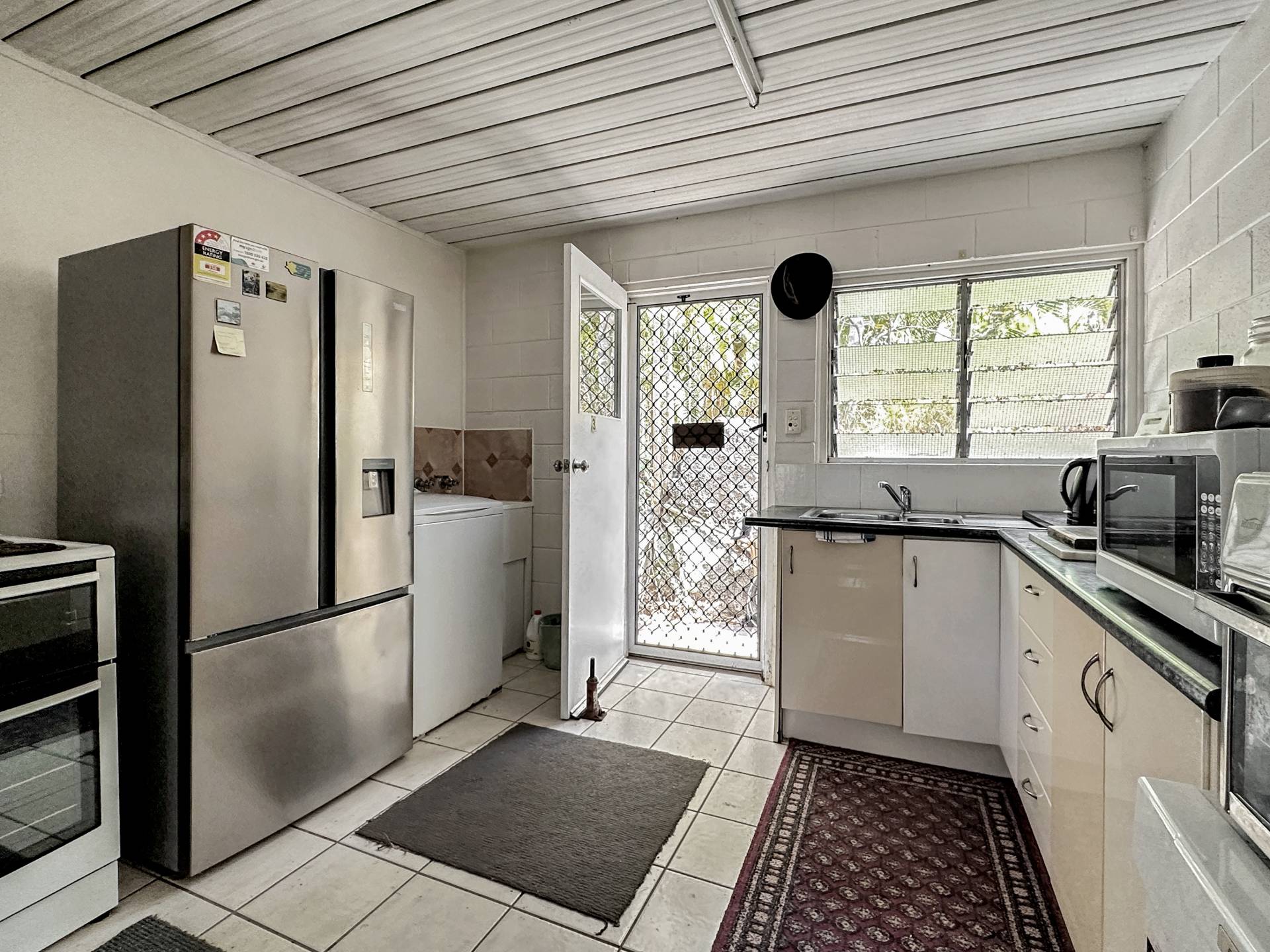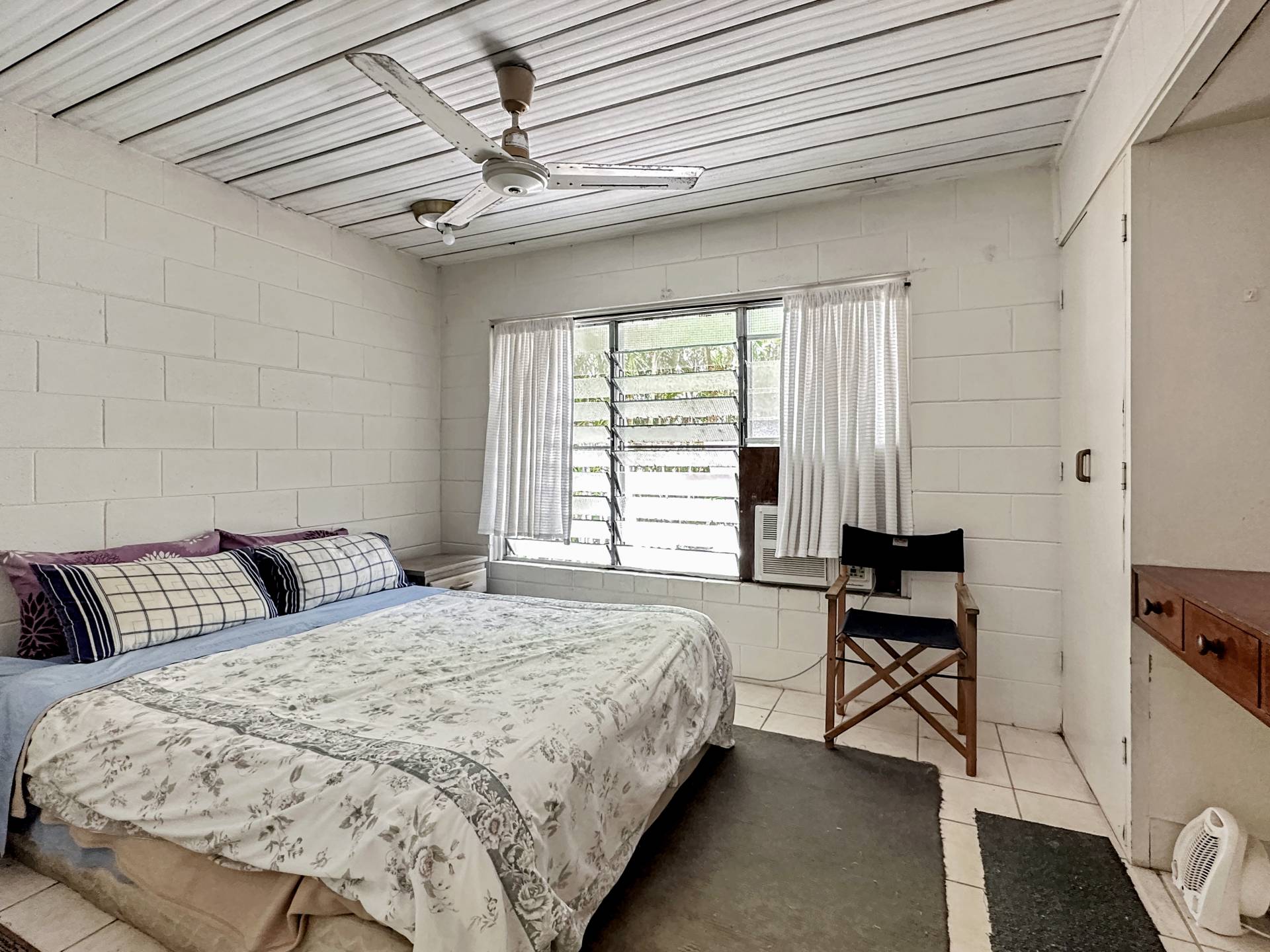 There are three undercover carports at the front of the property above which is unit 1 with stair access on both sides of the building. The small balcony at the front door enjoys a lovely view up to Hawkings Point. The living/dining/kitchen has a split system air con but is otherwise in need of an update, however, the current tenant has been happily living there for years and finds it perfectly comfortable! The bedroom is a good size and has a nice elevated view out over Picnic Bay through the louvre windows, with a box air con, ceiling fan and built-in-robe. The bathroom/laundry is in original condition and opens to the back steps and garden.
