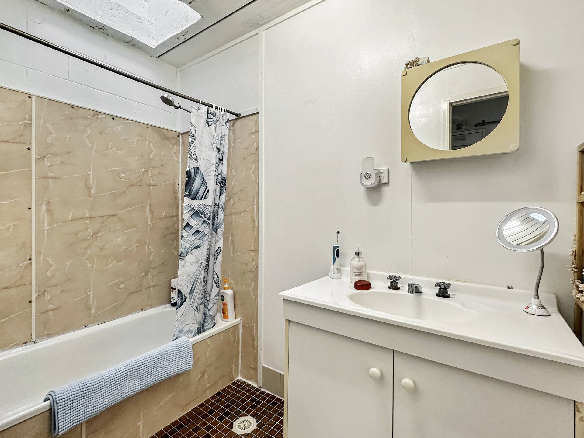 The middle unit 2 is a light and airy two bedroom unit with a pleasant courtyard garden on one side, also looking up to Hawkings Point, with rear access also from the kitchen/laundry. The living area has a modern split system air con and there's a box air con to one of the bedrooms, which both have big windows and built-in-wardrobes. The bathroom and separate toilet enjoy natural light from skylights, as with unit 3 also, with a shower over bathtub.