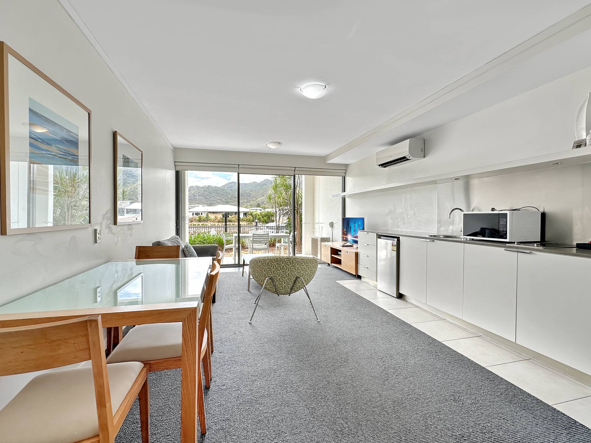 * The larger studio unit is comfortable for longer stays with a kitchenette, dining area, lounge, bathroom and laundry. Floor to ceiling glass doors open onto the balcony with its beautiful water views.