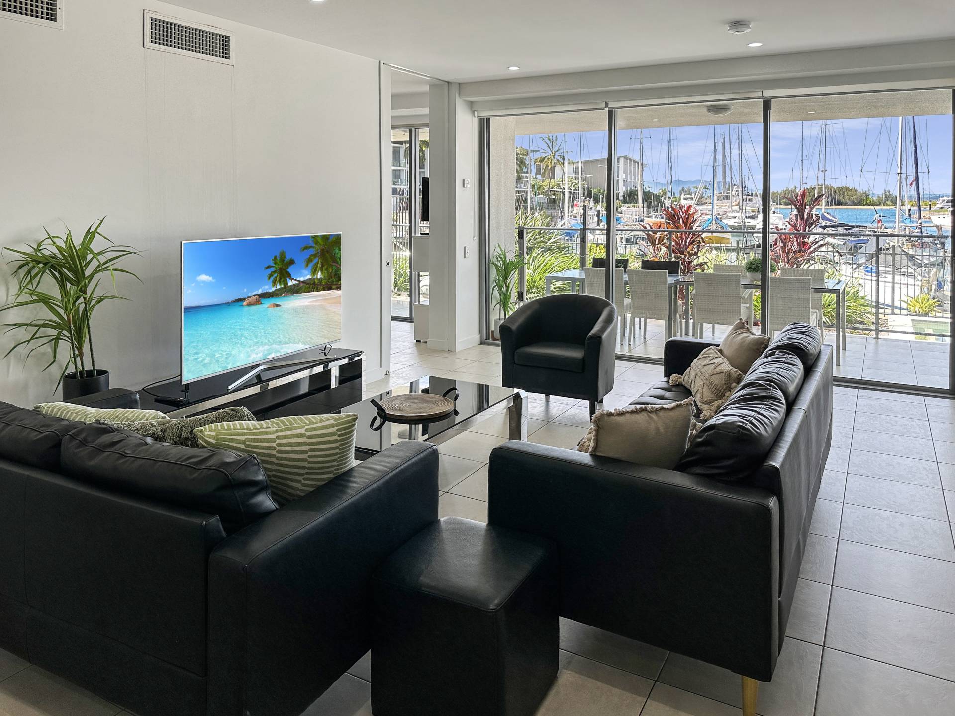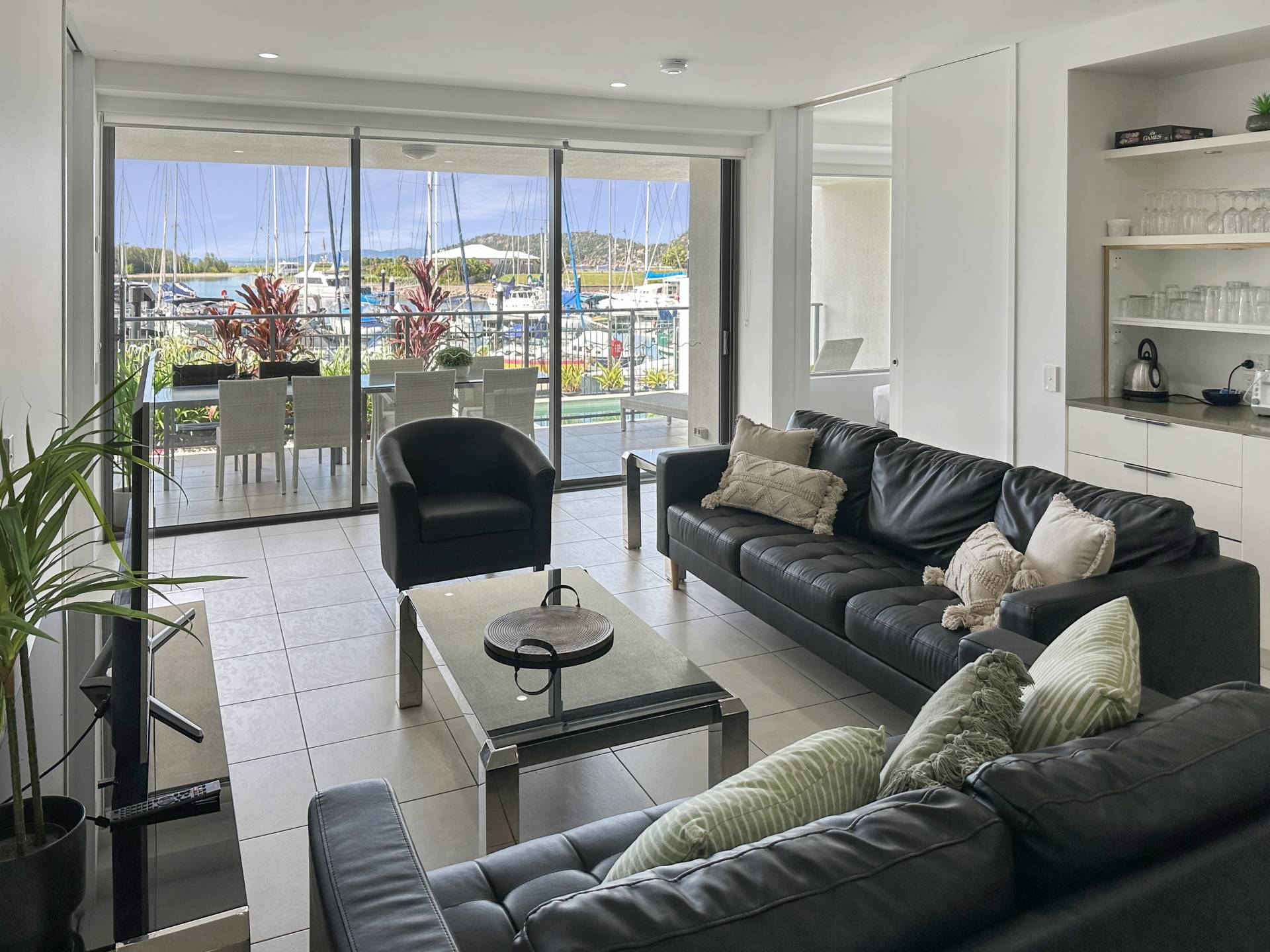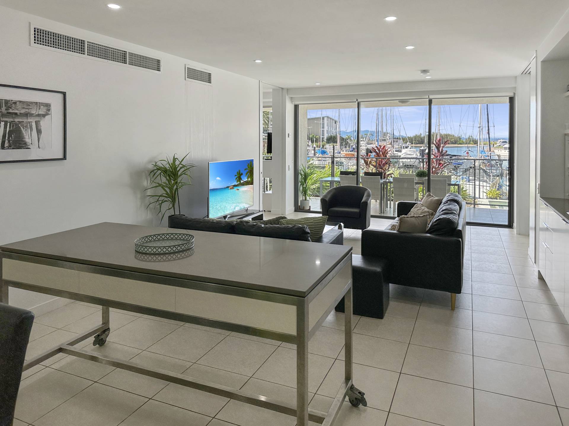 It is light and airy with floor to ceiling glass doors at each end of the open-plan living area, with the marina-front patio, pool and garden at one end, whilst at the other end the patio is well screened with shrubbery.