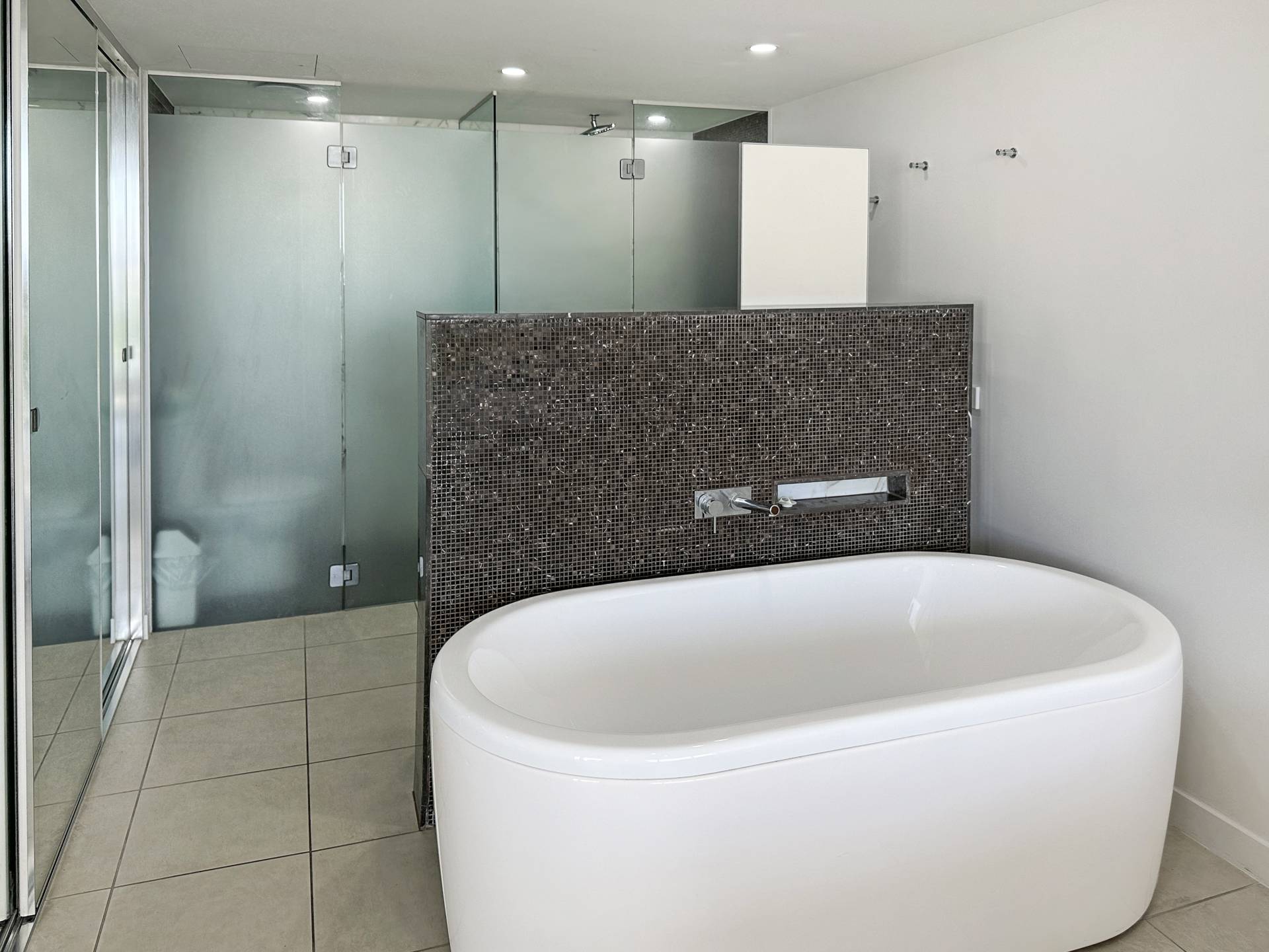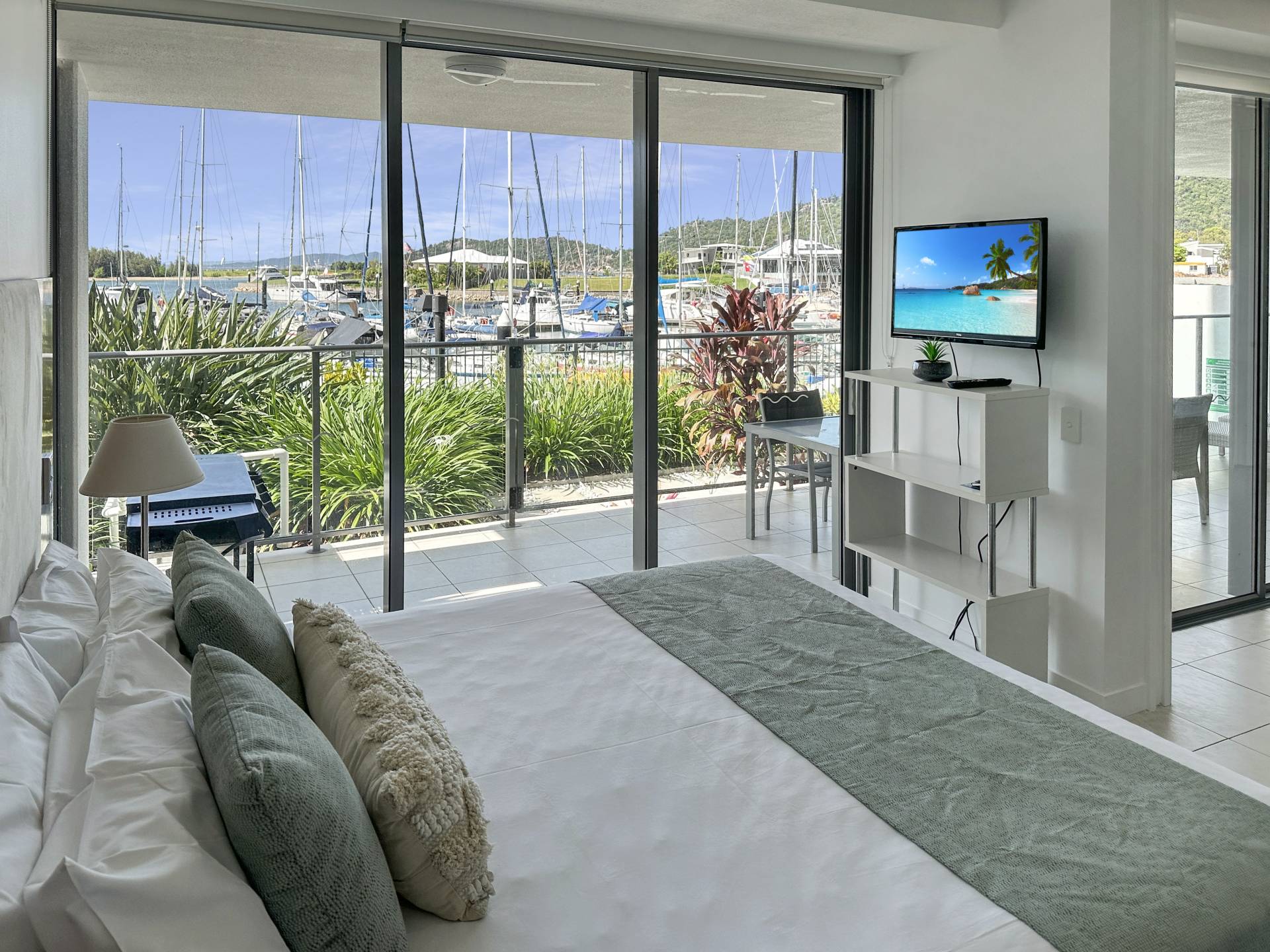 The master bedroom opens onto the patio with views over the plunge pool and garden to the yachts in the marina and mainland beyond. The ensuite bathroom is open-plan to allow views from the bath tub, whilst still providing for some privacy in the shower and toilet.