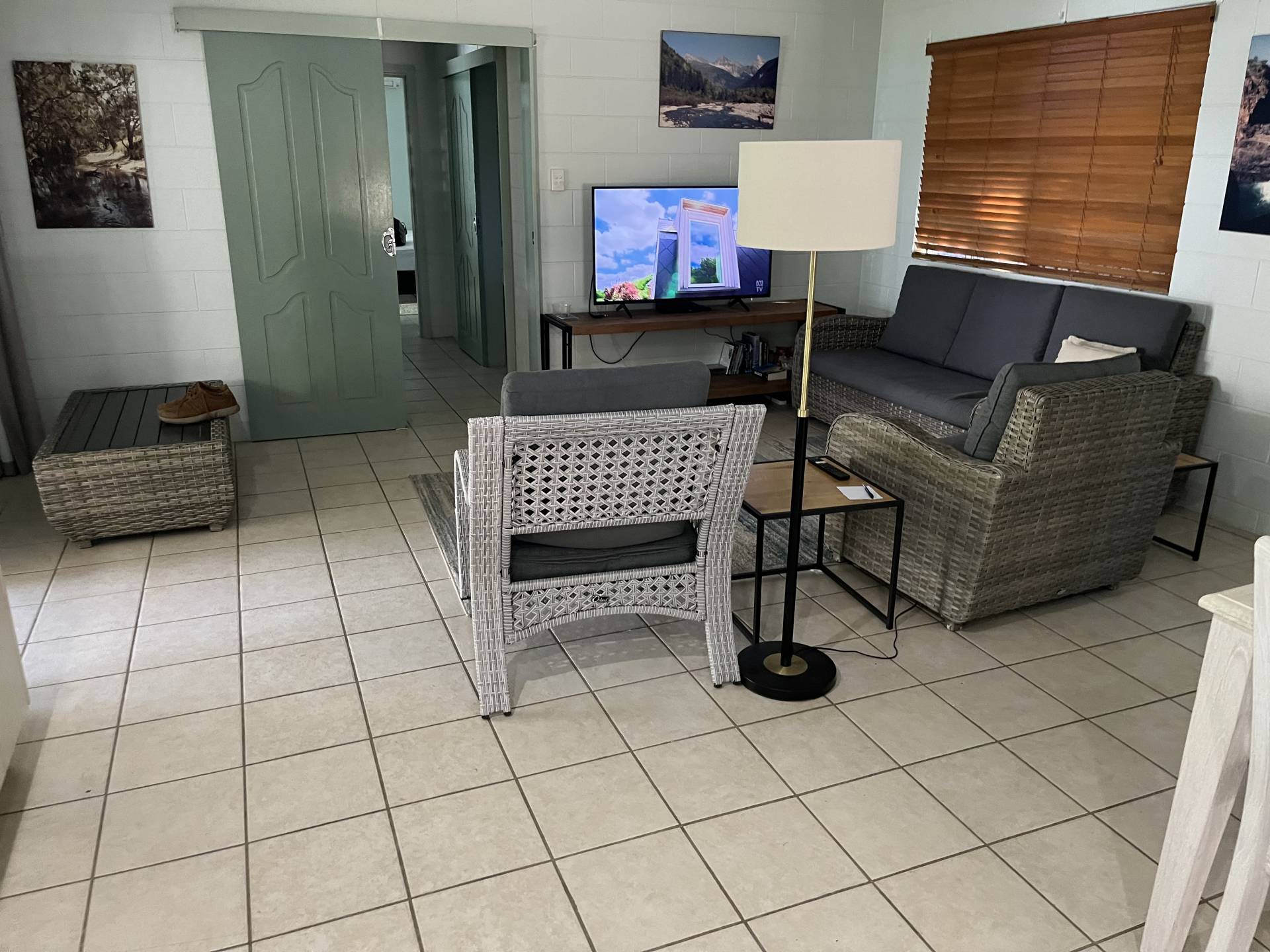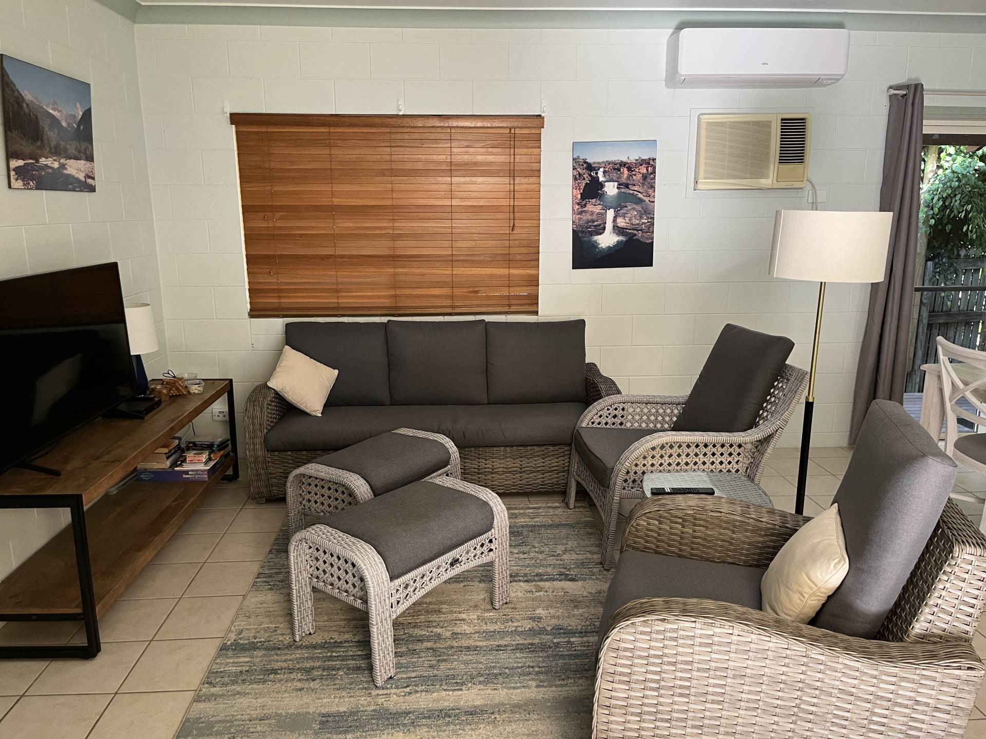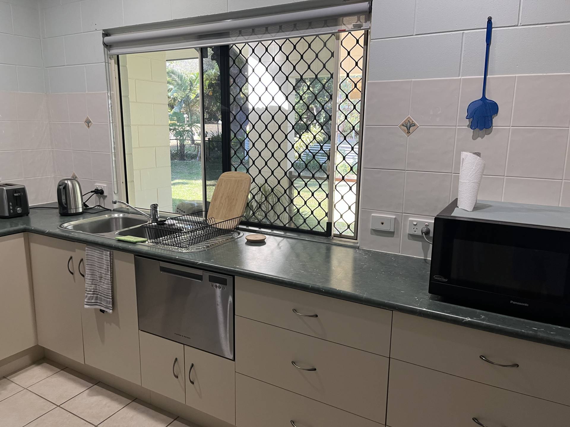 - Open-plan living area with well equipped kitchen (Includes gas cooktop, hob oven, fridge and microwave) with sliding glass doors onto the covered side verandah which overlooks the garden.