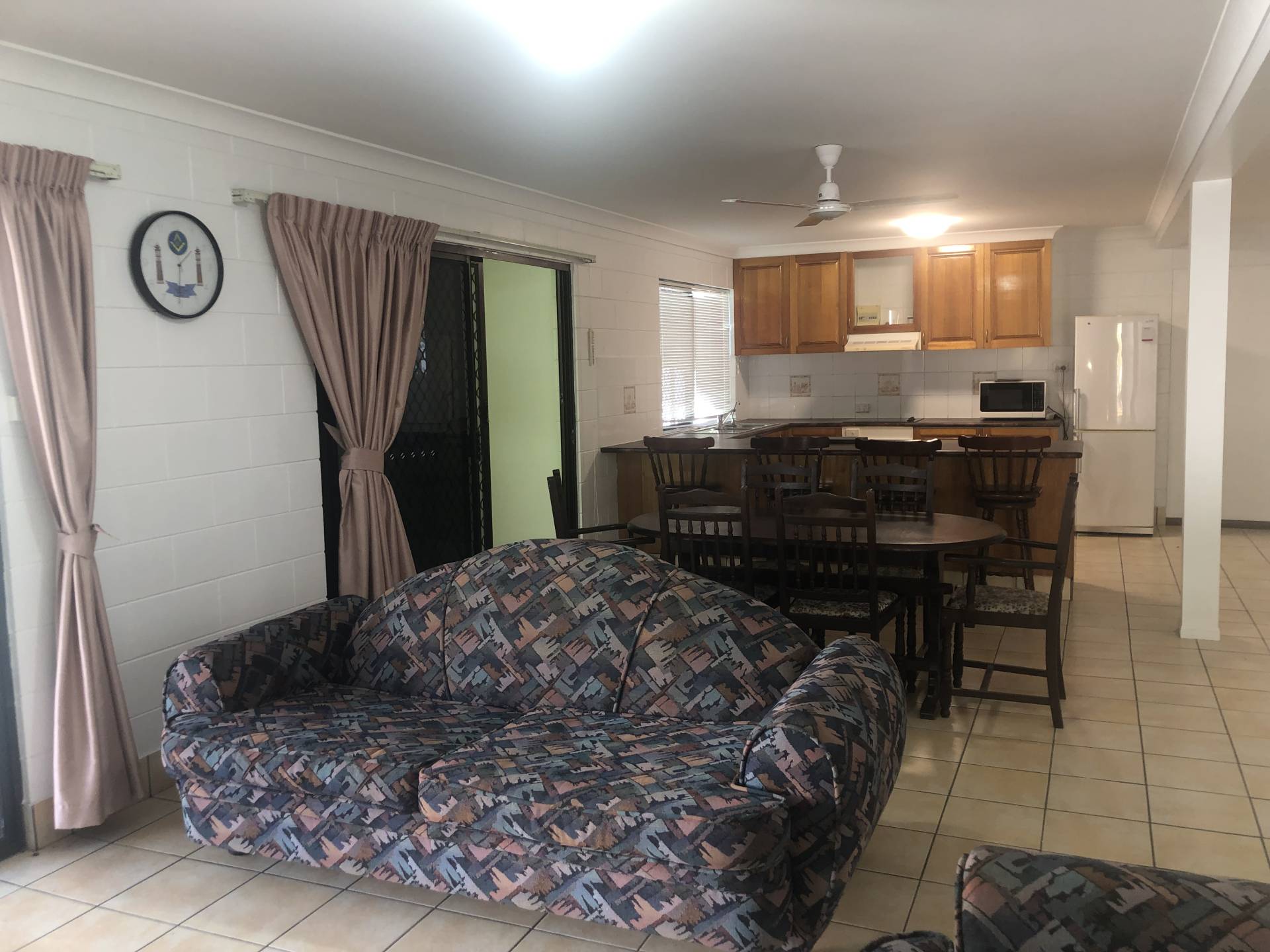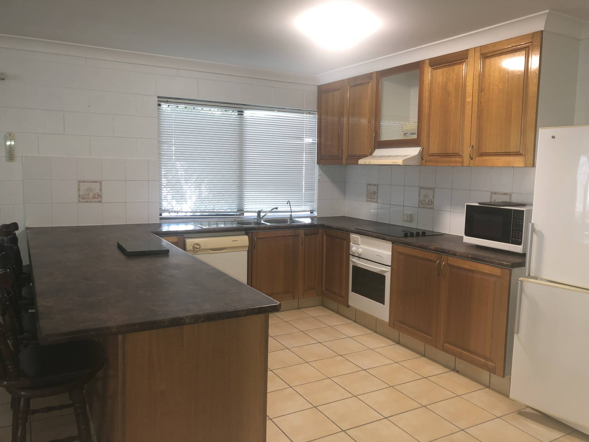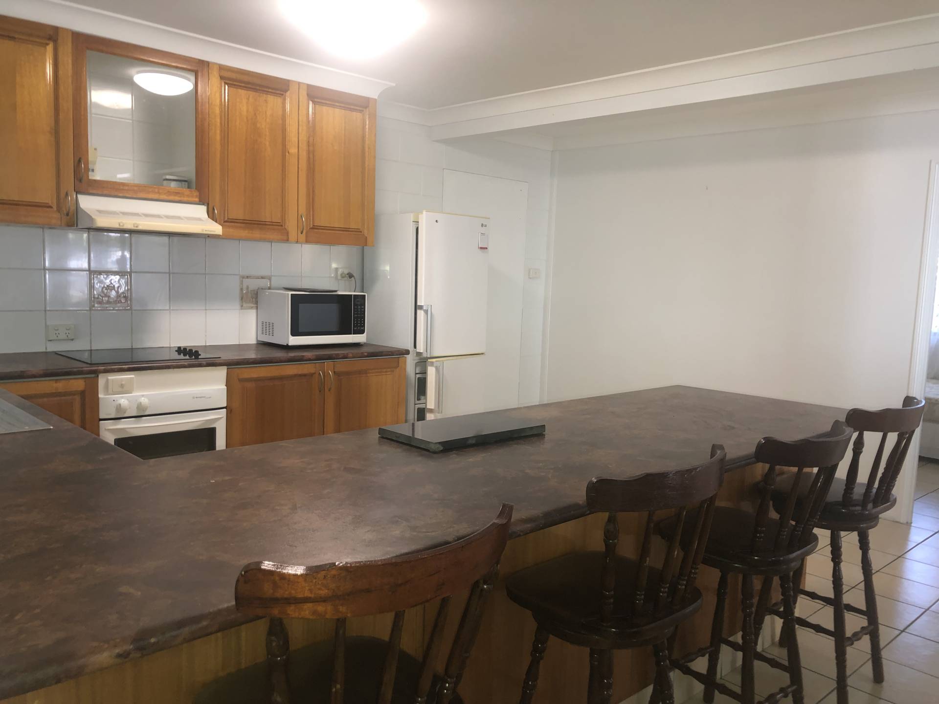 - Kitchen includes a microwave, cooktop, hob oven and fridge