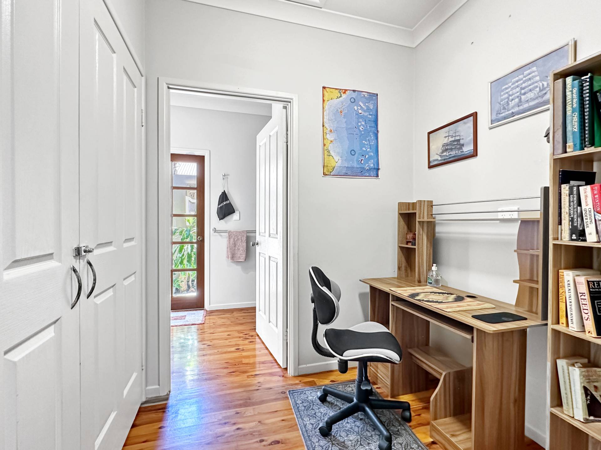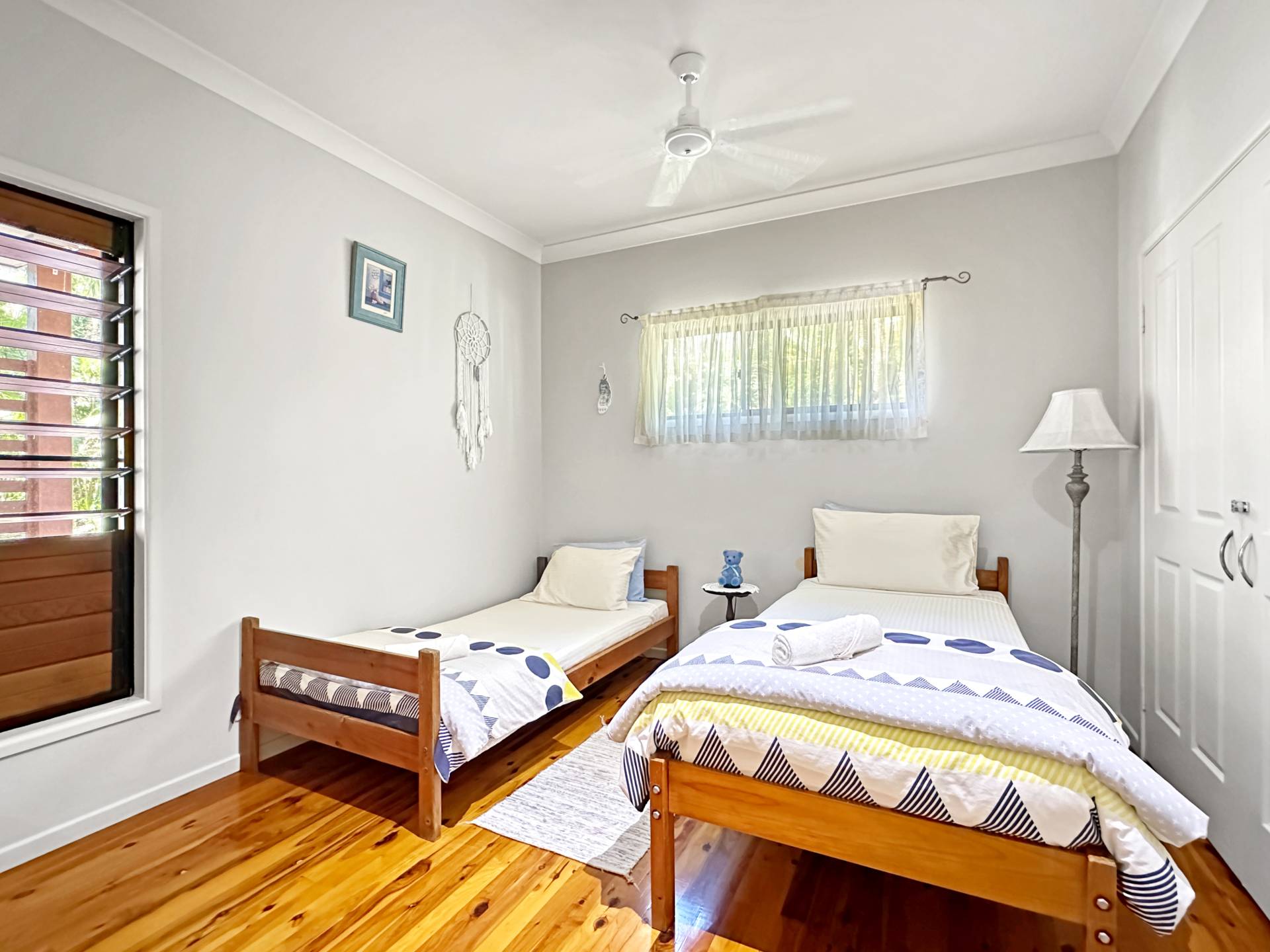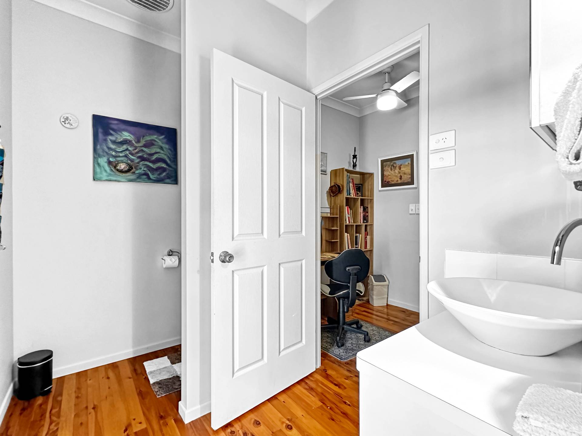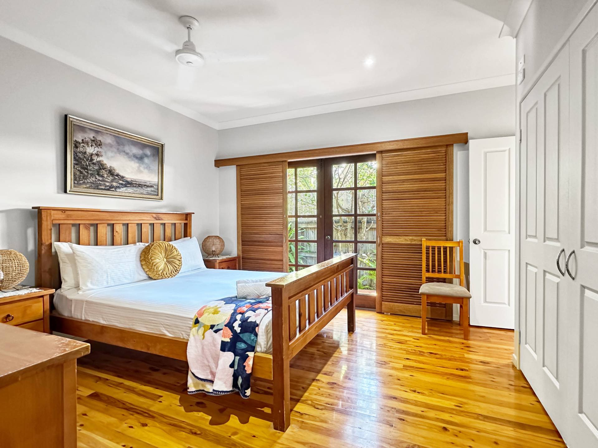 Both bedrooms open off the living area as does a study area with linen closet which leads through to the bathroom, with its unique private outdoor shower. The master bedroom has two-way access to the bathroom and opens onto a small juliette balcony through french doors. Both bedrooms and the living area are air-conditioned with split systems and also have ceiling fans.