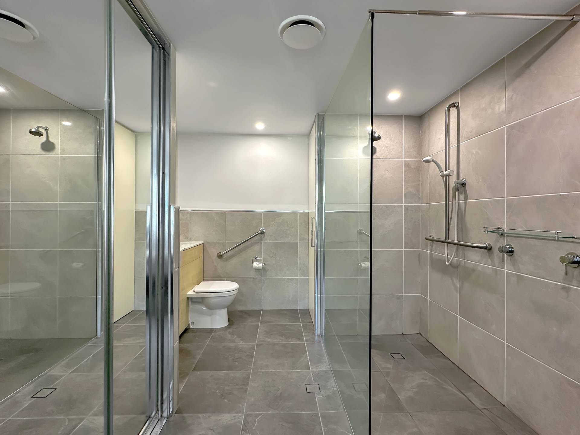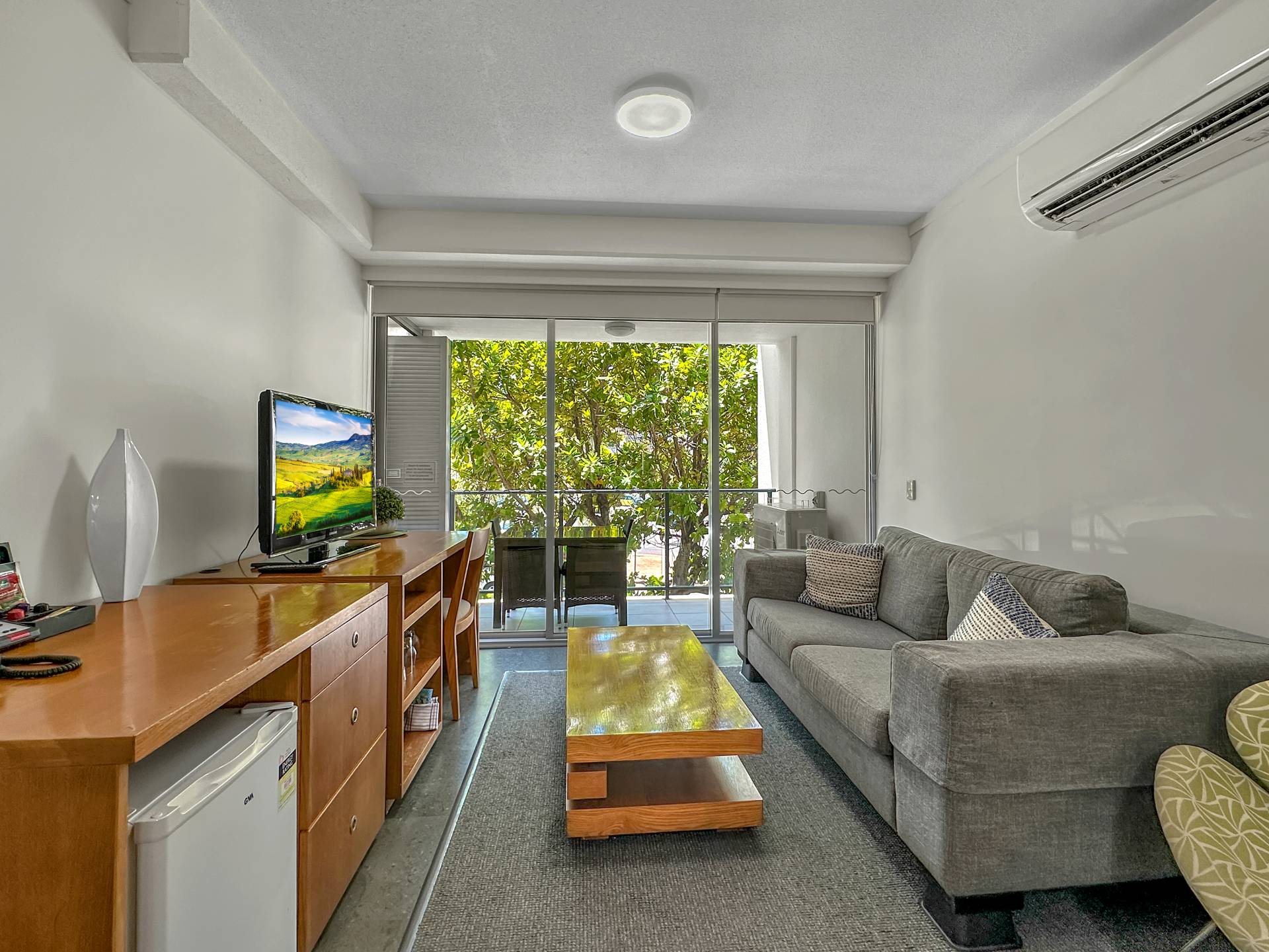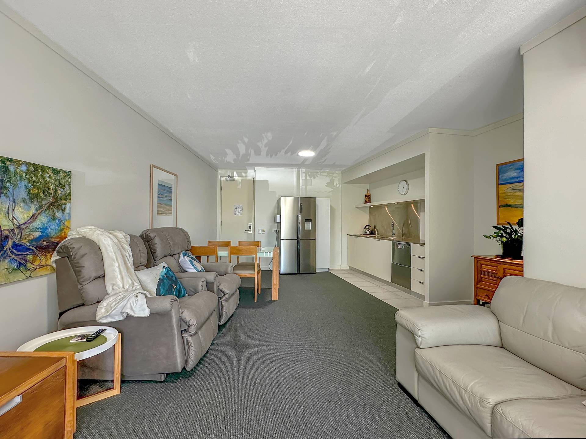 The one bedroom apartment offers a private bedroom with newly renovated ensuite bathroom featuring accessible walk-in shower and smart vanity with granite benchtop. The living area is spacious with kitchen, dining area and lounge area, opening through large floor to ceiling glass doors onto the generous covered verandah, from which limited water views can be seen.