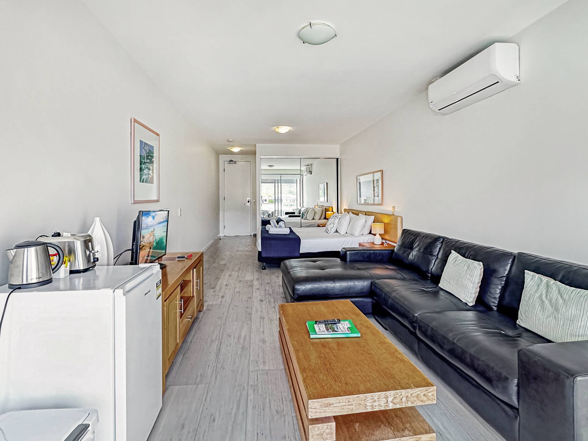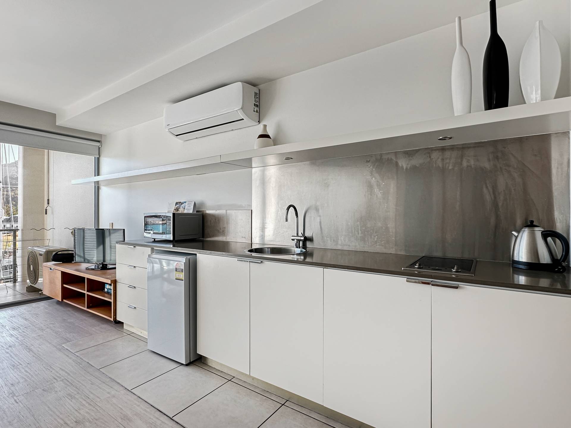 There are two rooms to the apartment - one side is a hotel room comprising bedroom with sofa, TV, tea & coffee making facilities, bathroom and balcony. The other side is larger and more suitable for longer stays as it also contains a kitchenette, dining table, washing machine and larger balcony.
