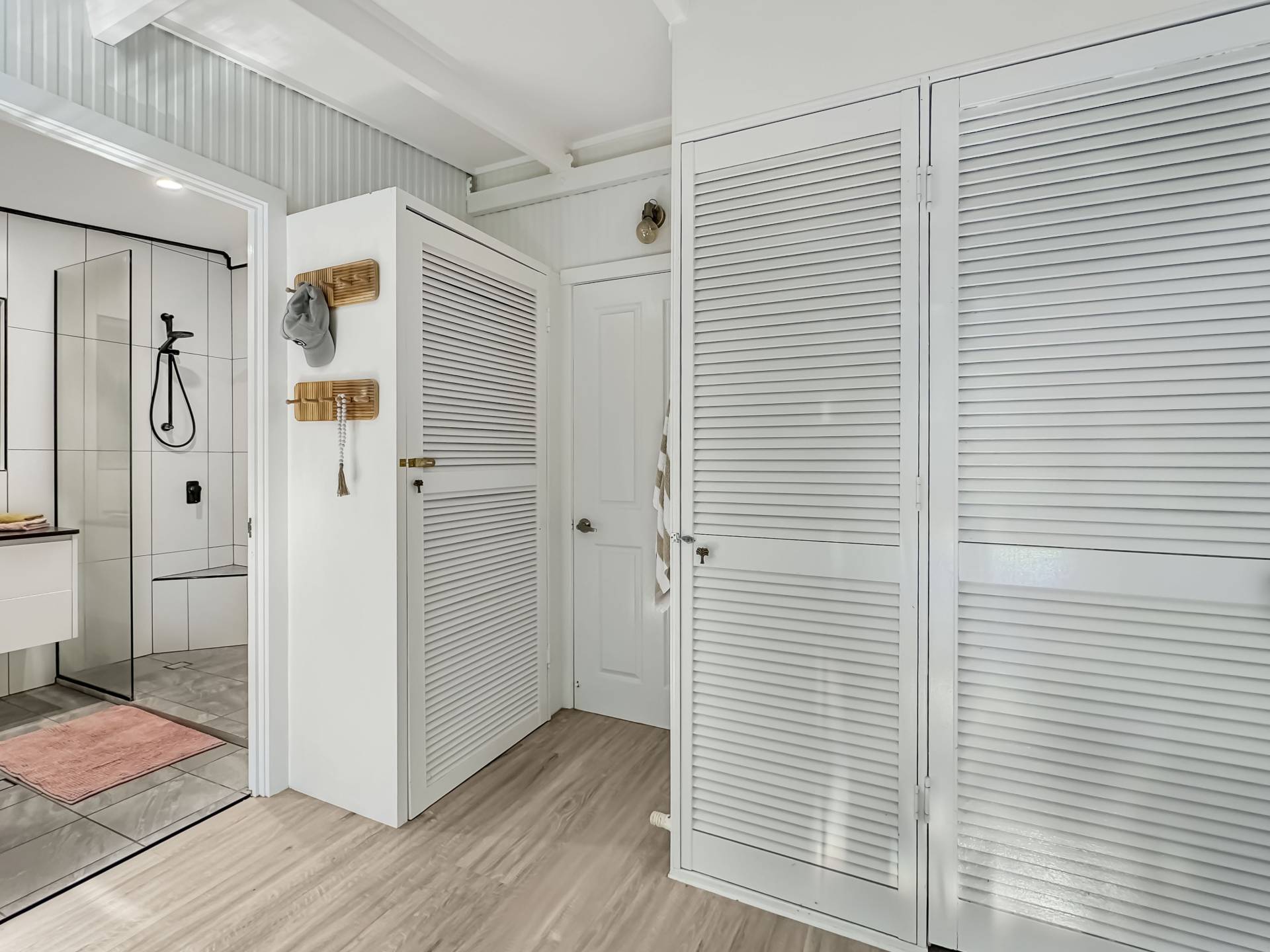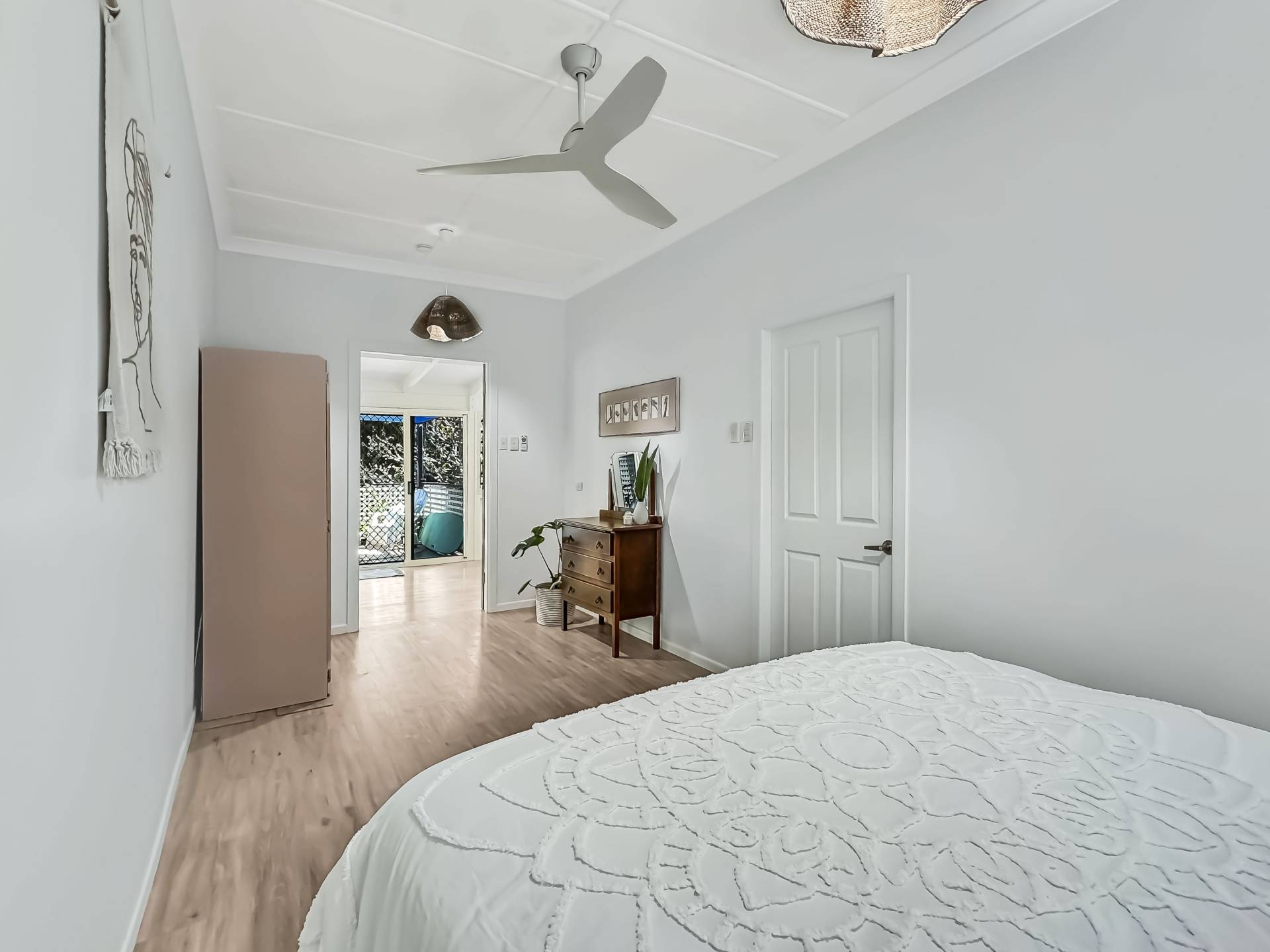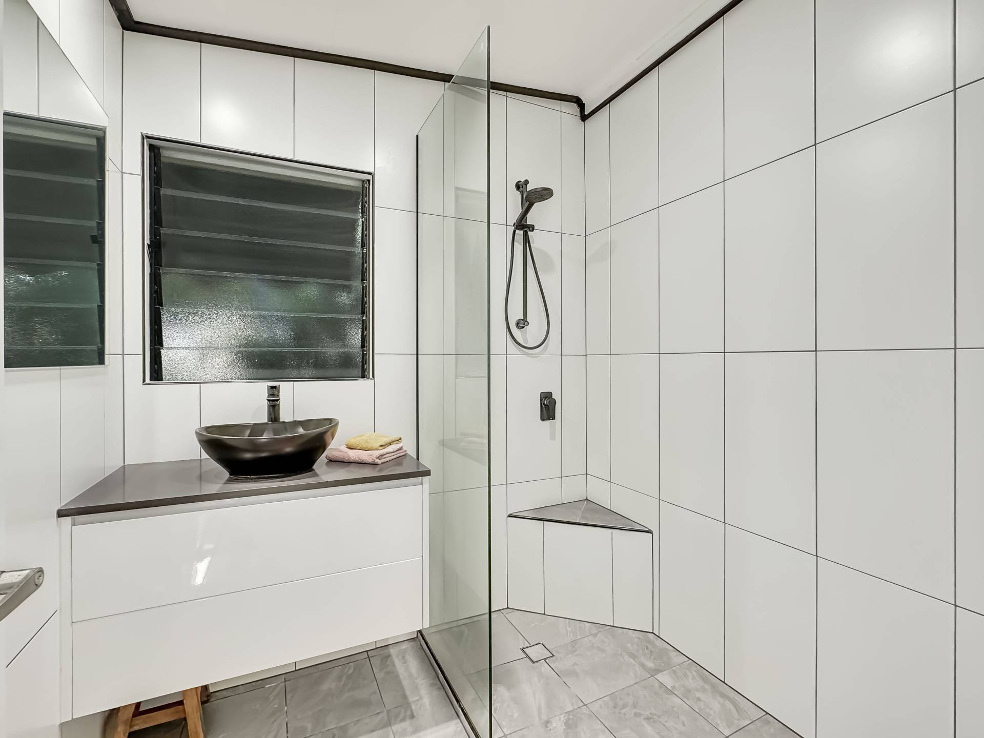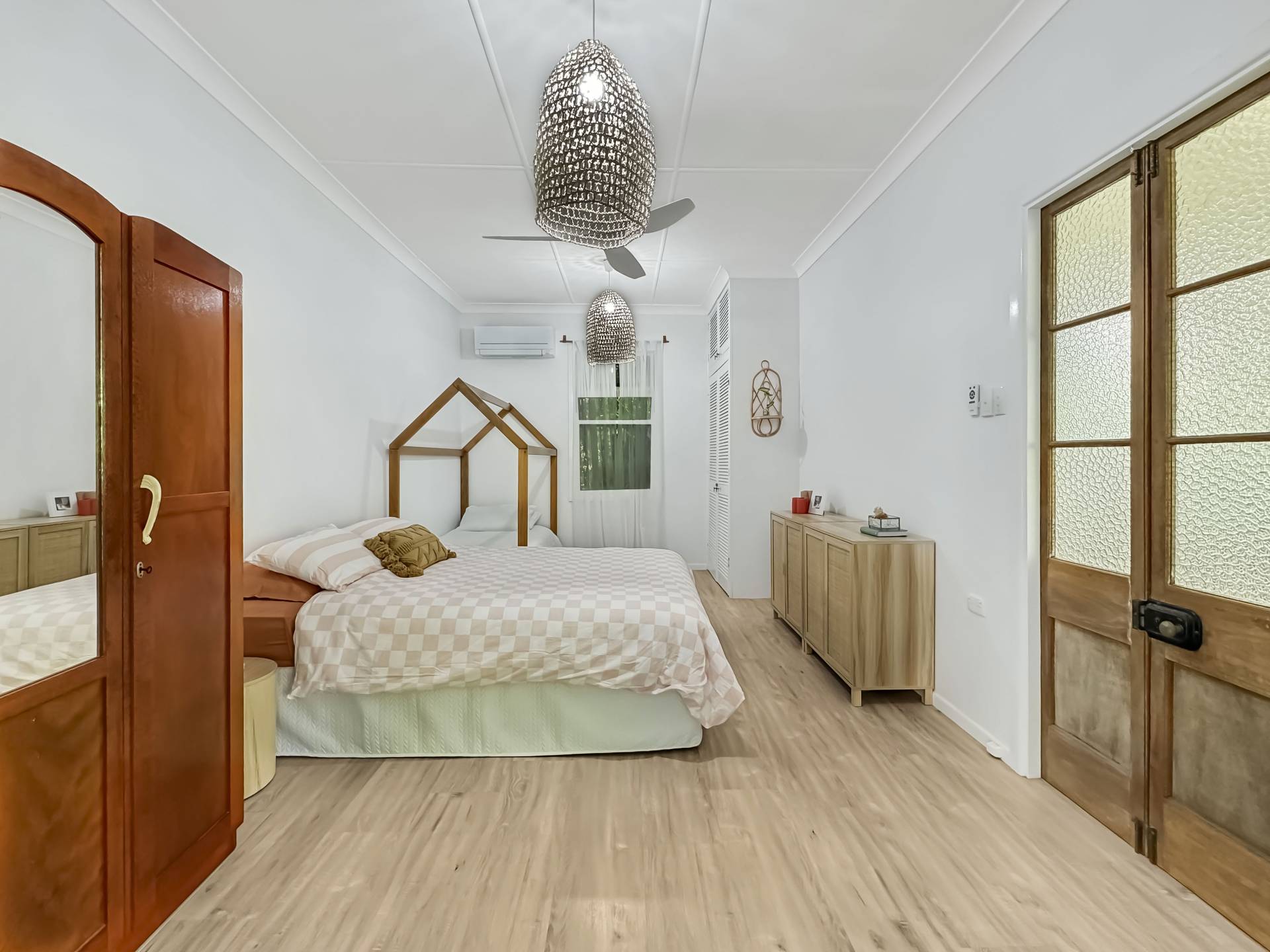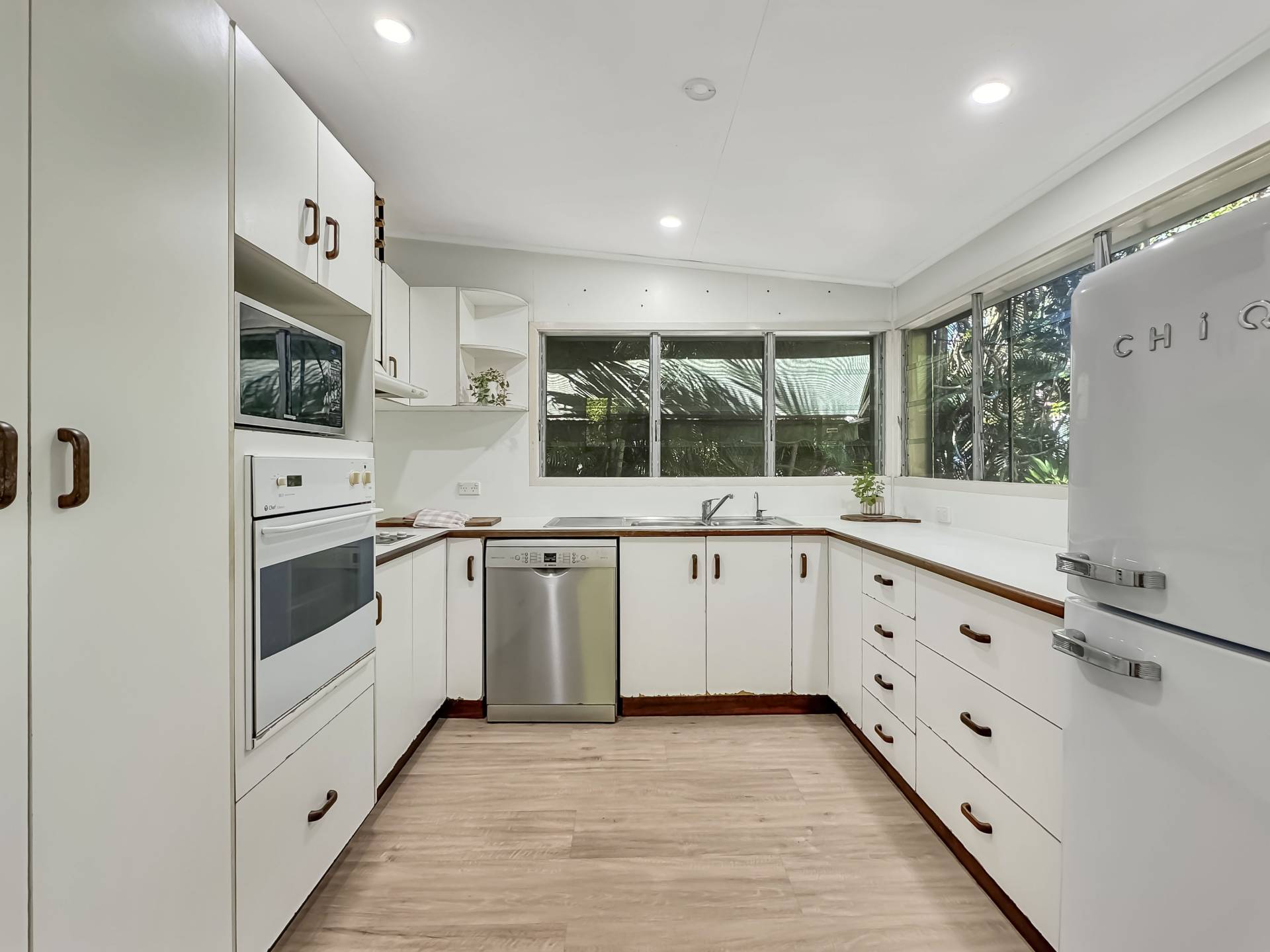 The two very spacious bedrooms open onto the living area through French doors, each of which have split system air conditioning. The bathroom has been stylishly renovated with an easy-access shower, vanity and separate toilet adjacent and the laundry is out of view in a large cupboard with additional linen and broom closets.