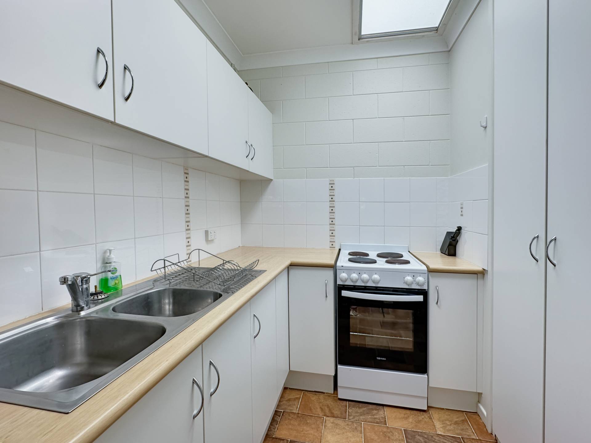 The living area is spacious, open-plan and air-conditioned and the kitchen is well lit with a skylight. The two bedrooms both feature built-in wardrobes and air con.