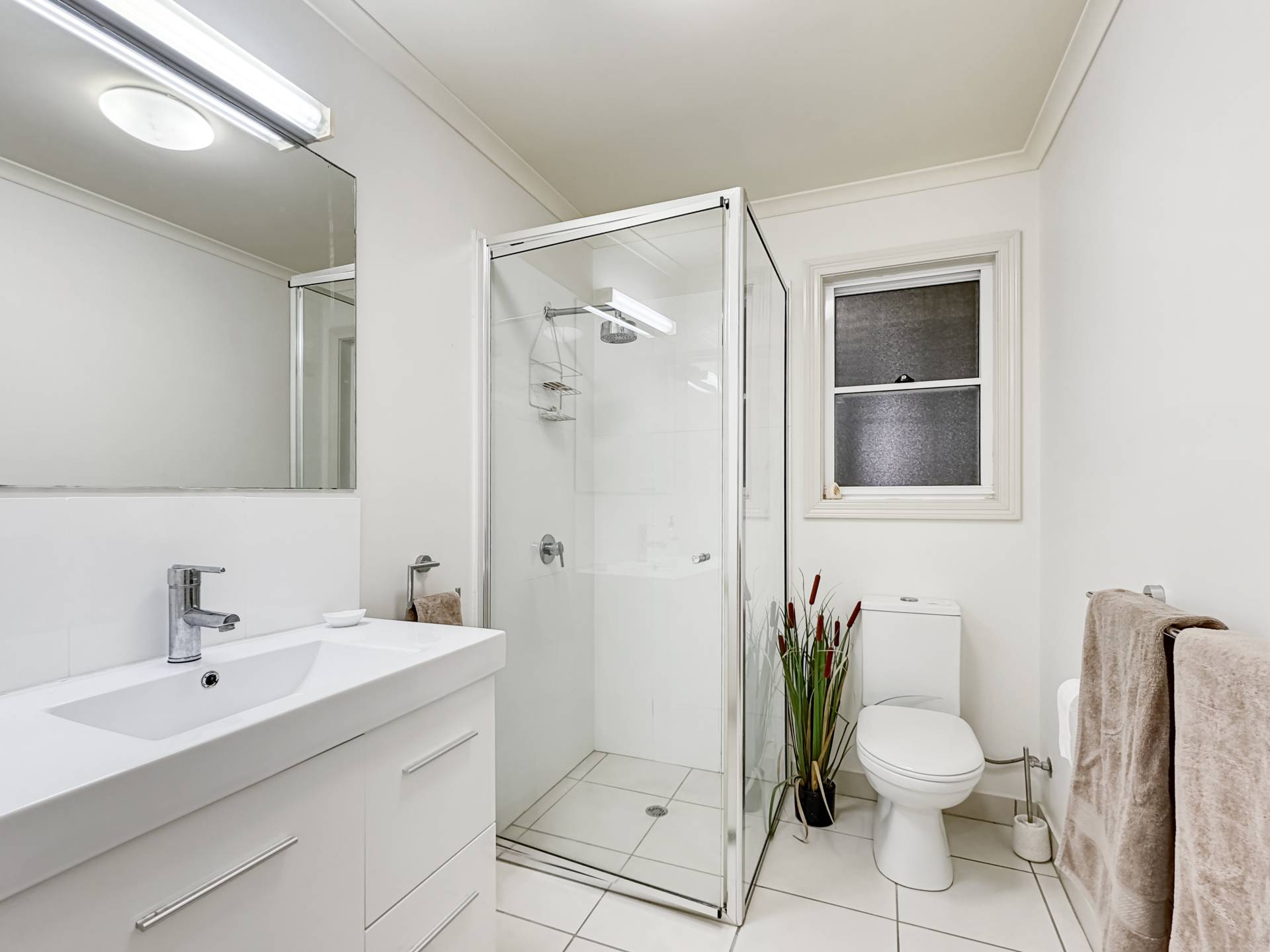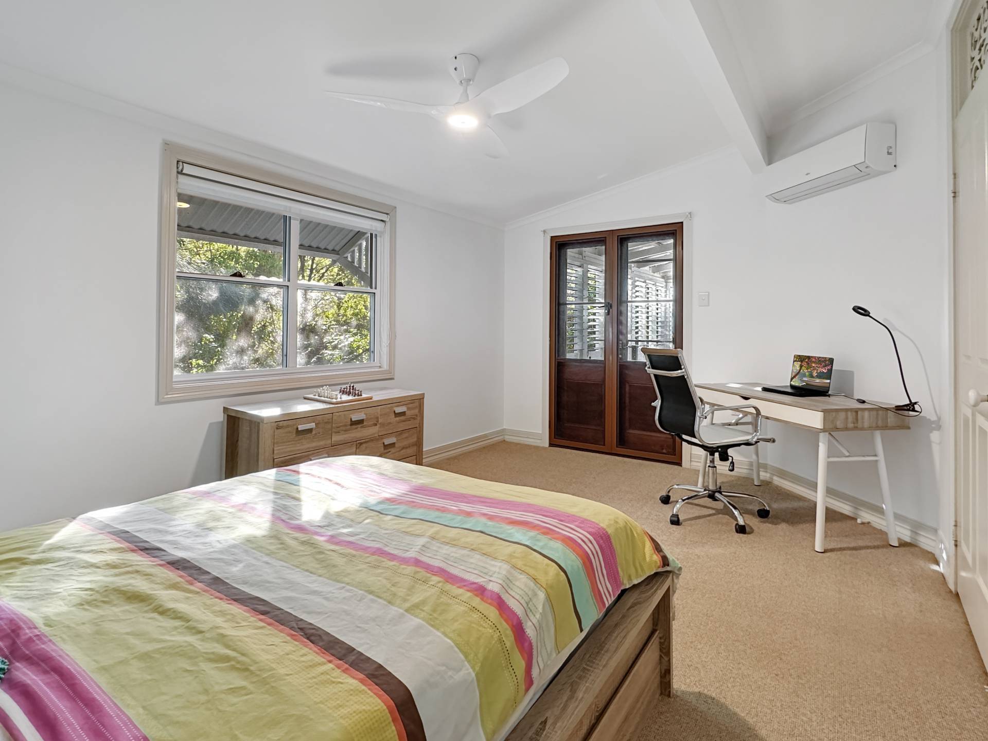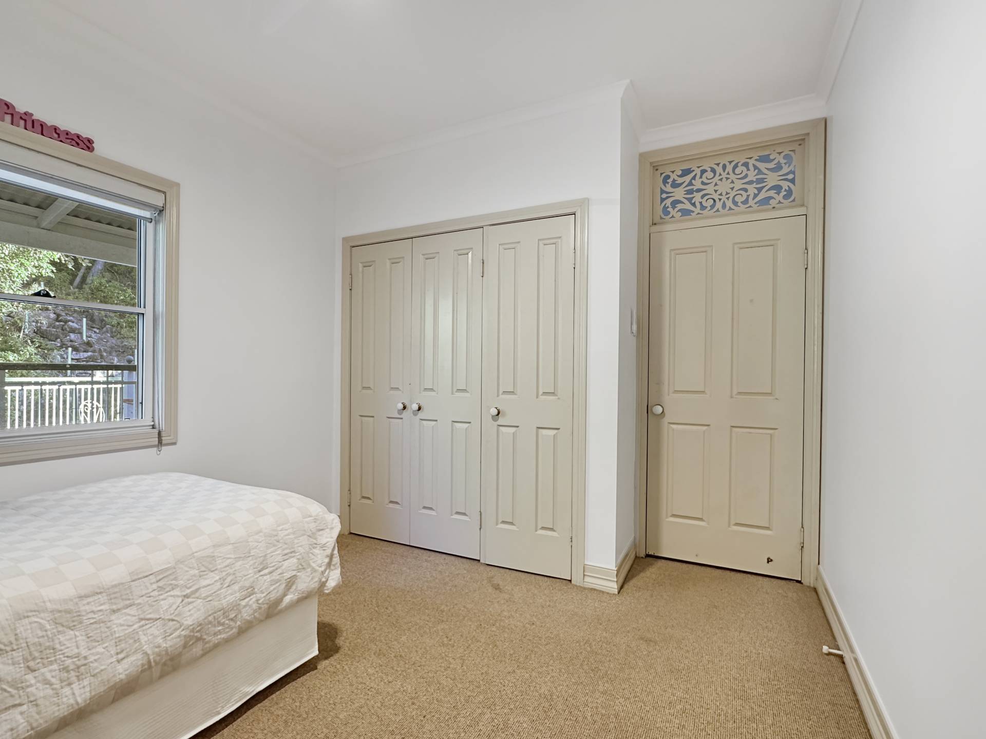 Internal hardwood stairs descend from the main living area to the downstairs laundry/storeroom, off which is the granny flat's living area with full kitchen and opening onto the front garden through sliding glass doors. A hallway leads to a bathroom with shower, vanity and toilet, and the fourth bedroom, which is again large by most people's standards, with built-in-wardrobes.