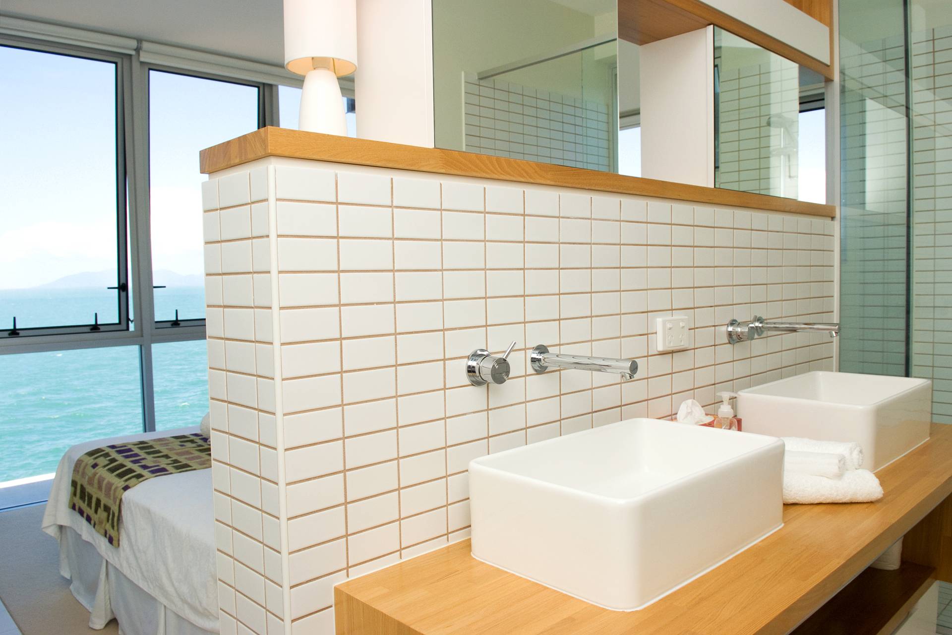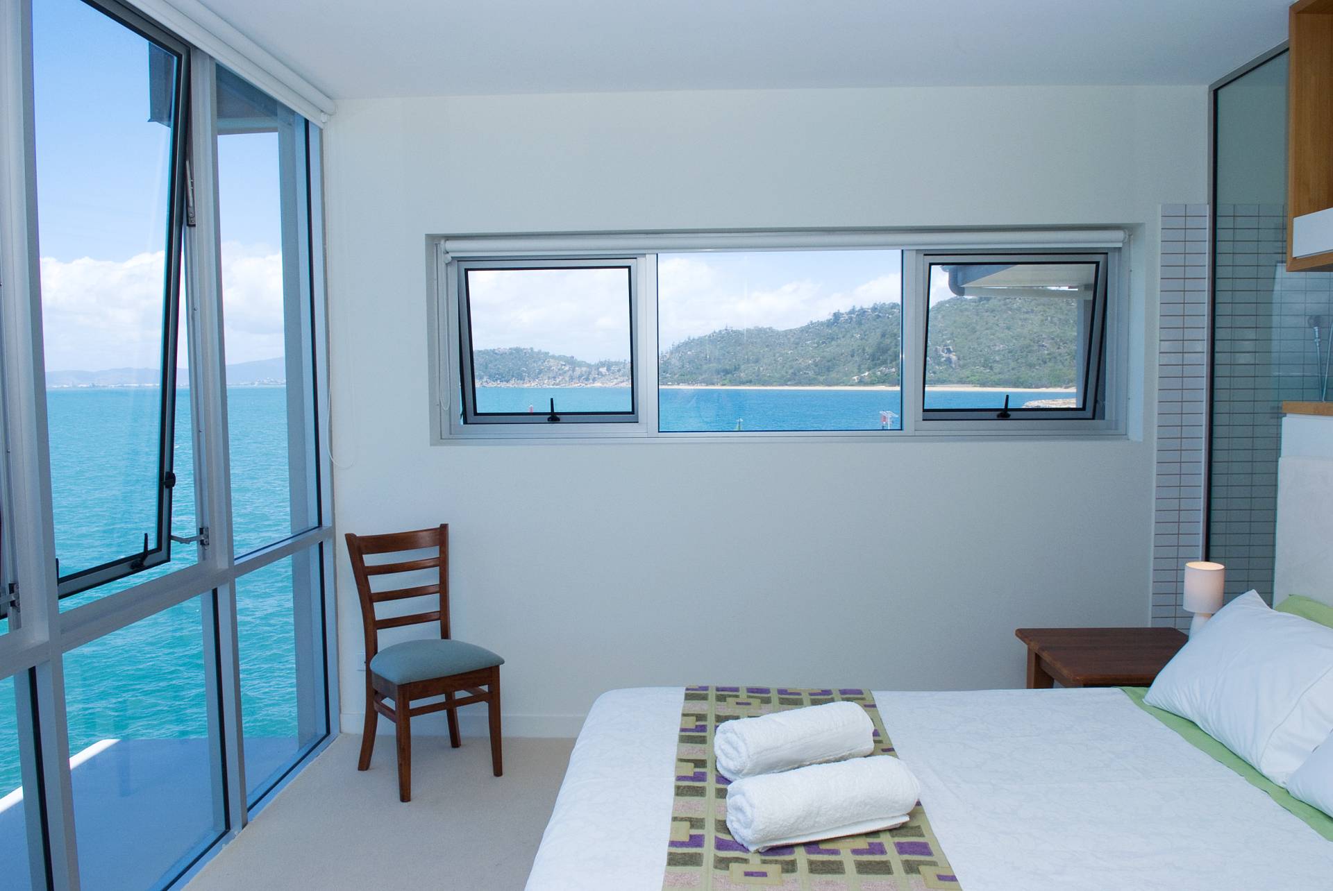 The master bedroom features an ensuite shower and bath that both drink in the view.