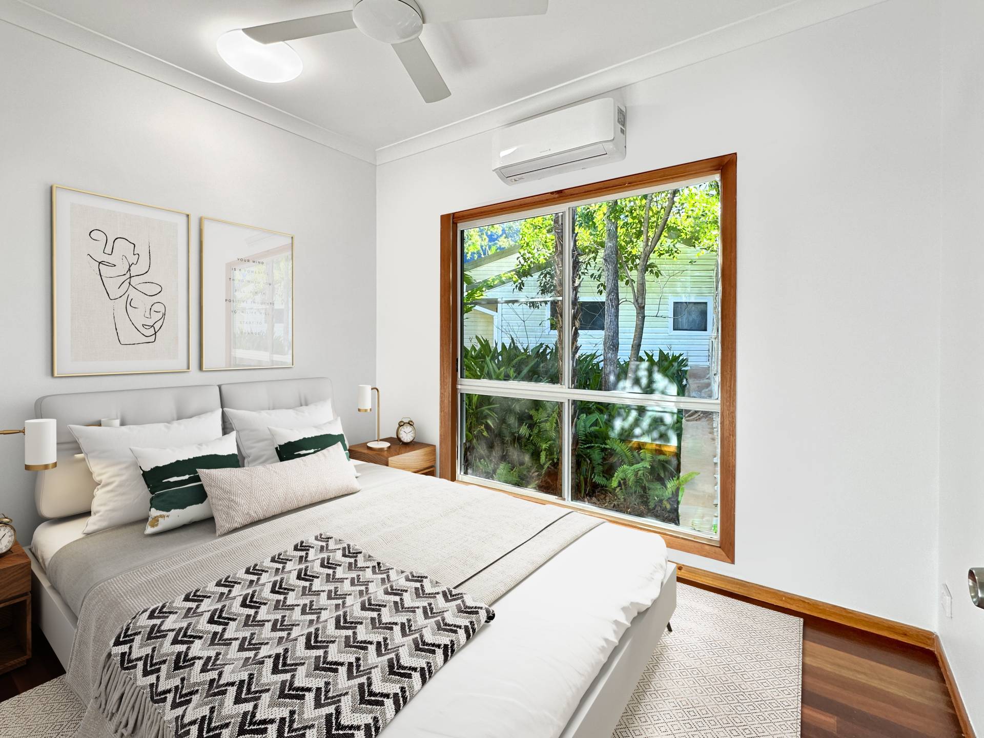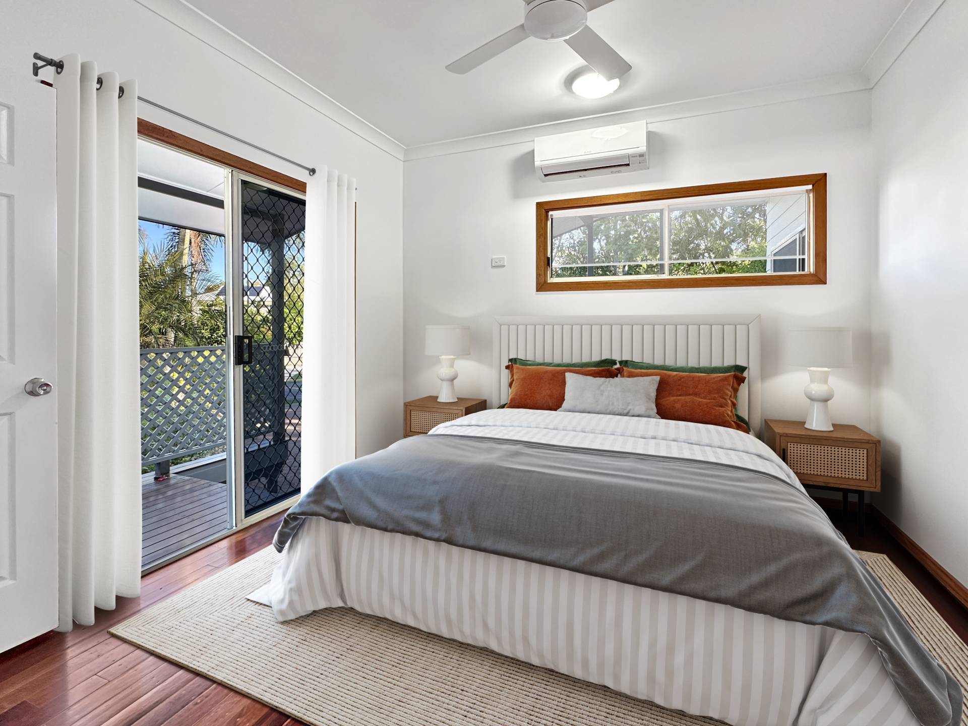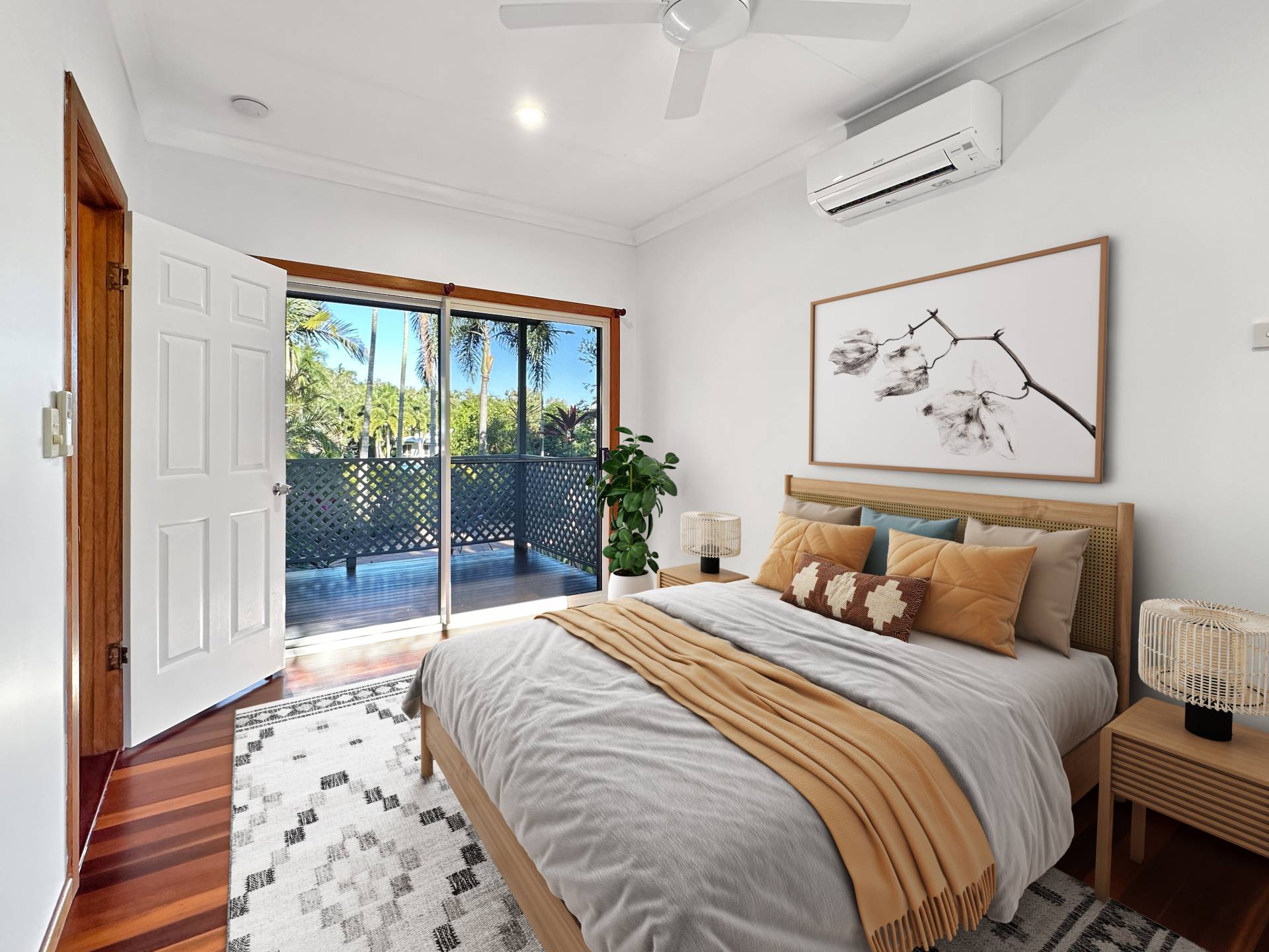 The master bedroom has an ensuite bathroom (shower, toilet, vanity) and built-in wardrobe and opens onto the front deck through sliding glass doors. Down the hallway from the living area is the family bathroom (shower over bath, toilet & vanity), linen closet and another large wardrobe, and two further bedrooms, with one opening onto its own private deck. Fully air-conditioned and with ceiling fans throughout, this home is comfortable in every season.