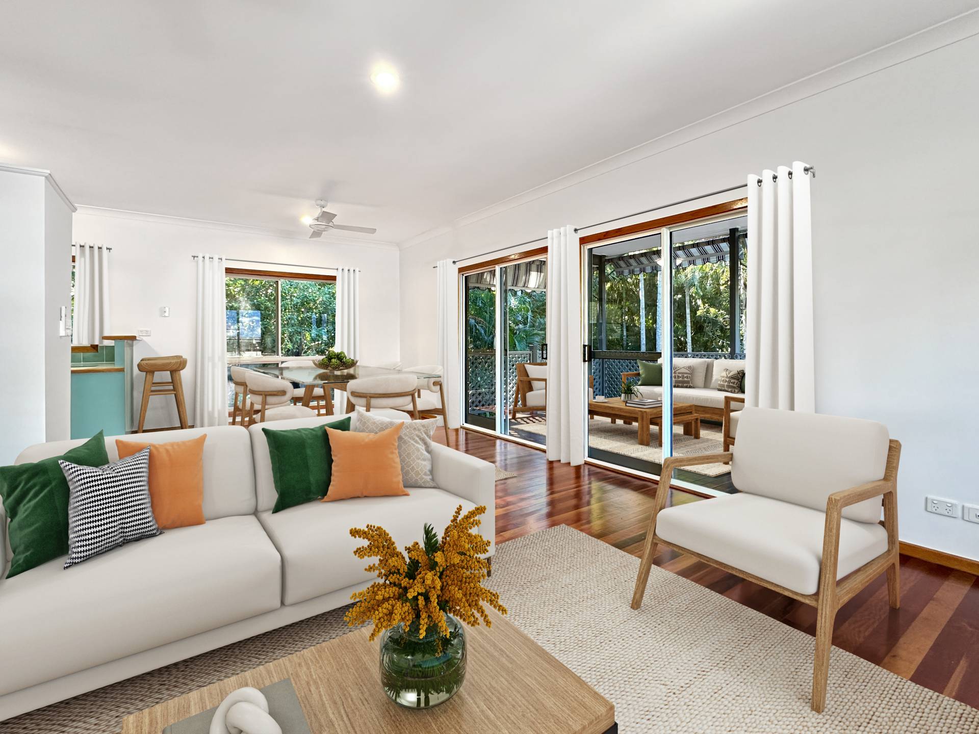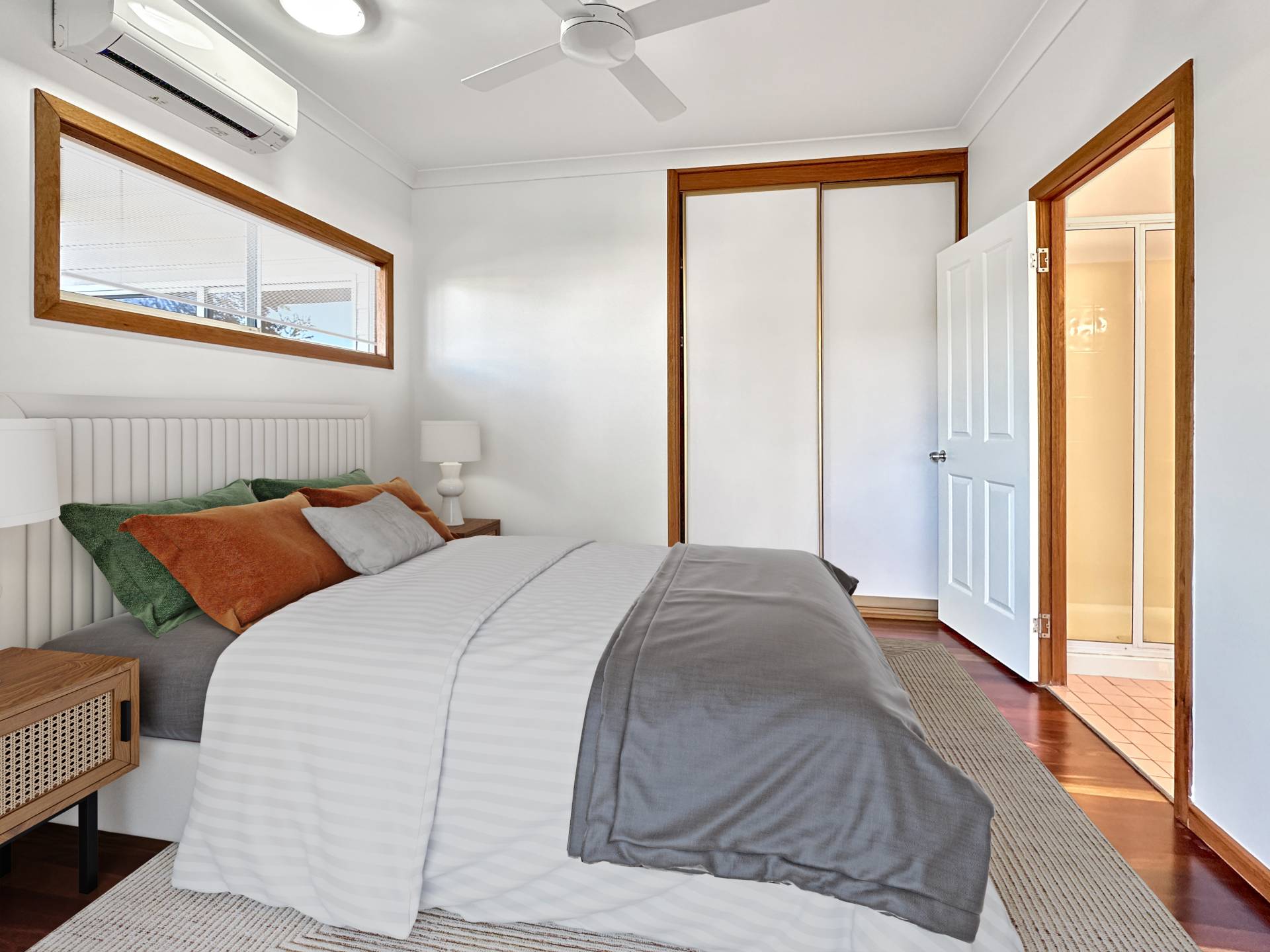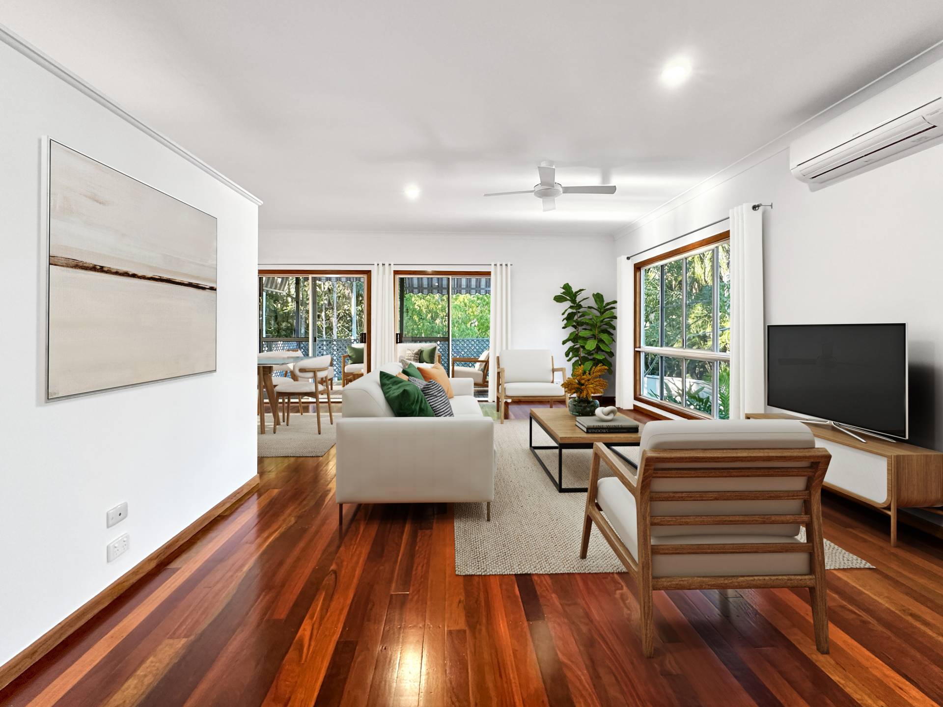 The master bedroom has an ensuite bathroom (shower, toilet, vanity) and built-in wardrobe and opens onto the front deck through sliding glass doors. Down the hallway from the living area is the family bathroom (shower over bath, toilet & vanity), linen closet and another large wardrobe, and two further bedrooms, with one opening onto its own private deck. Fully air-conditioned and with ceiling fans throughout, this home is comfortable in every season.