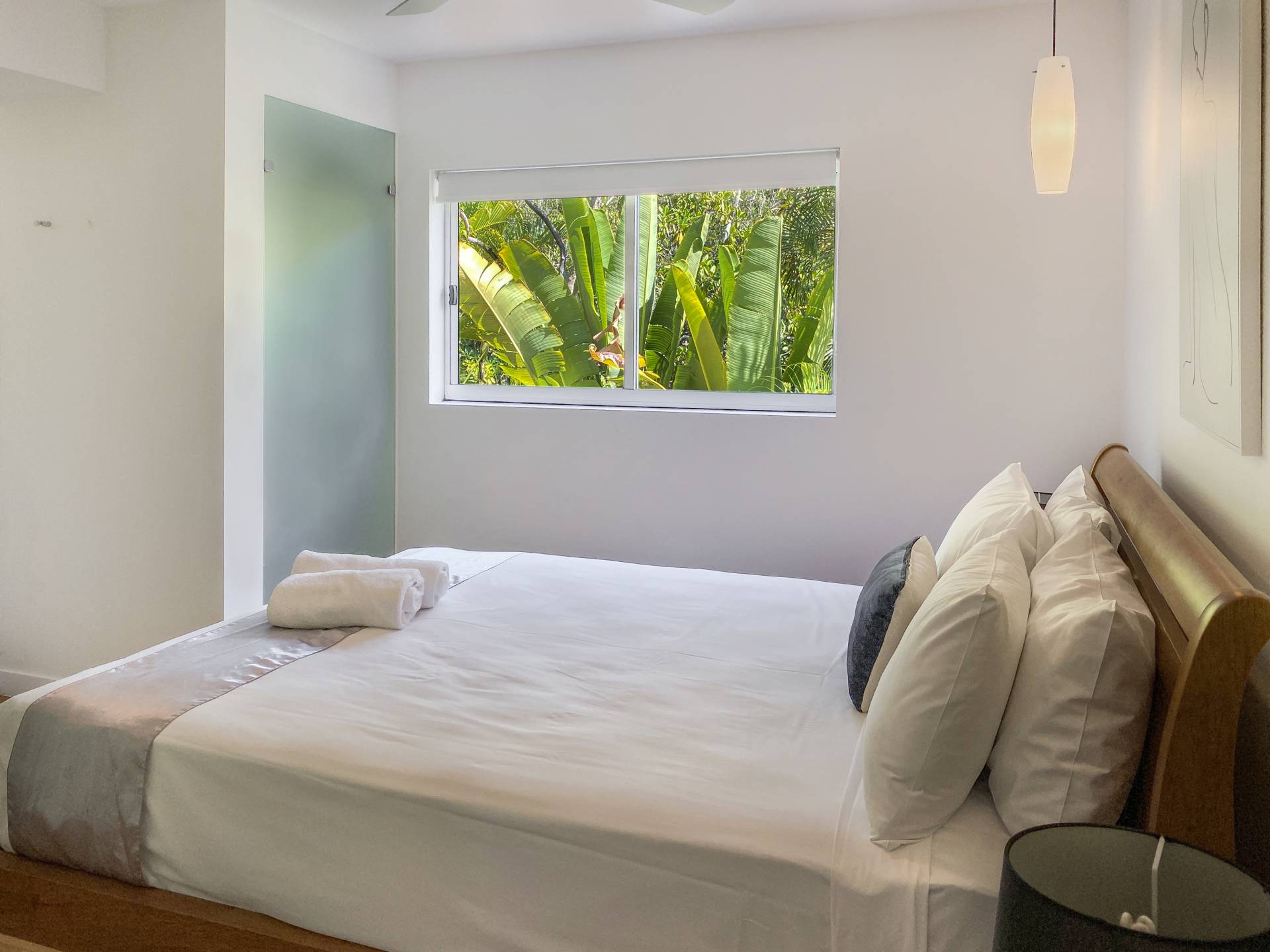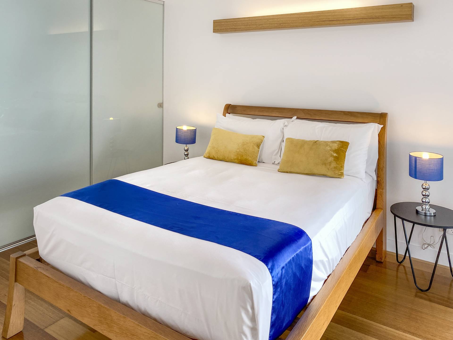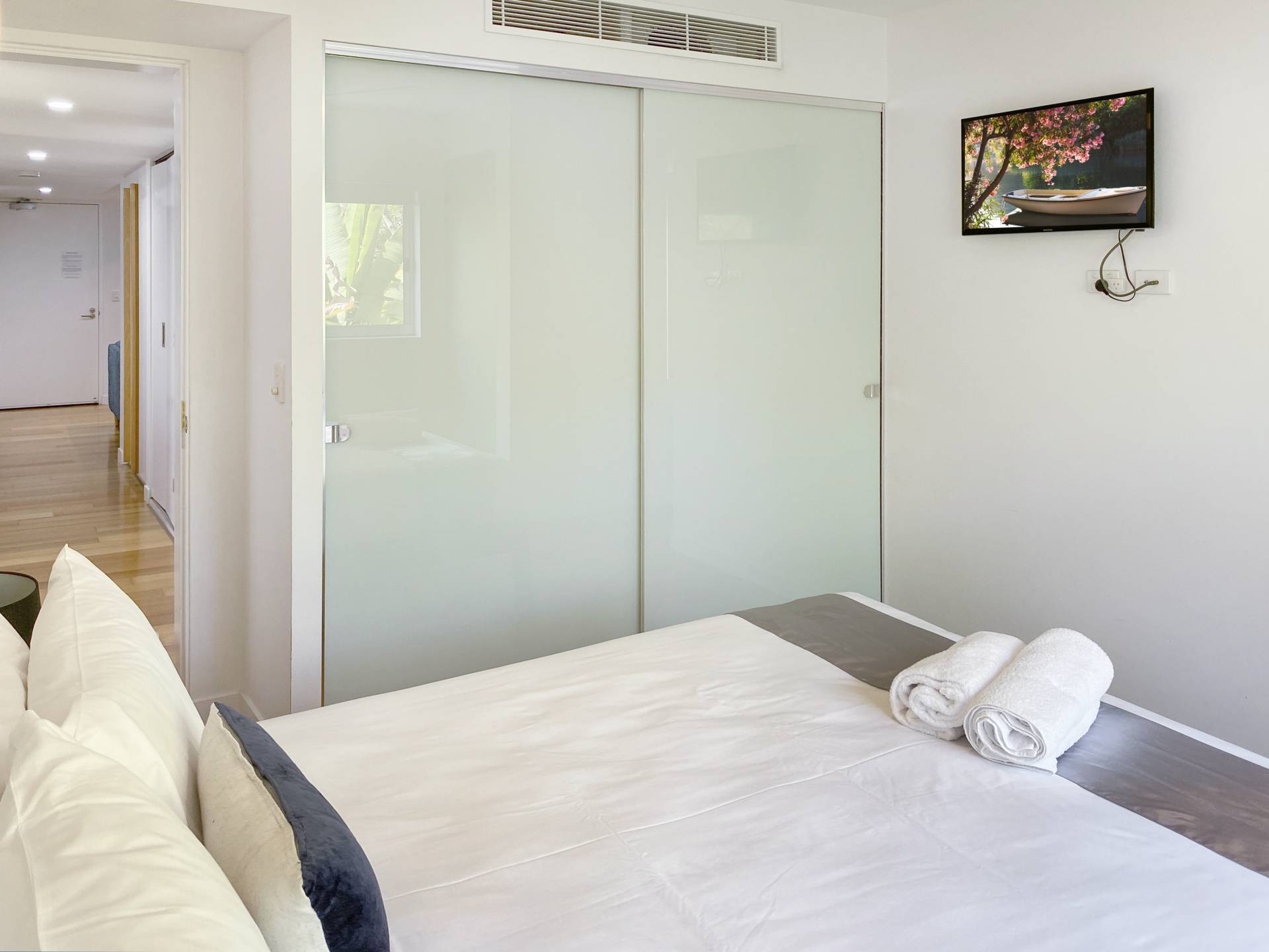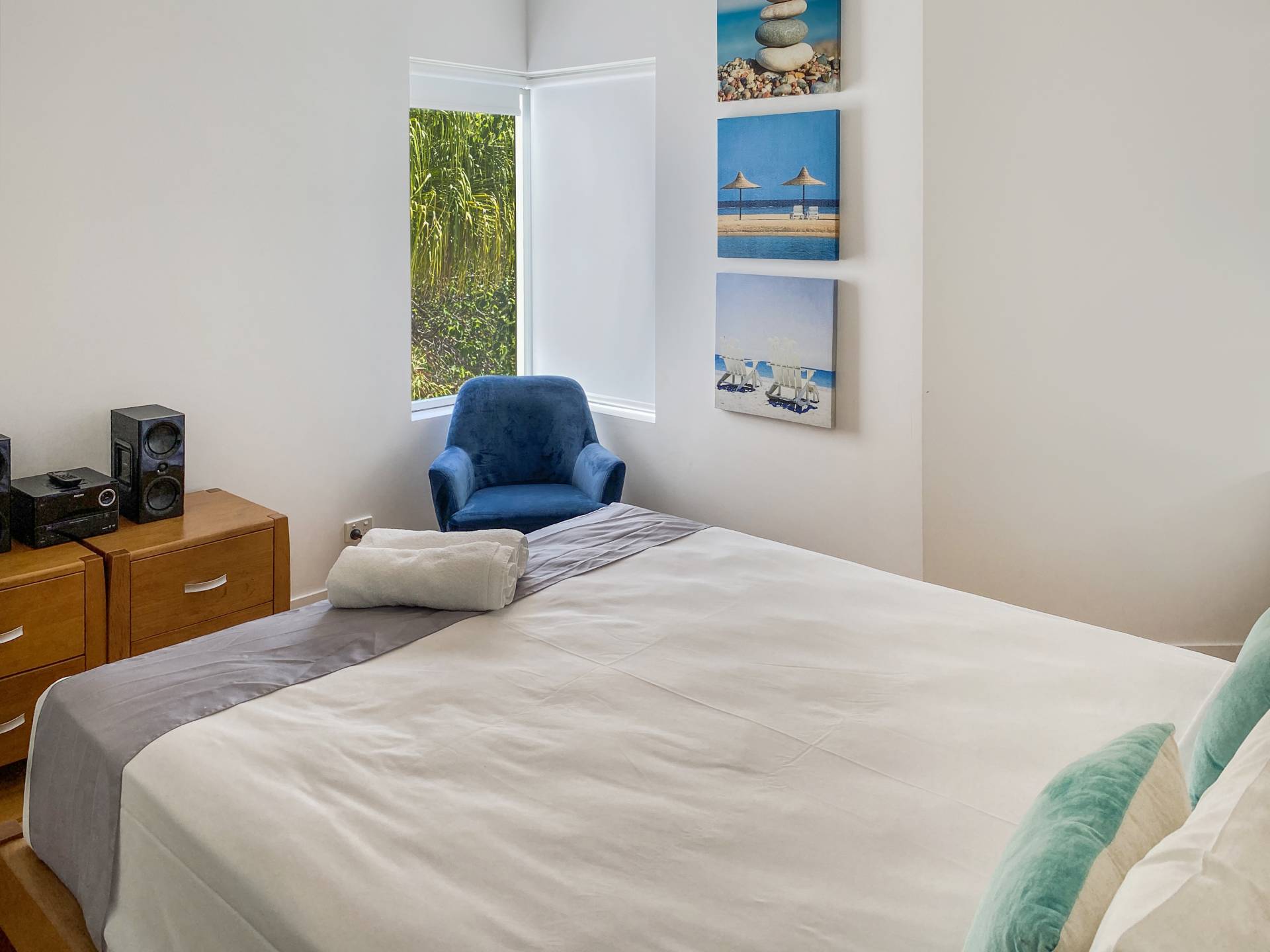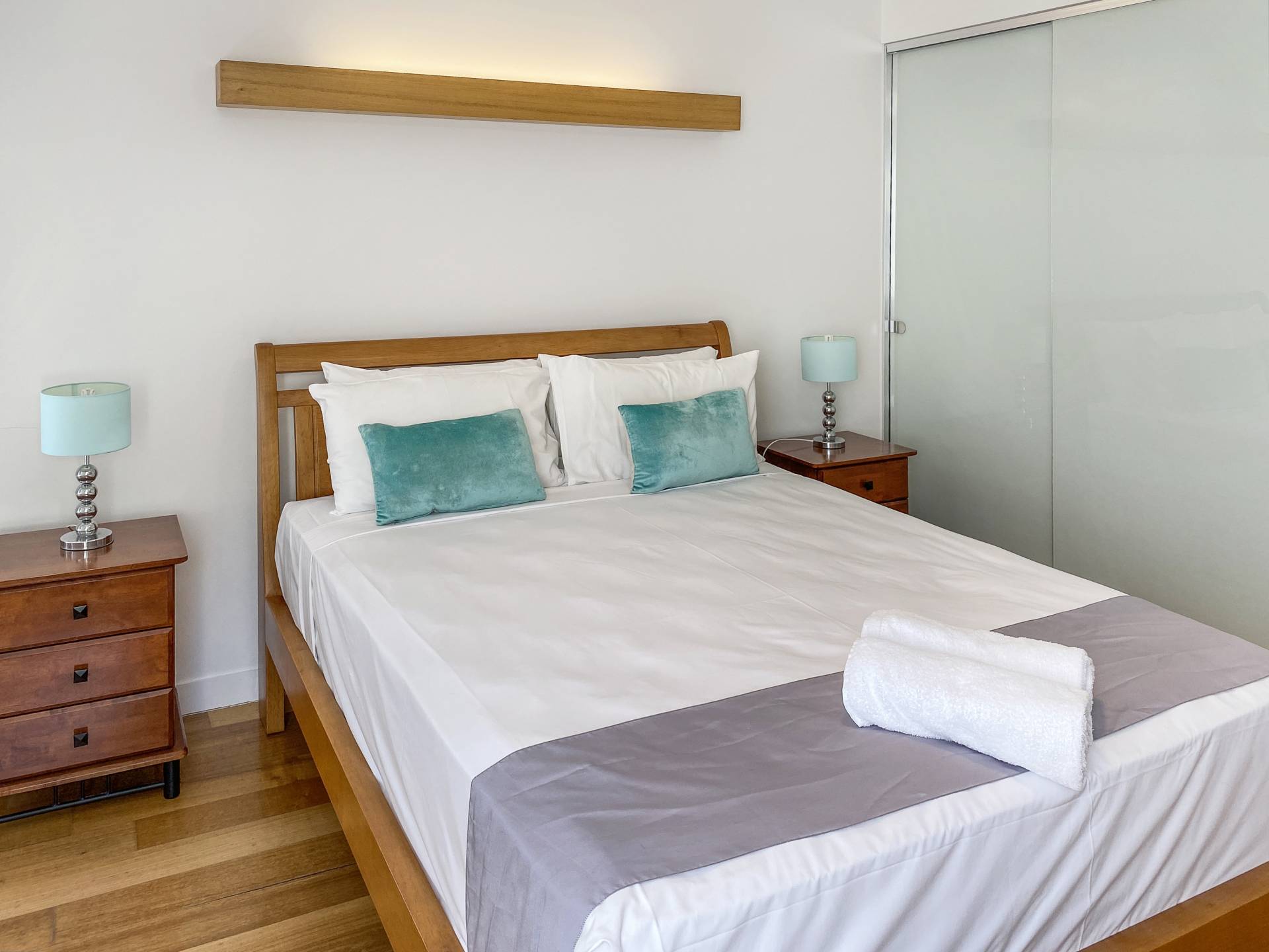The interior exudes a warmth missing from many other modern apartments, with beautiful polished wood floors throughout the living areas and bedrooms, with tiled wet areas. Ducted reverse cycle air conditioning and ceiling fans are installed throughout to keep you comfortable in any weather. The galley-style kitchen is sleek and modern with Smeg appliances, gas cooktop, stone benchtops and breakfast bar and comes fully equipped, right down to the teaspoons. The apartment is offered fully furnished so you can continue to holiday let or simply move in.