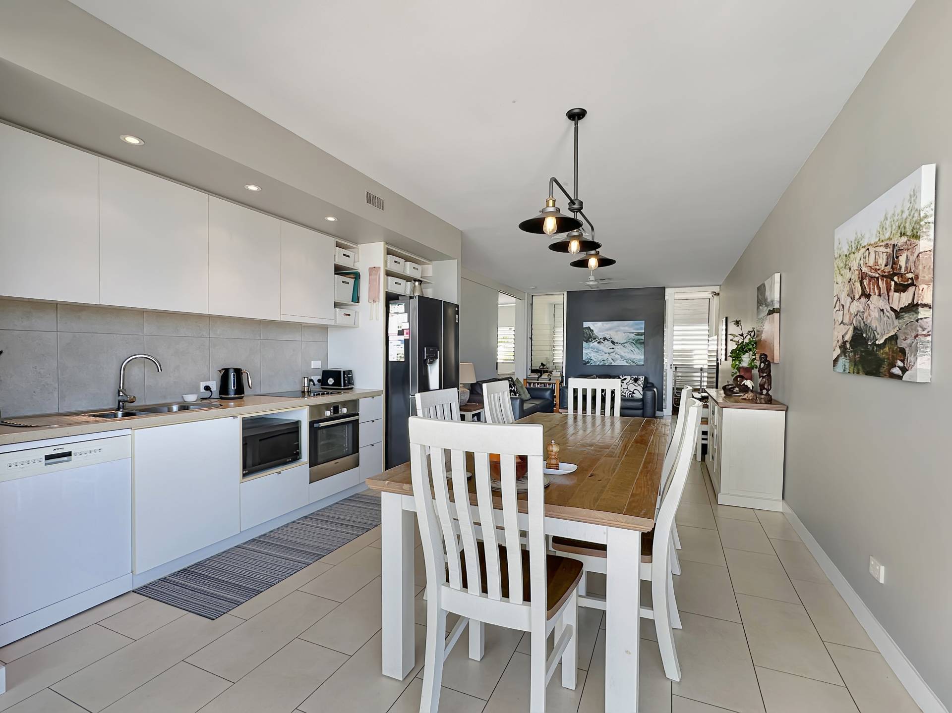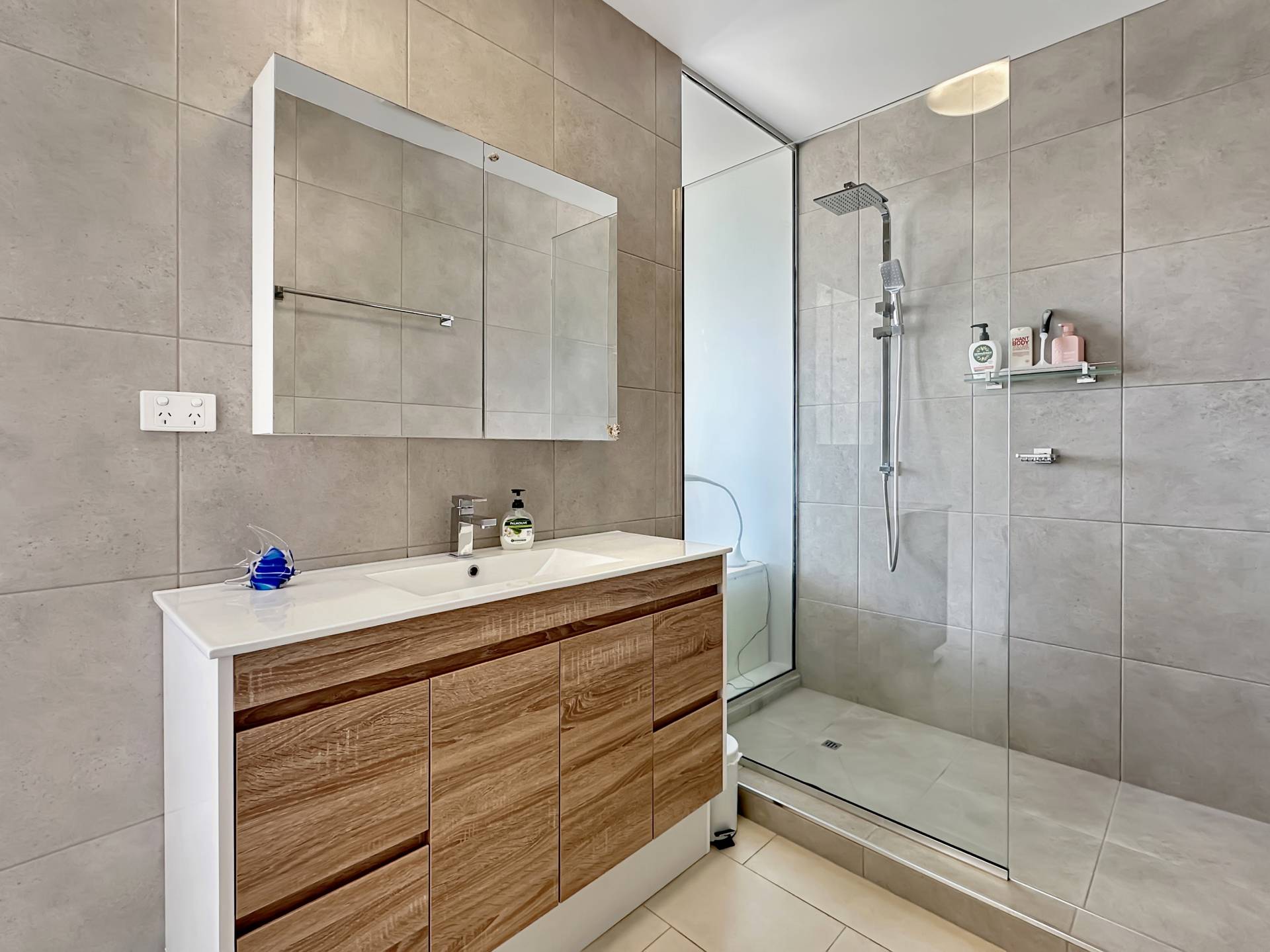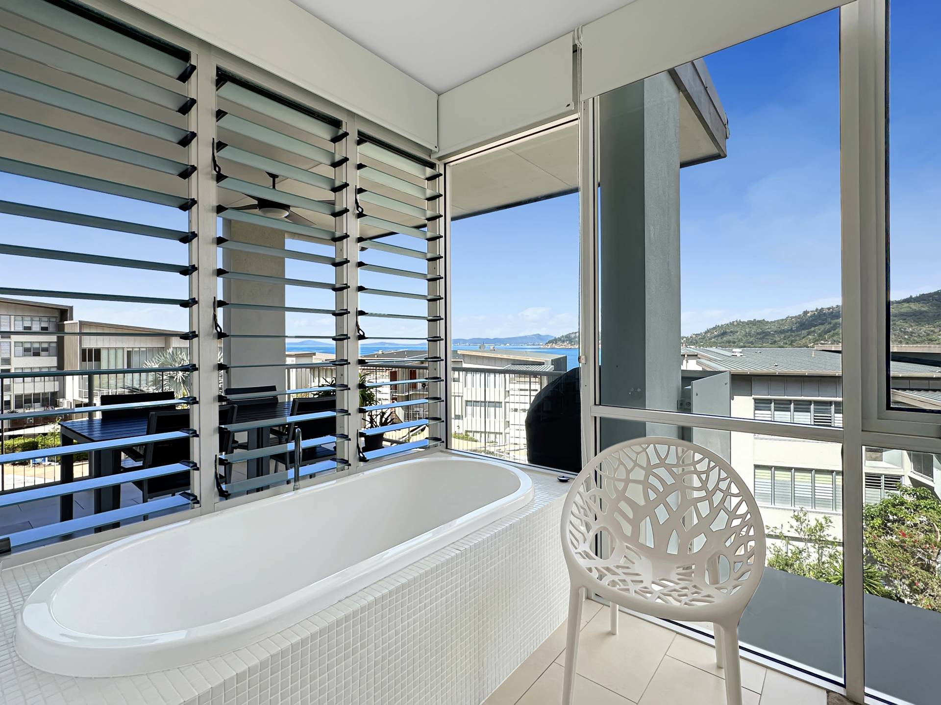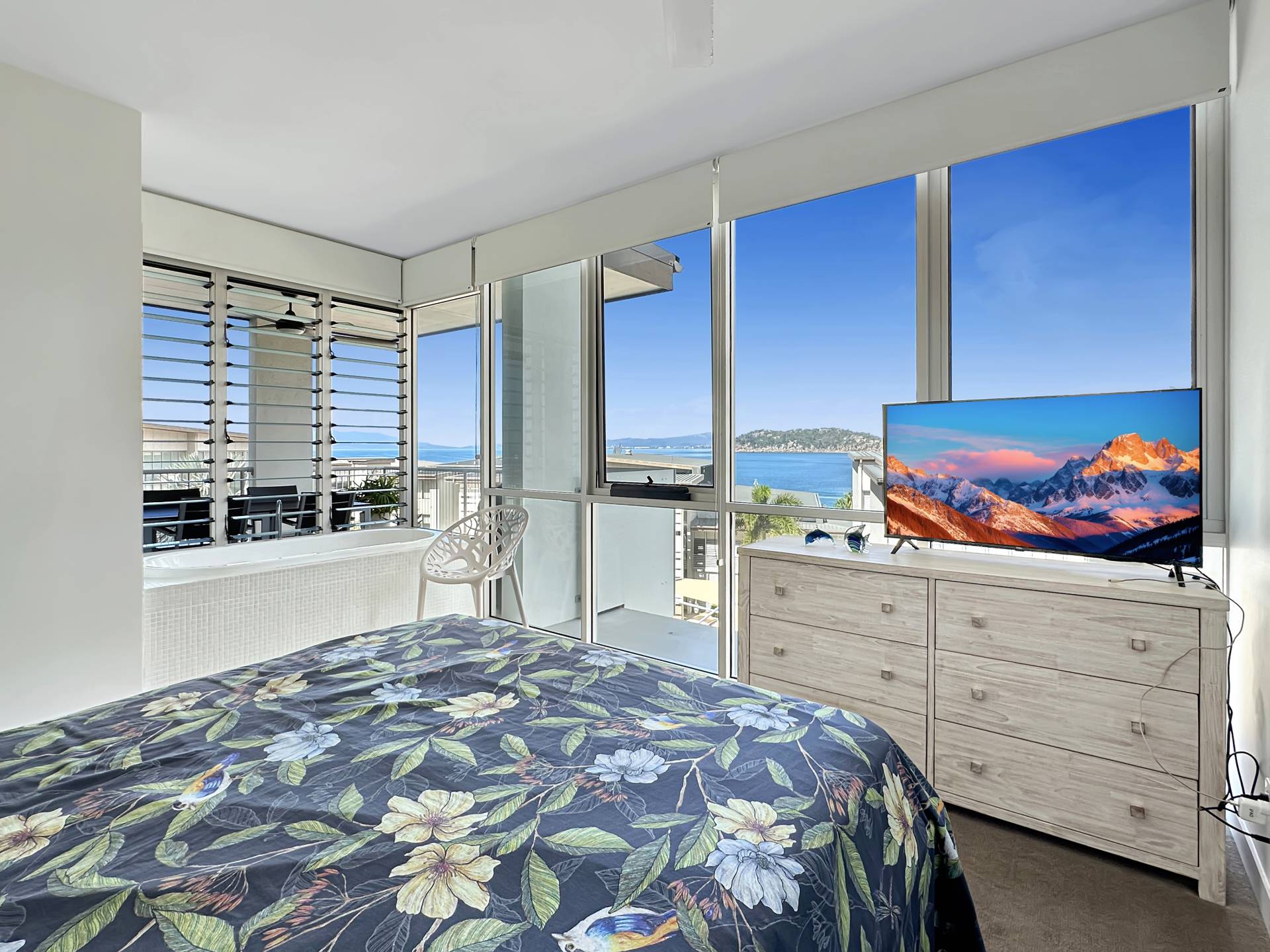 Entry is via the 'beach room', which is great for throwing your beach gear after a day out exploring the bays or for additional storage. Step into the open-plan living area with its floor to ceiling sliding glass doors opening onto the covered balcony showcasing the beautiful ocean and mountain views. In fact, you can enjoy the view from the kitchen, living area, dining area, master bedroom, and even the shower and bath!