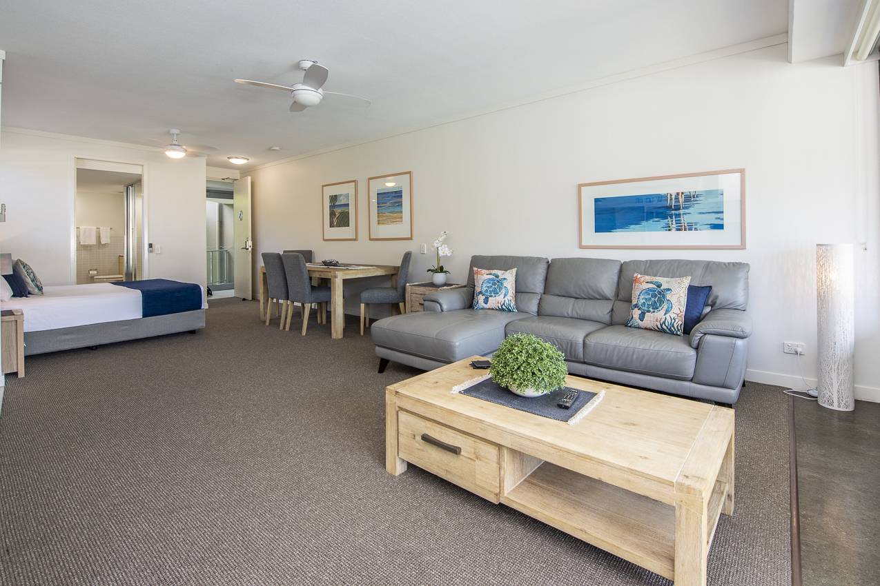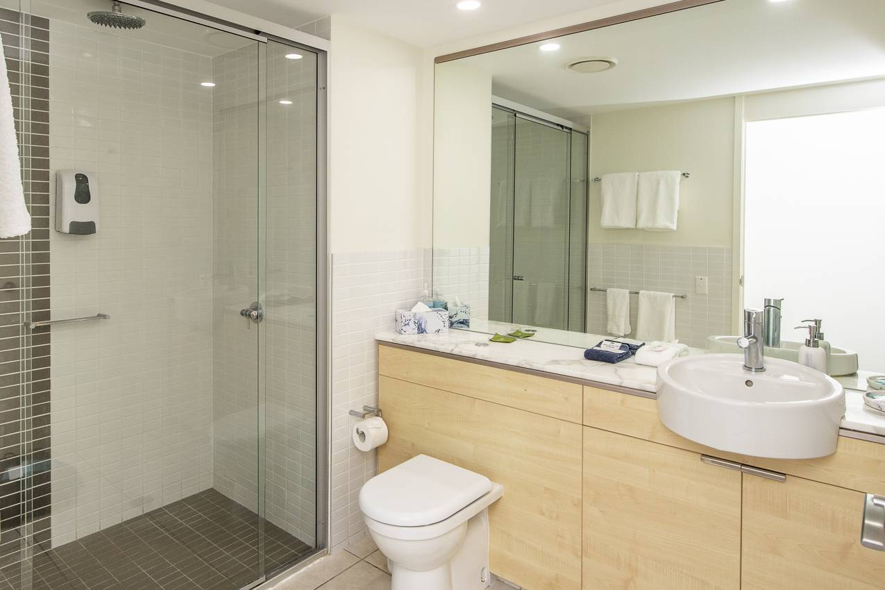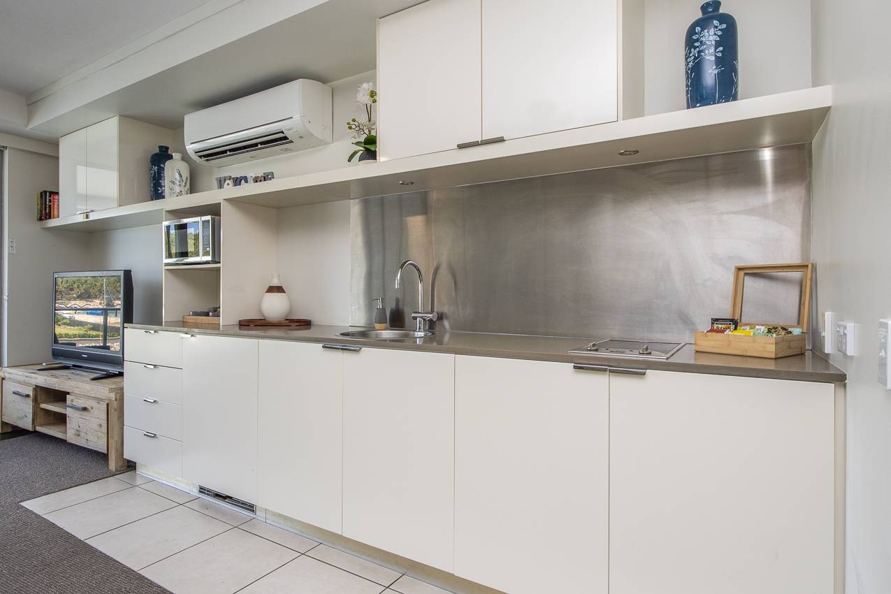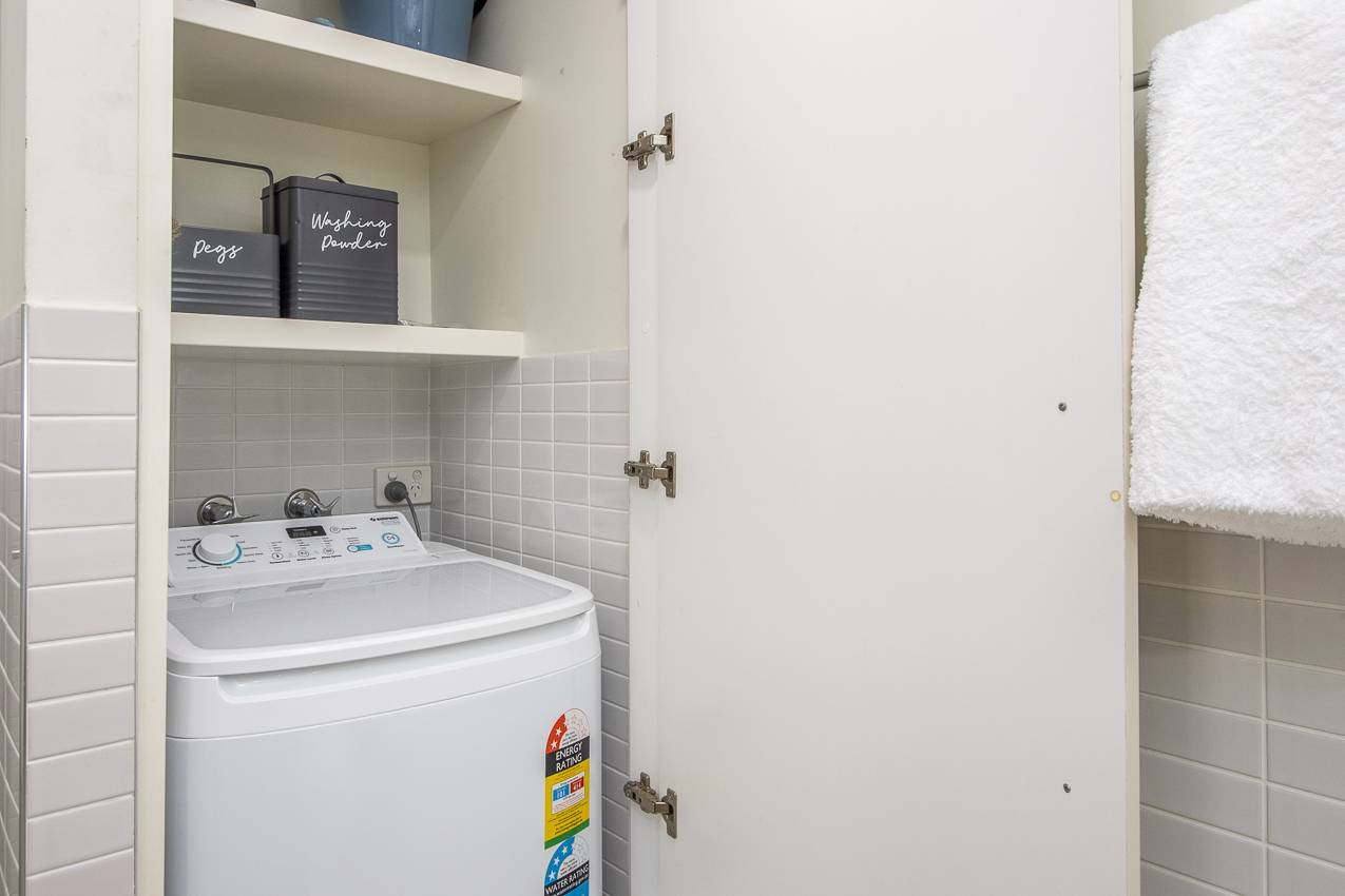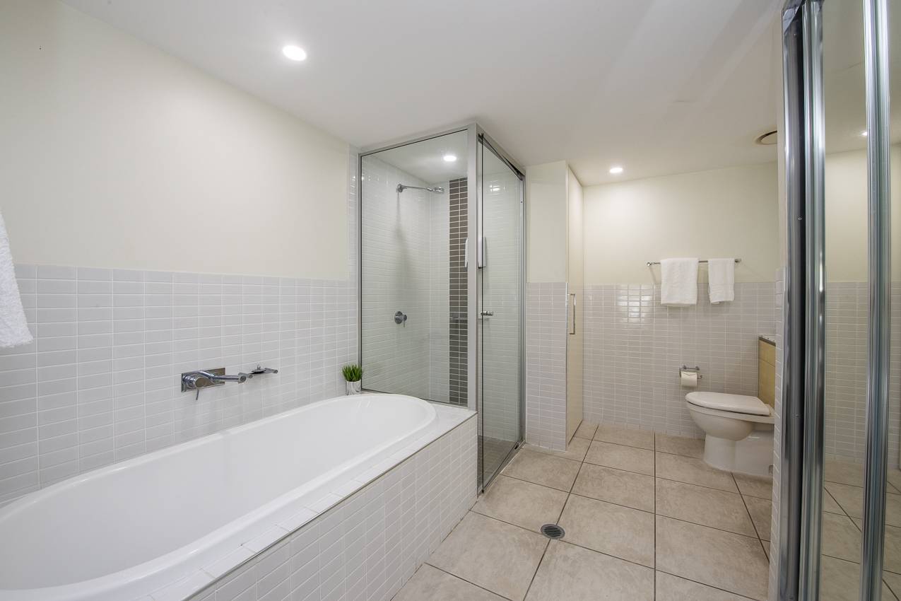 With the dual key layout (please see the floorplan), you can stay in one side while you let out the other or have family or friends to visit and maintain some separation or come together by opening up the balcony privacy screen. The larger side of the unit is open-plan studio-style with kitchenette, dining table and lounge area opening up onto the balcony. The bathroom features a bathtub, separate shower, vanity with granite benchtop and laundry cupboard.