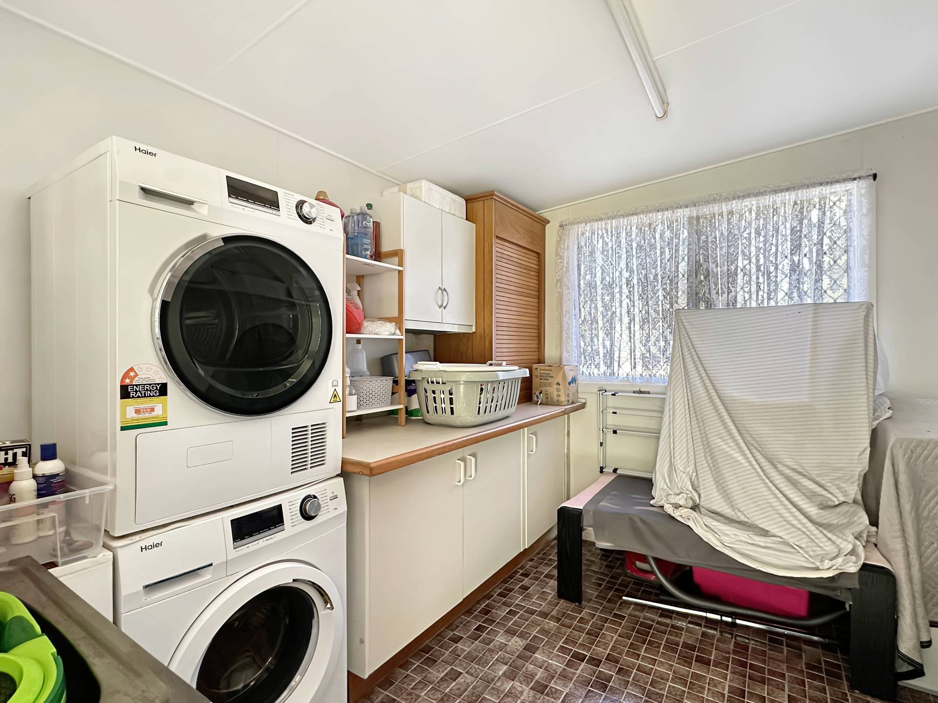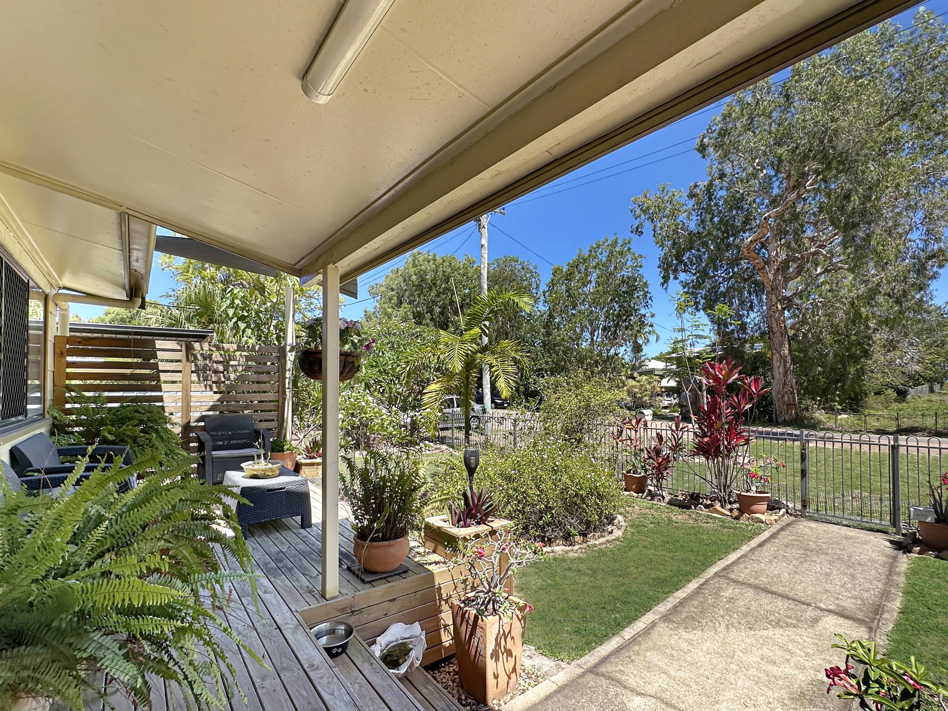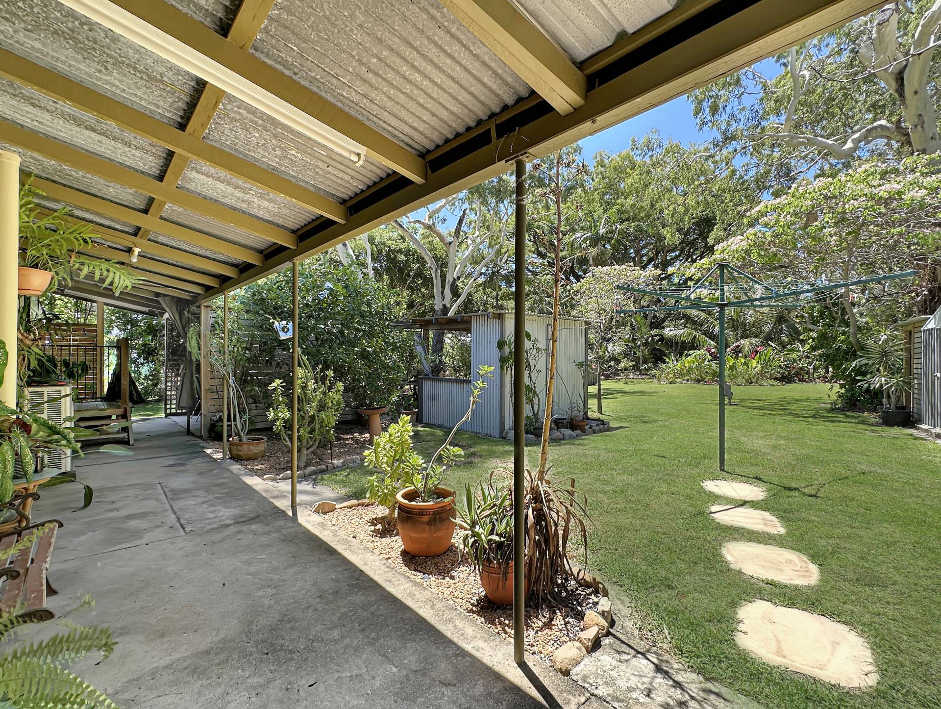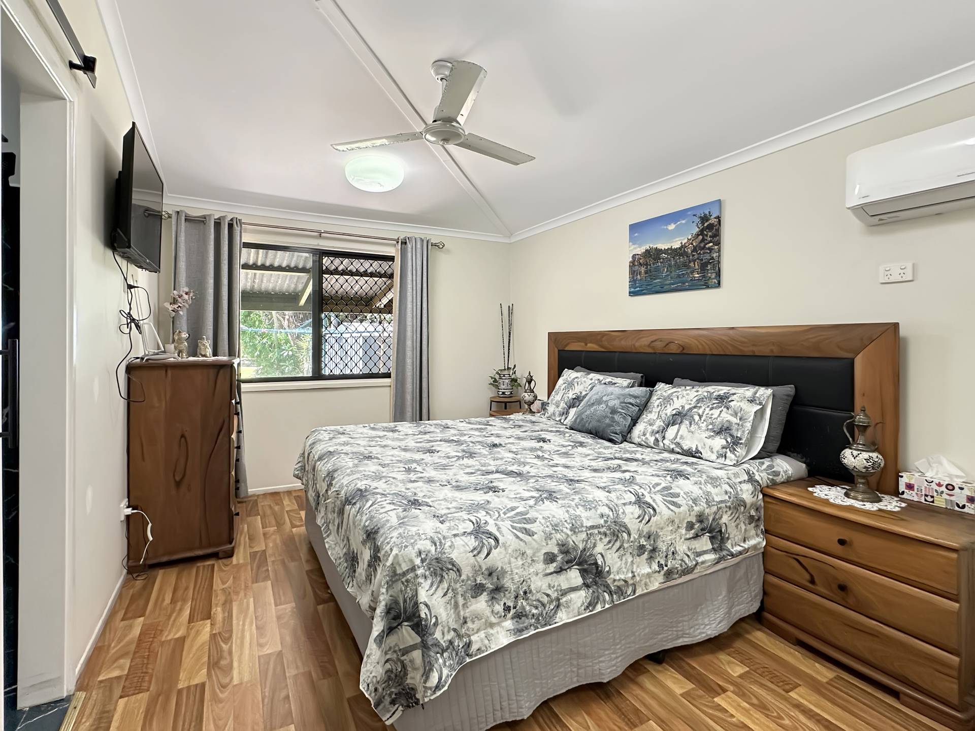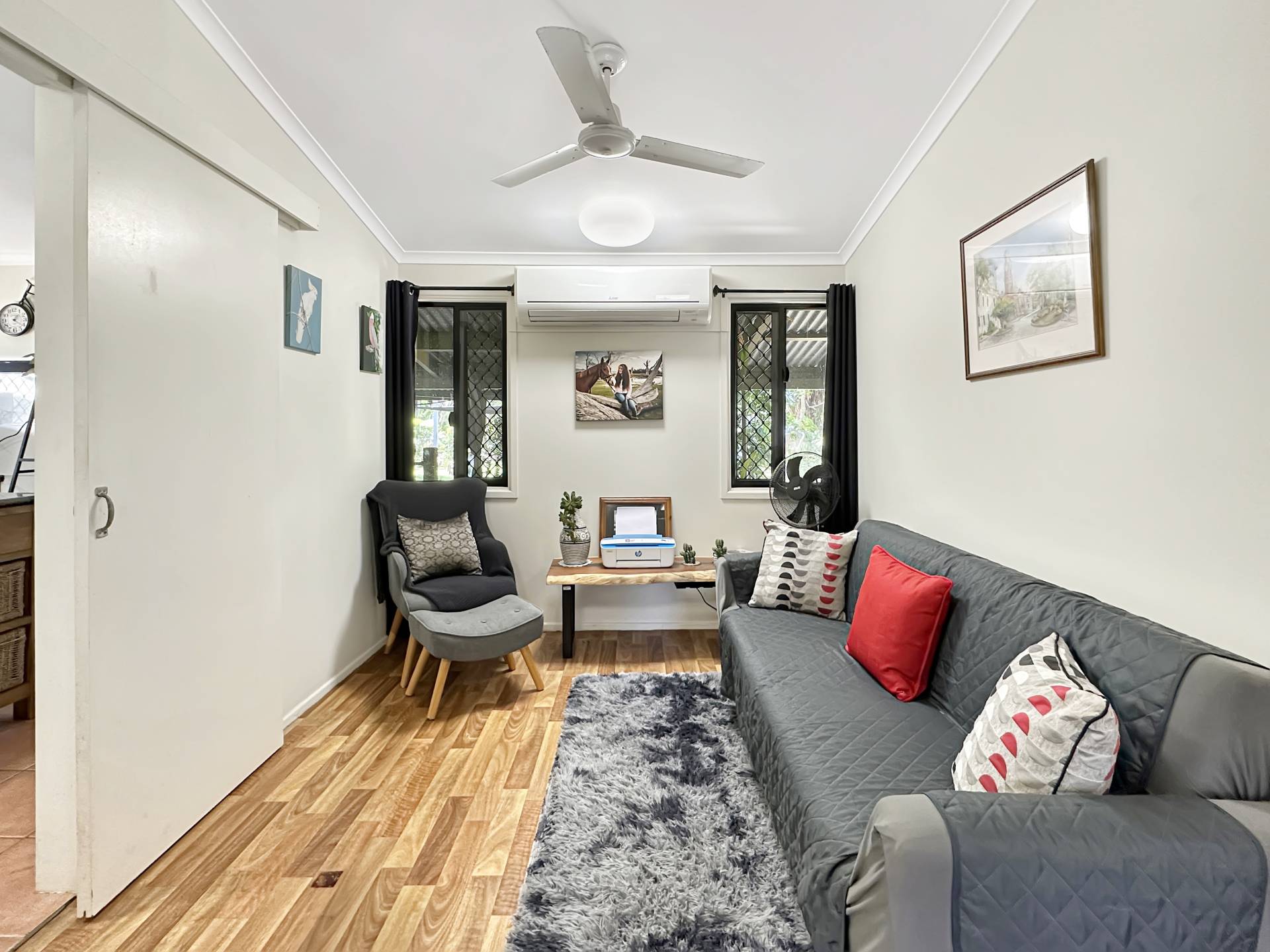 To the right of the front entry is the second bedroom which has windows on two sides taking advantage of breezes, fan, air-con and built-in-wardrobes.  A third bedroom is set up to the rear of the lounge and could easily be made into a private bedroom with a partition wall. The large laundry is located at the back of the property and access to this is from the full length back verandah.