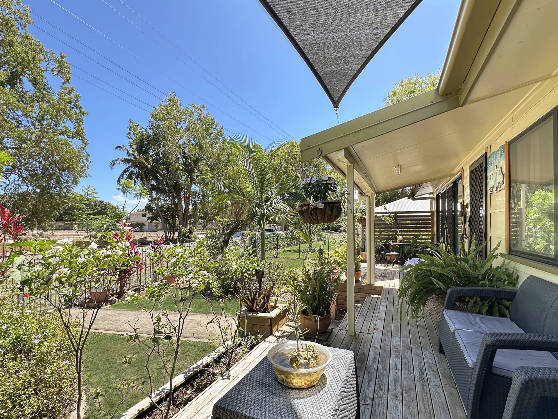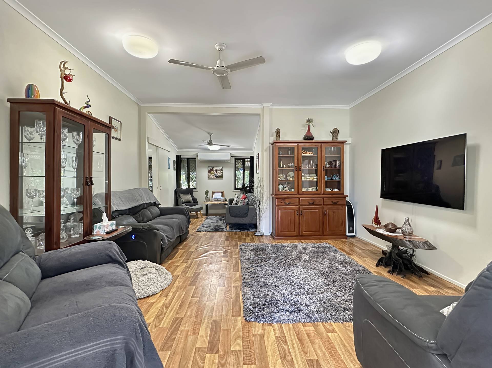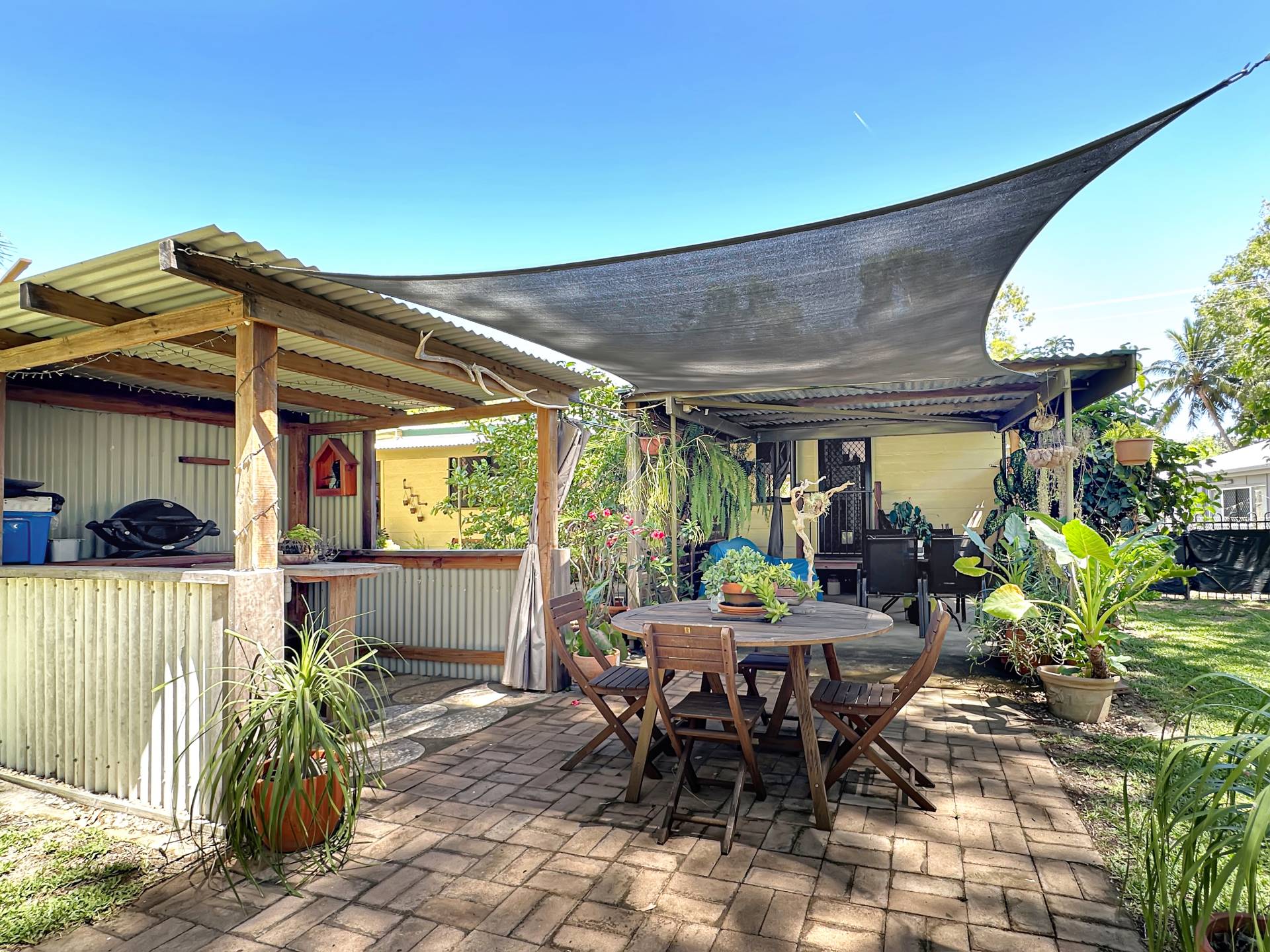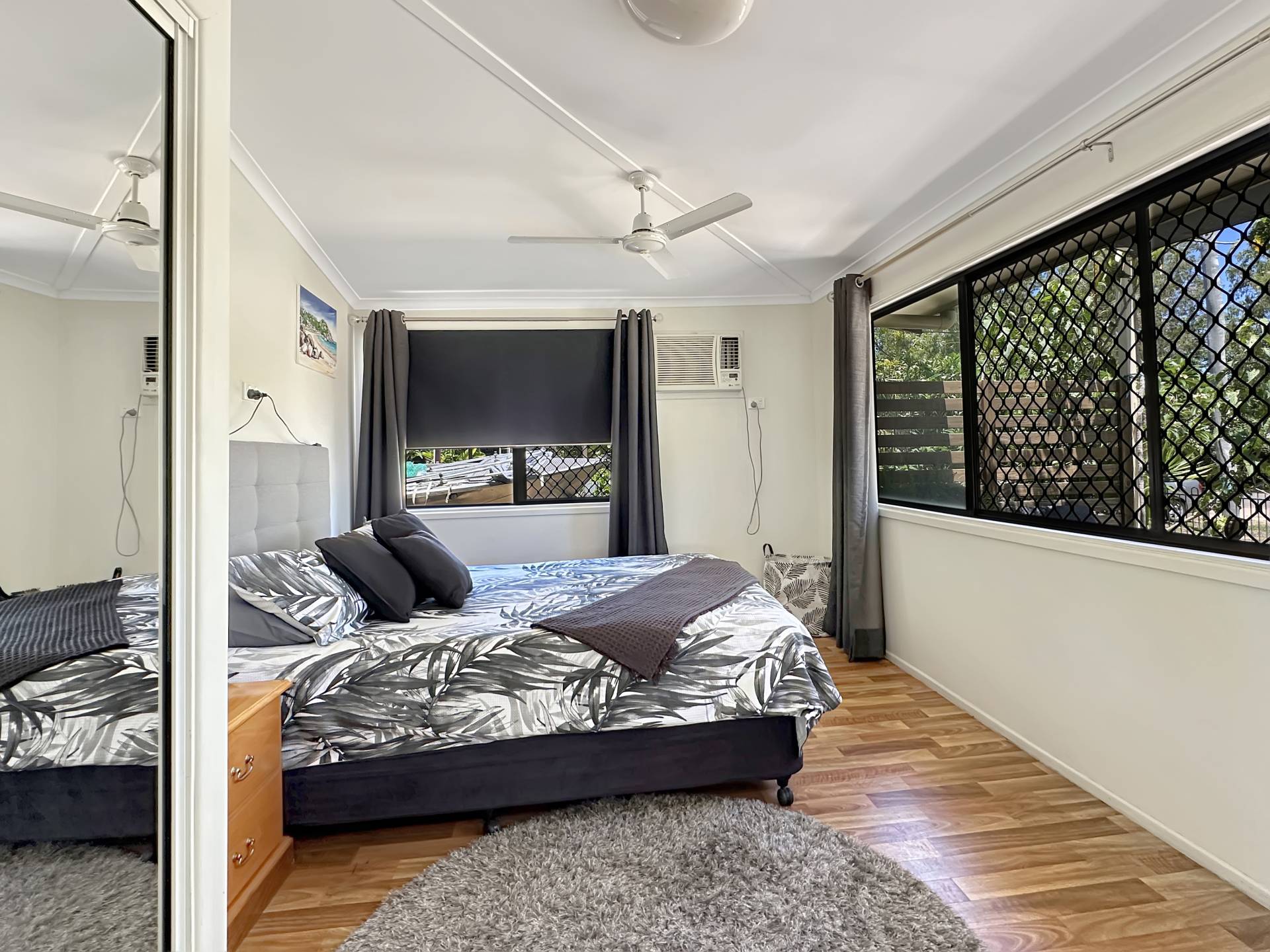 To the right of the front entry is the second bedroom which has windows on two sides taking advantage of breezes, fan, air-con and built-in-wardrobes.  A third bedroom is set up to the rear of the lounge and could easily be made into a private bedroom with a partition wall. The large laundry is located at the back of the property and access to this is from the full length back verandah.