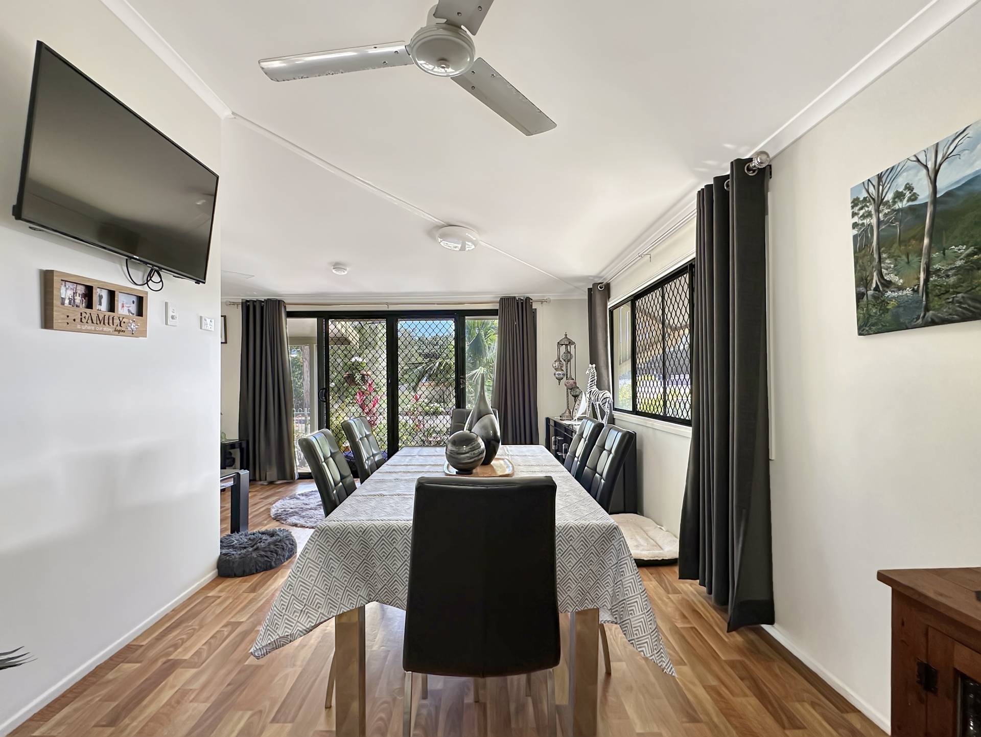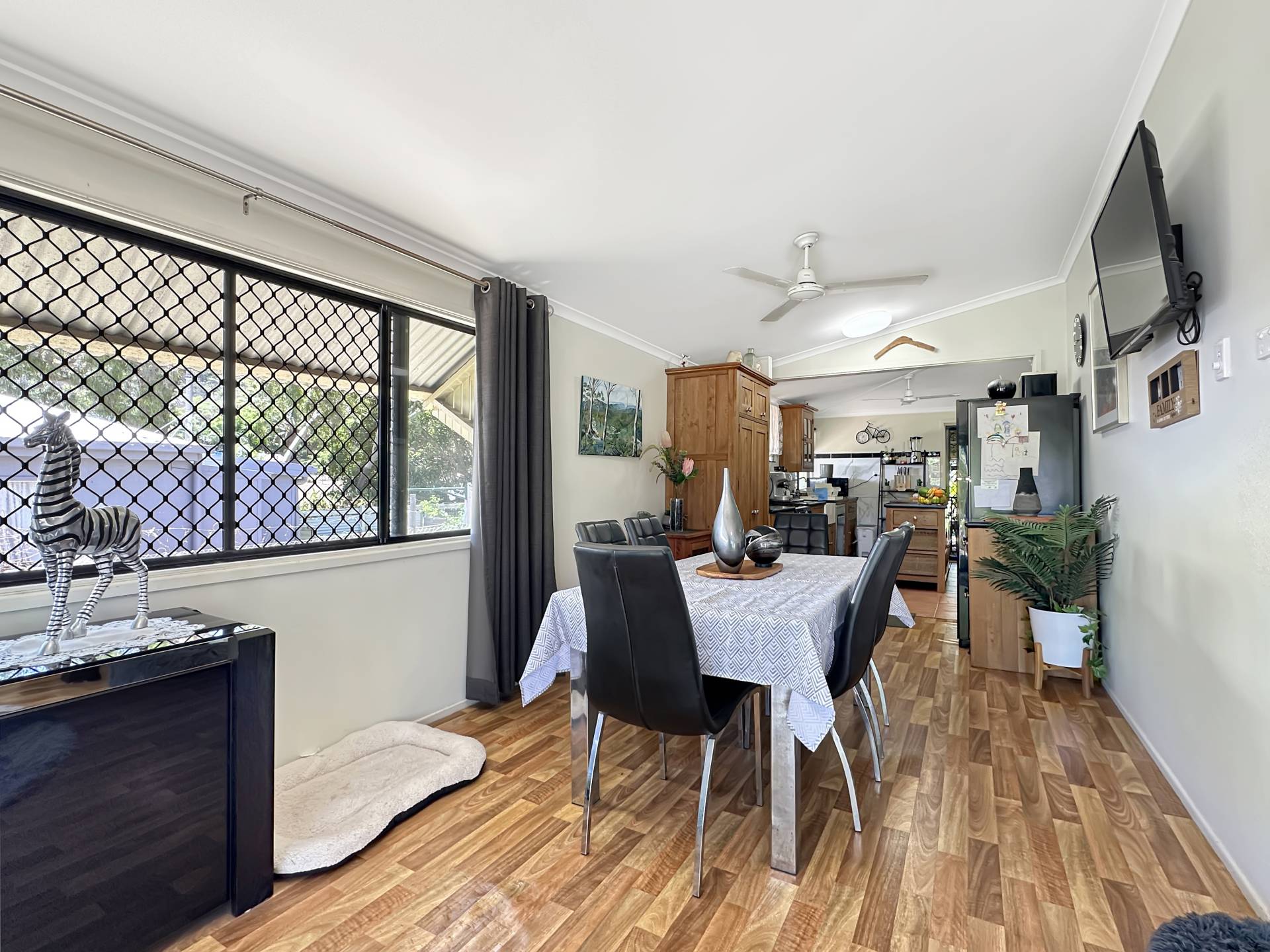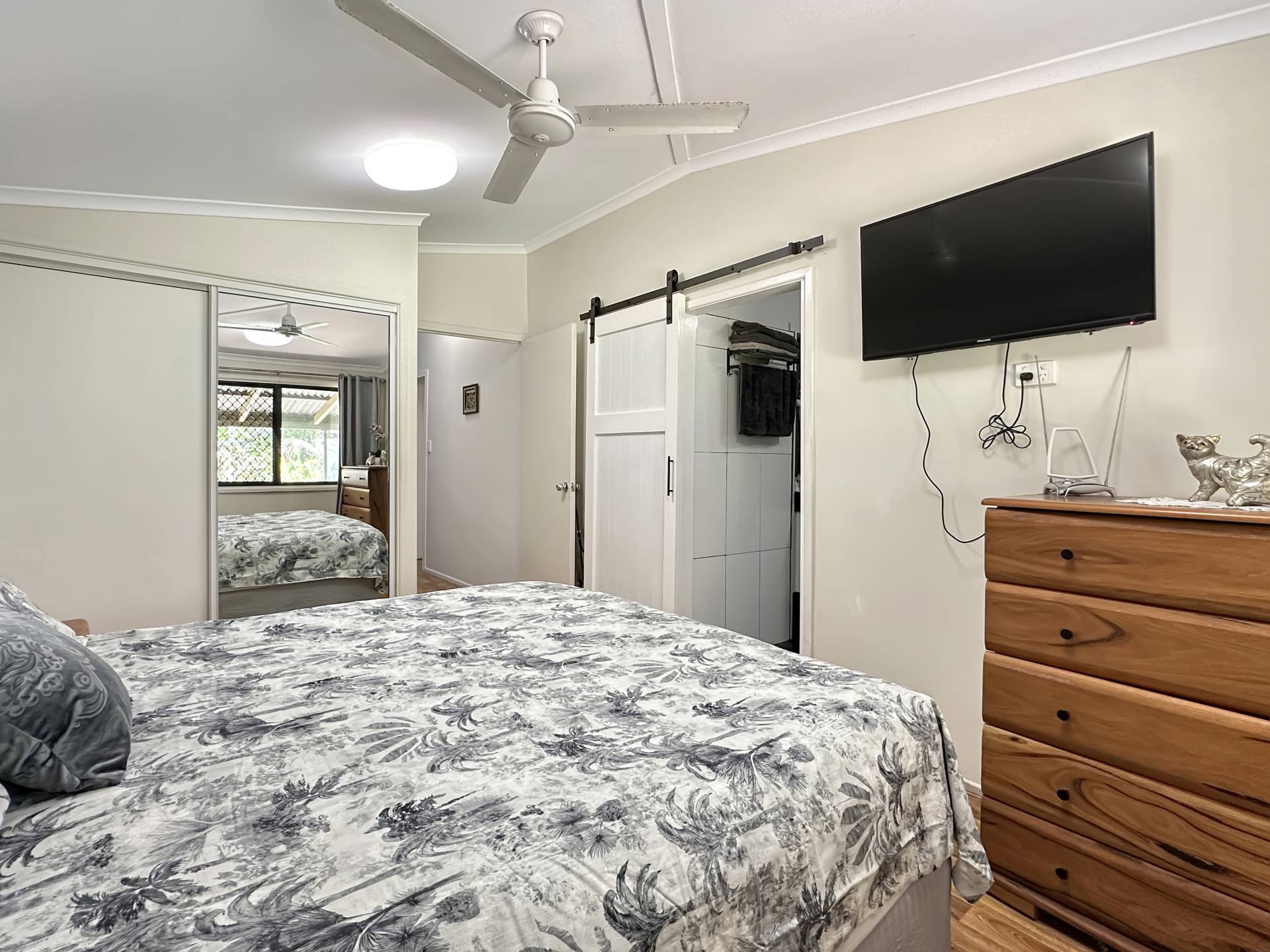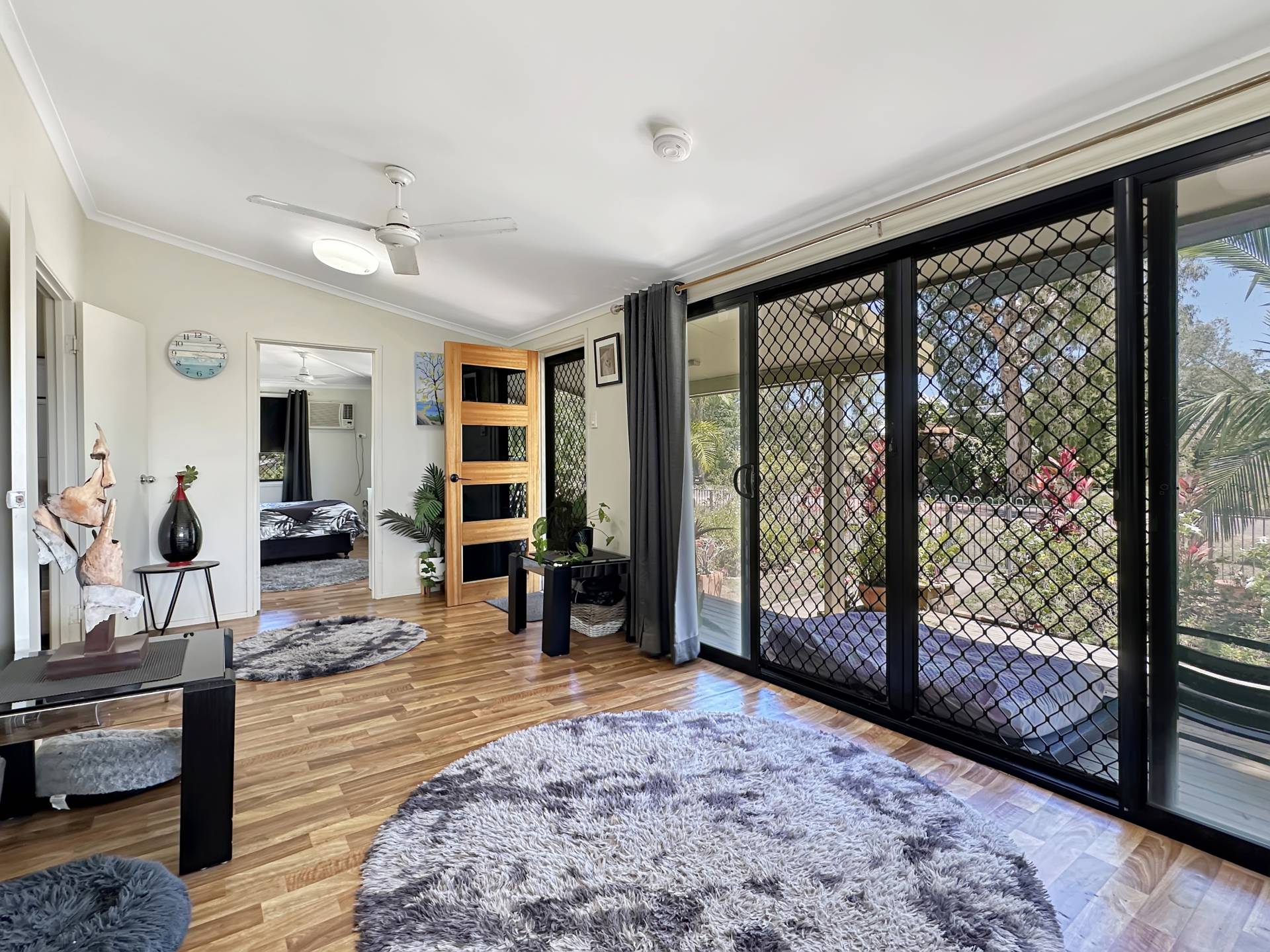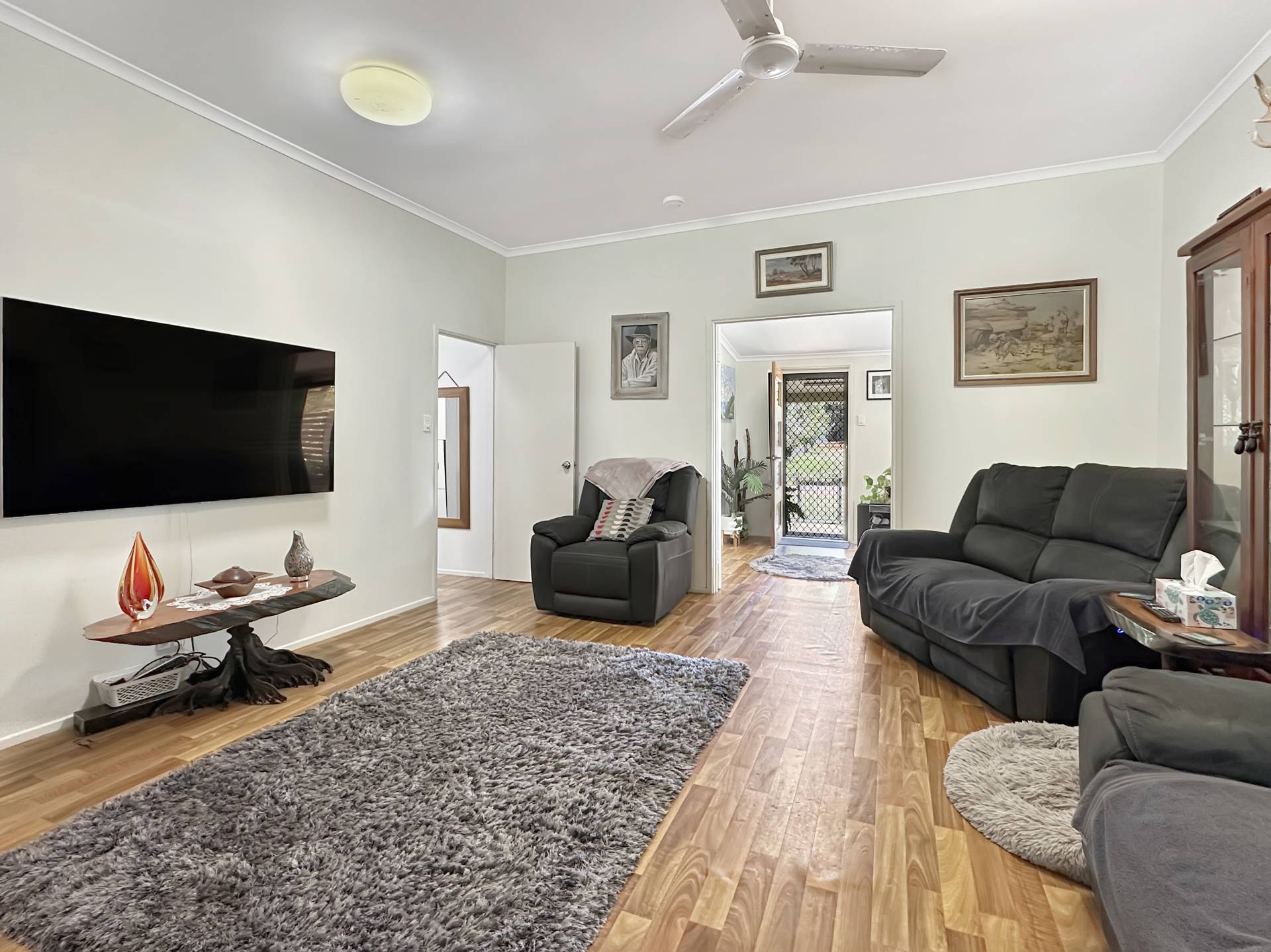 To the right of the front entry is the second bedroom which has windows on two sides taking advantage of breezes, fan, air-con and built-in-wardrobes.  A third bedroom is set up to the rear of the lounge and could easily be made into a private bedroom with a partition wall. The large laundry is located at the back of the property and access to this is from the full length back verandah.
