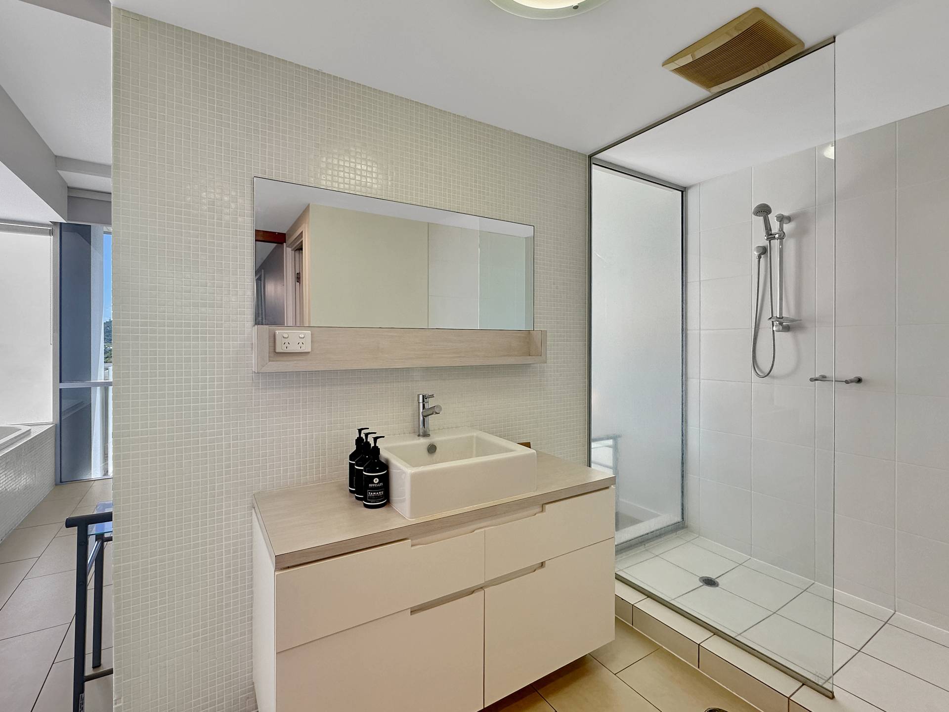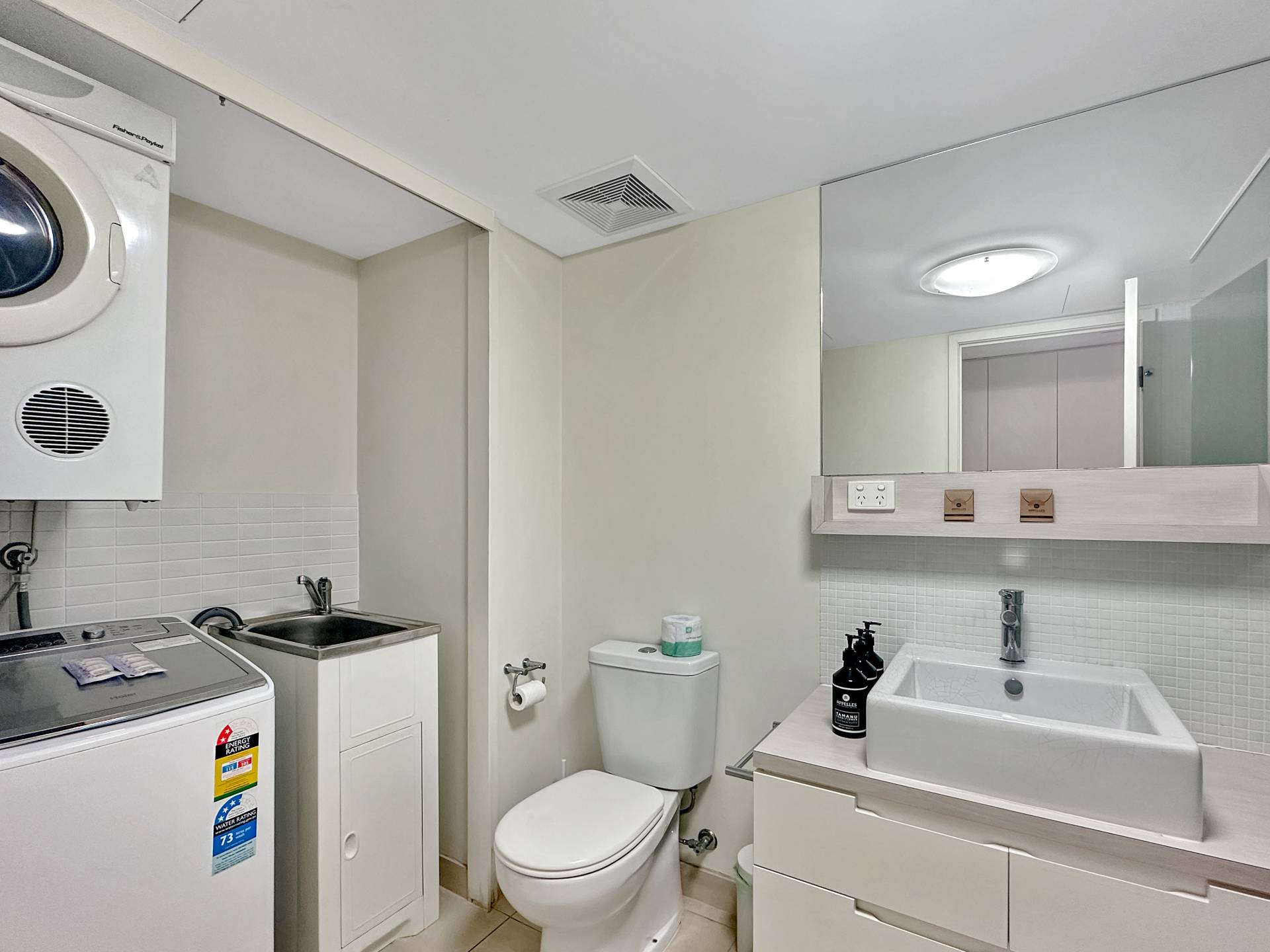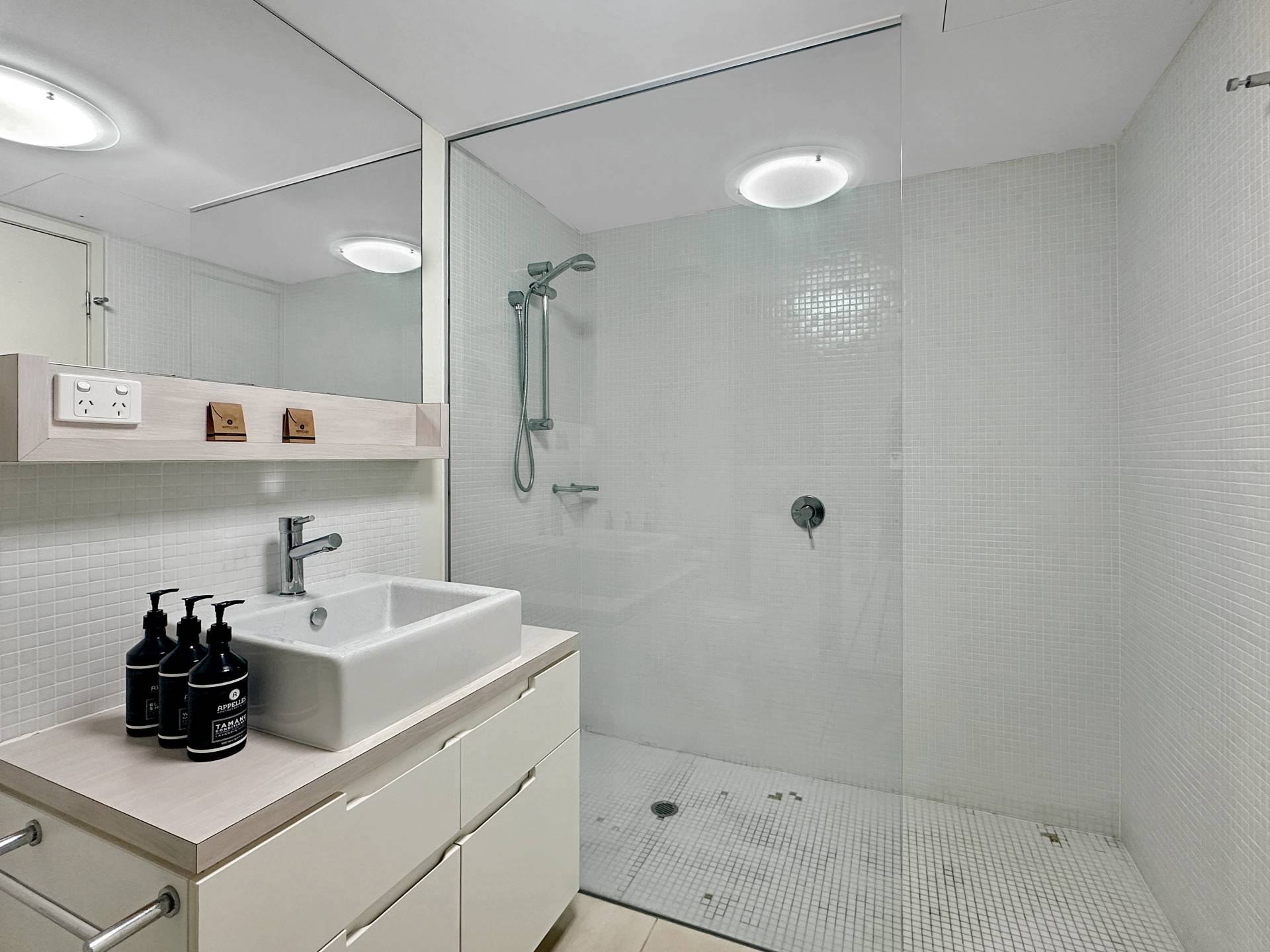 With two bedrooms, the master features an integrated ensuite with a bathtub and separate shower. The main bathroom features a tucked-away laundry behind folding doors.