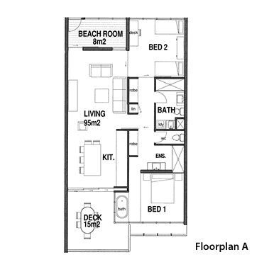 Entry is via the 'beachroom' which is handy for storing all your beach and pool toys. The open-plan living/dining/kitchen flows through floor-to-ceiling glass doors to seamlessly transition to the verandah.
