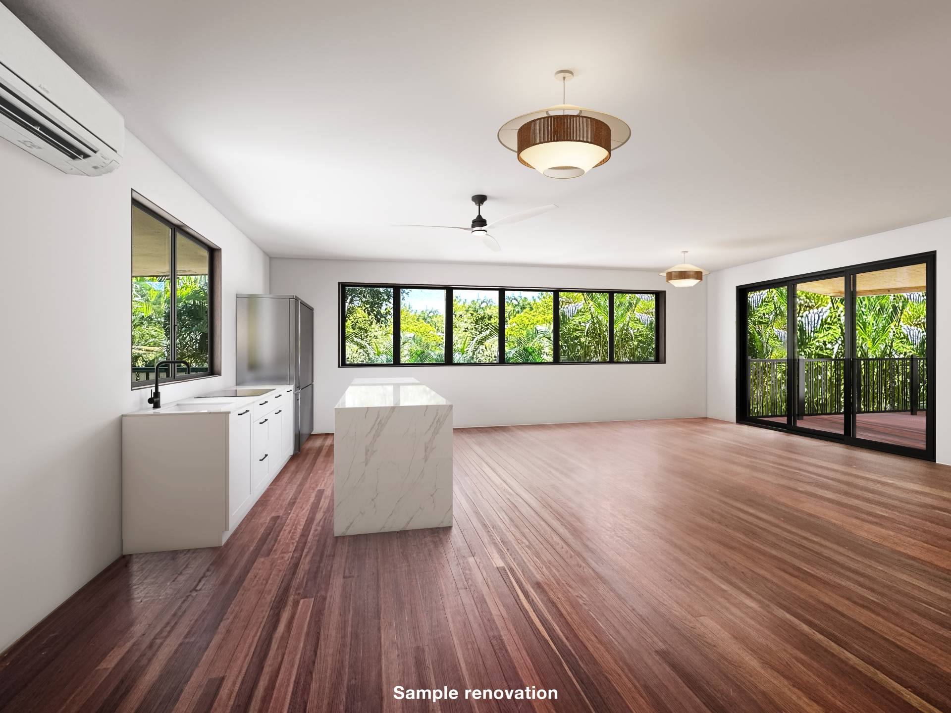 The functional kitchen will need full renovation in the longer term giving you the opportunity to really put your personal stamp on the property.  Set one metre off ground level, it provides easy and cost effective access to relocate services.  You could easily reconfigure to a modern open plan living area for true indoor/outdoor flow....add a pool off the back deck and have the perfect layout for functionality and enjoyment. See the virtual renovation image at the end of the photo gallery.