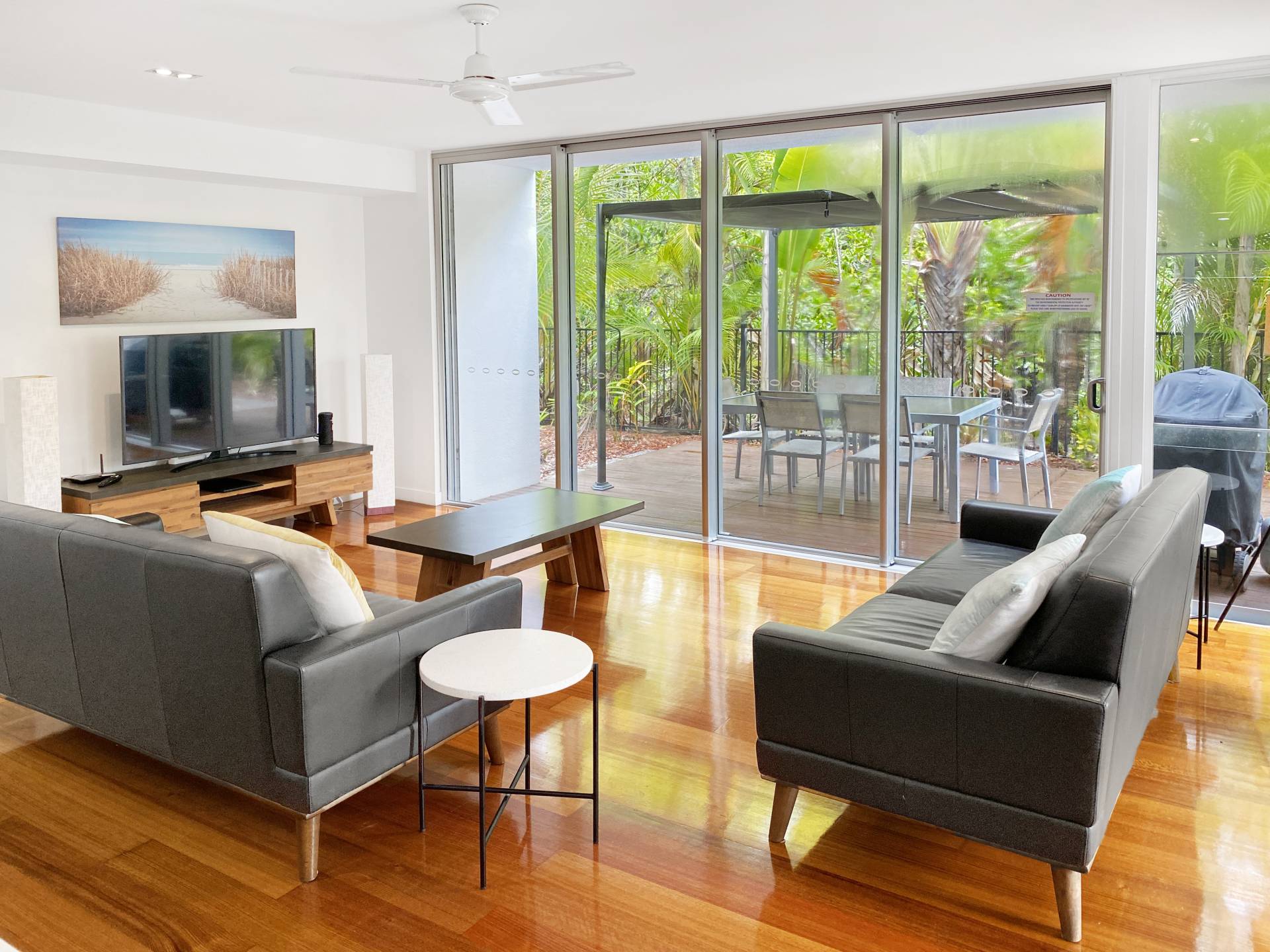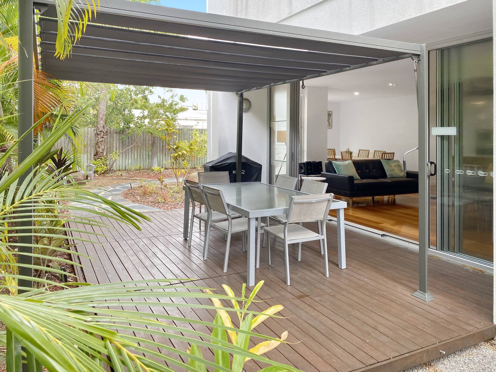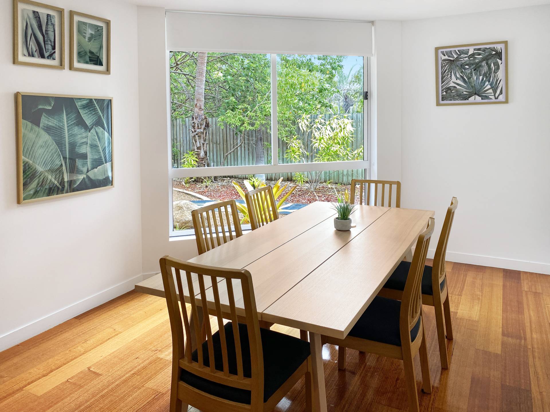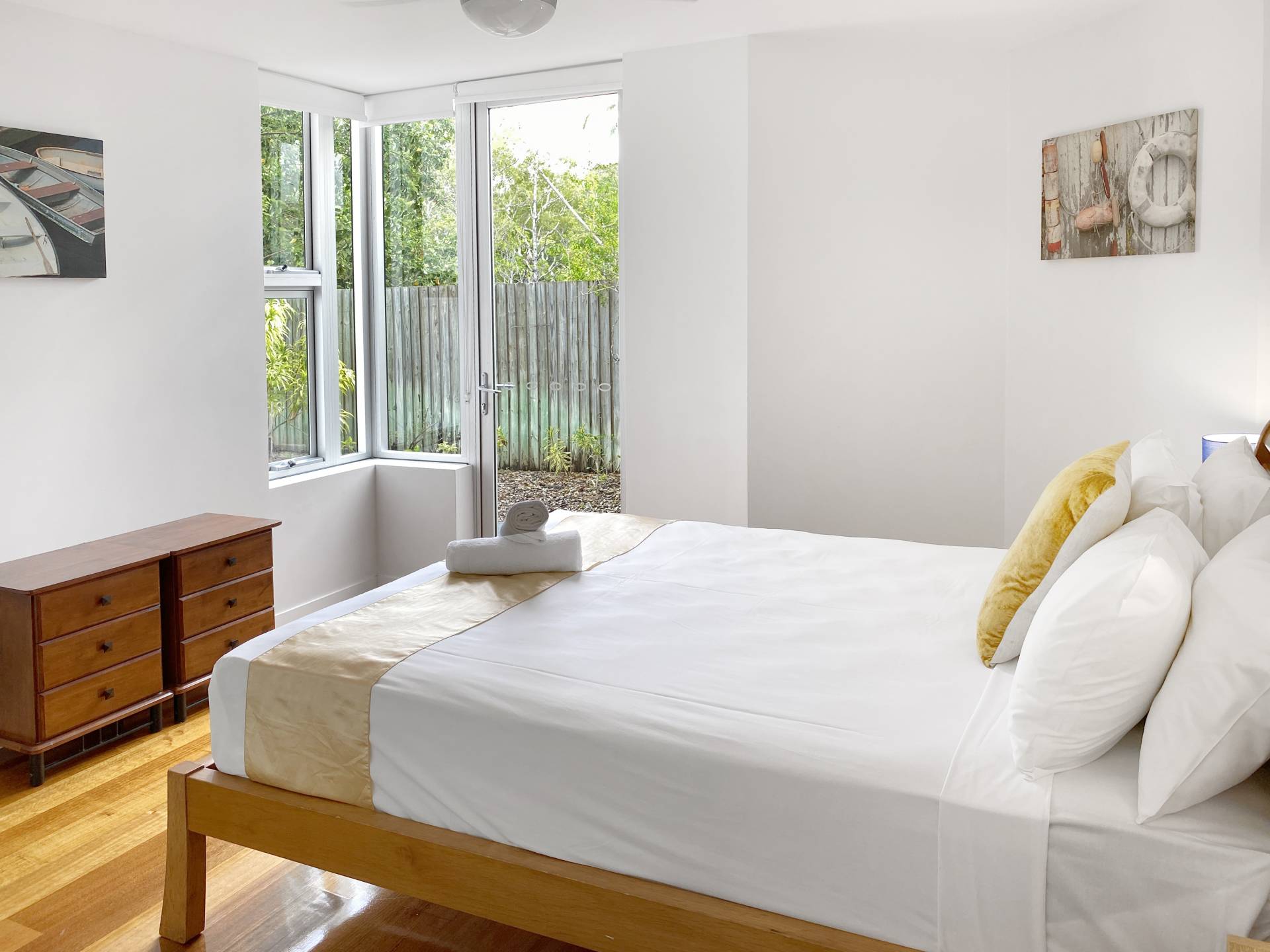Maggies Apartment 2 takes a step back from the busy beachfront and is popular amongst holiday guests for its ground floor location with a 110m2 private exclusive use area courtyard garden with bush views to the tidal creek behind. Large glass sliding doors open up from the deck into the open-plan living area, with the kitchen, lounge and dining all enjoying lovely garden views. Step out the front and you will see the beach just across the road.