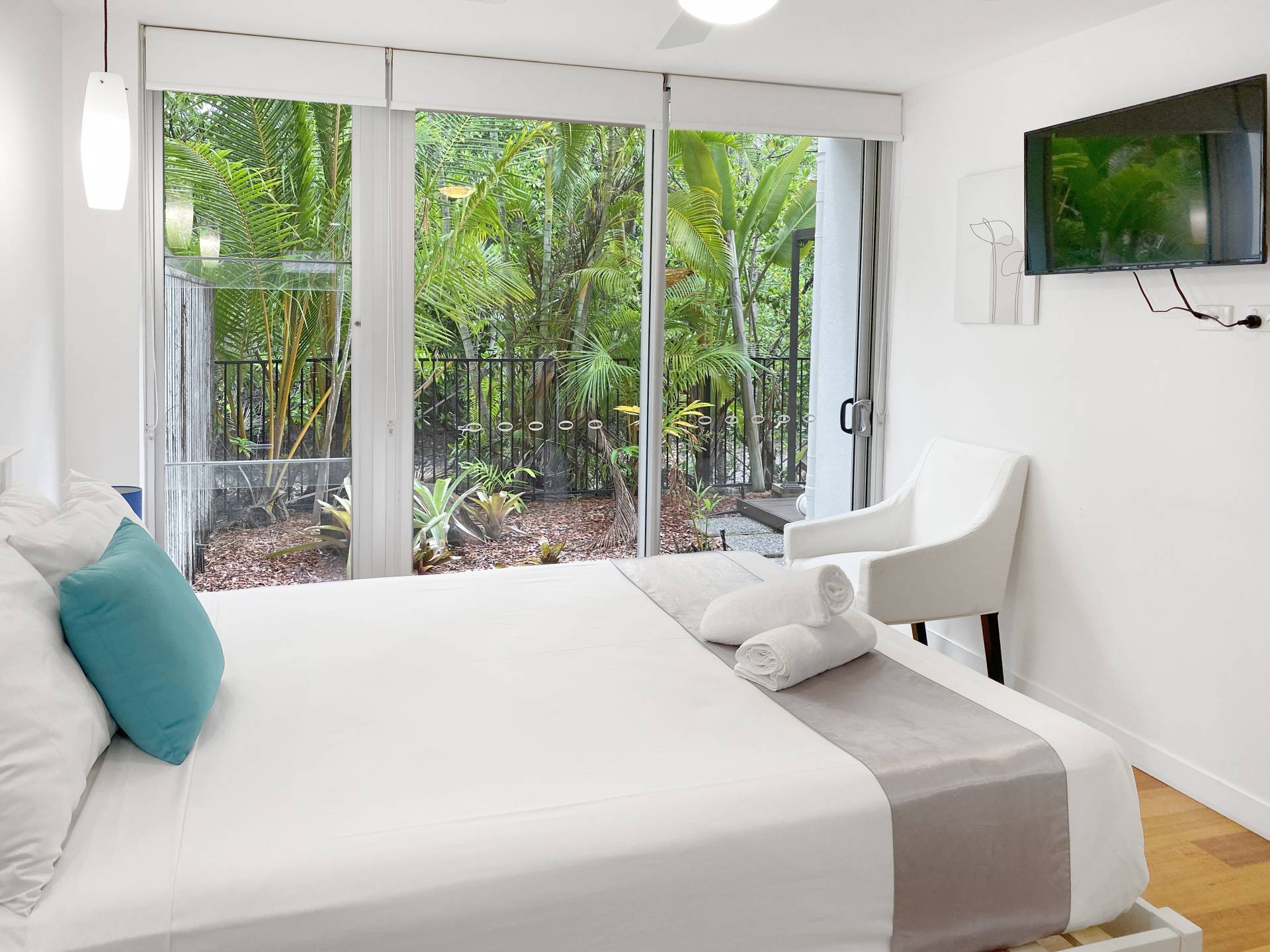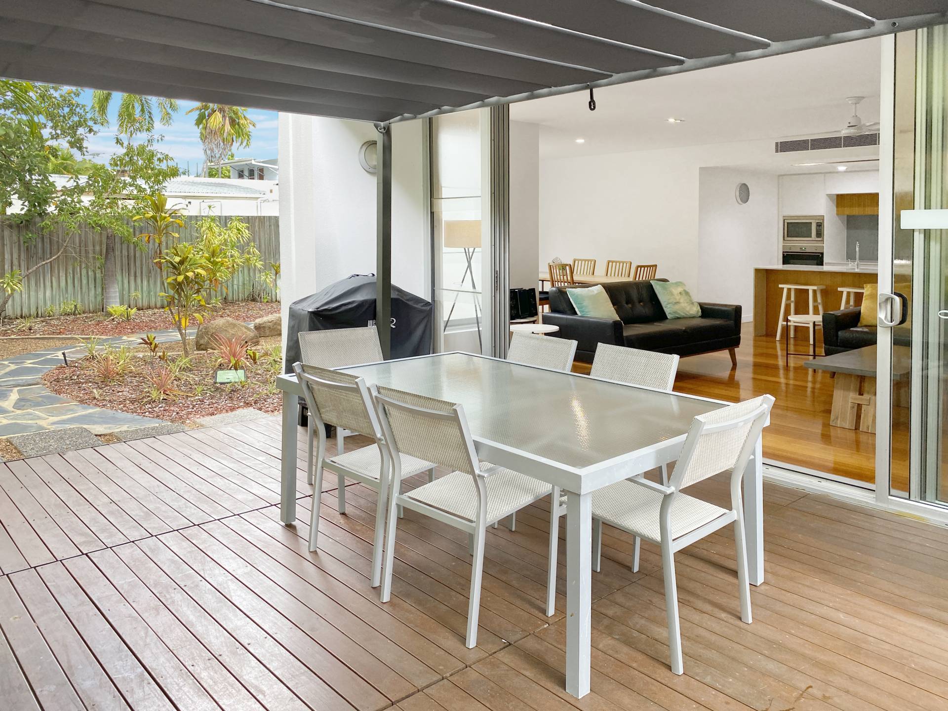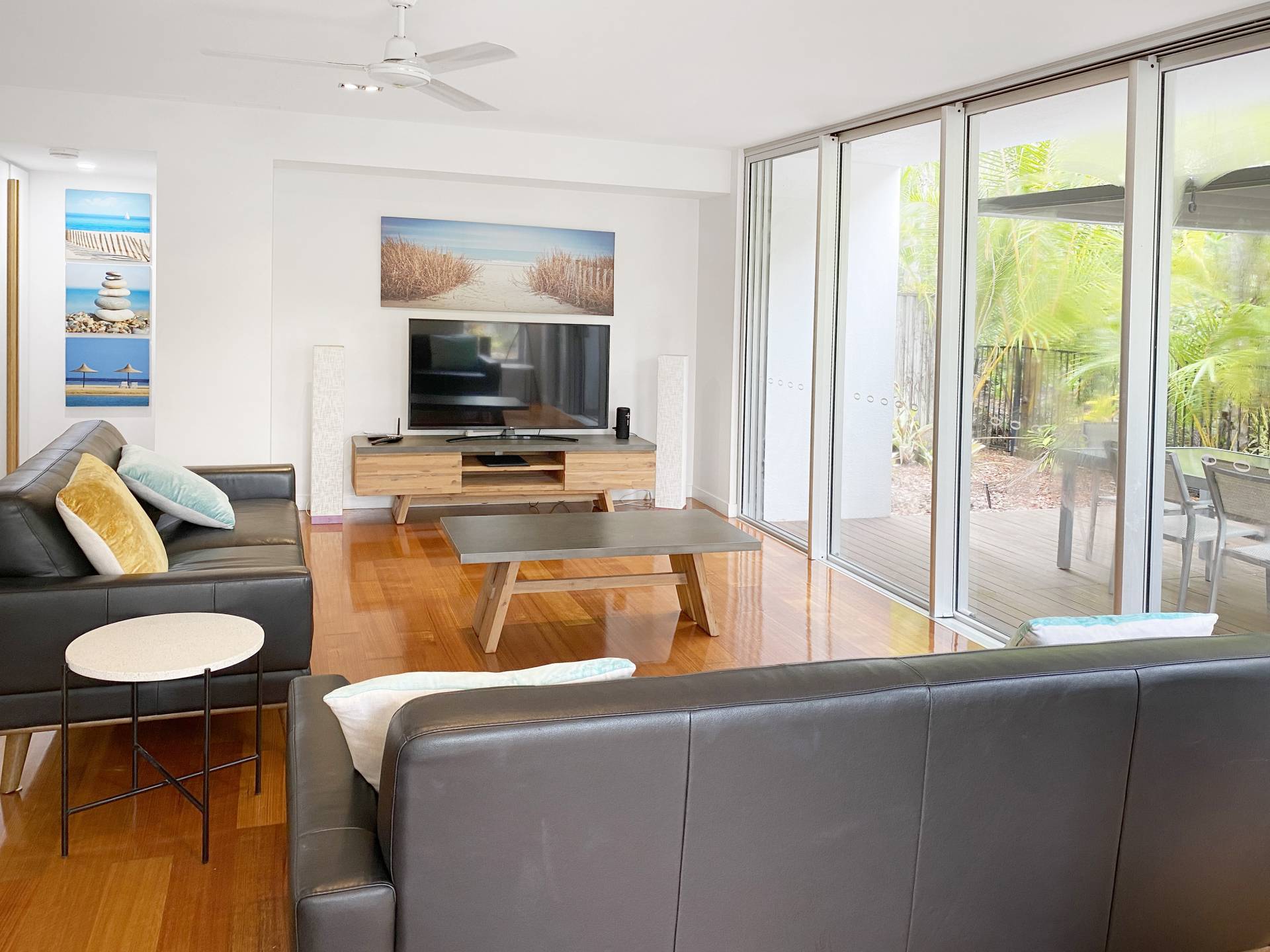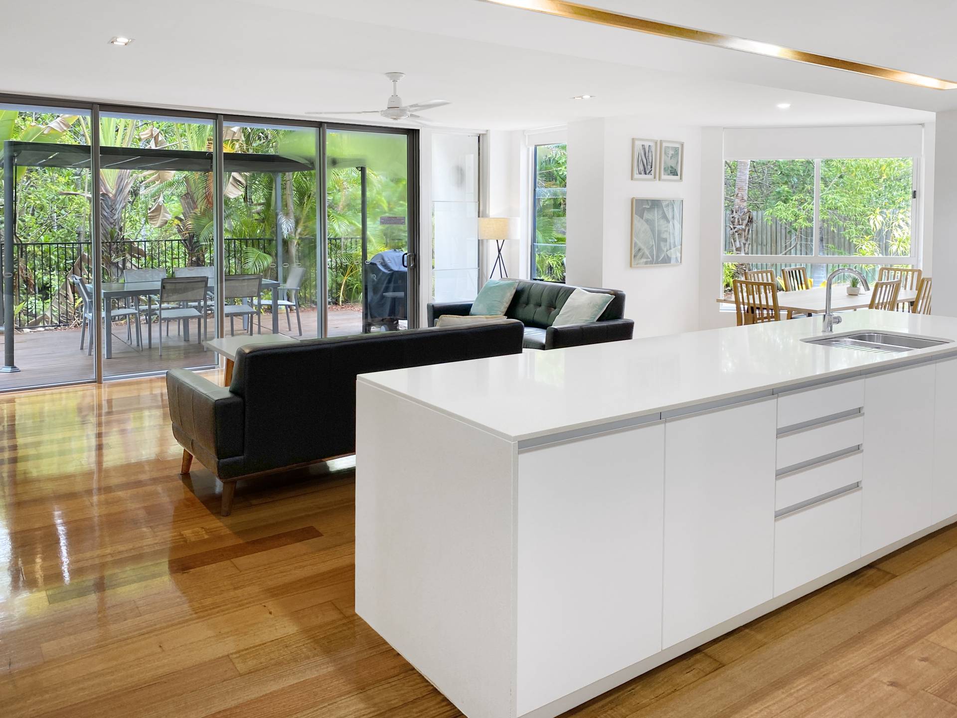 Maggies Apartment 2 takes a step back from the busy beachfront and is popular amongst holiday guests for its ground floor location with a 110m2 private exclusive use area courtyard garden with bush views to the tidal creek behind. Large glass sliding doors open up from the deck into the open-plan living area, with the kitchen, lounge and dining all enjoying lovely garden views. Step out the front and you will see the beach just across the road.
