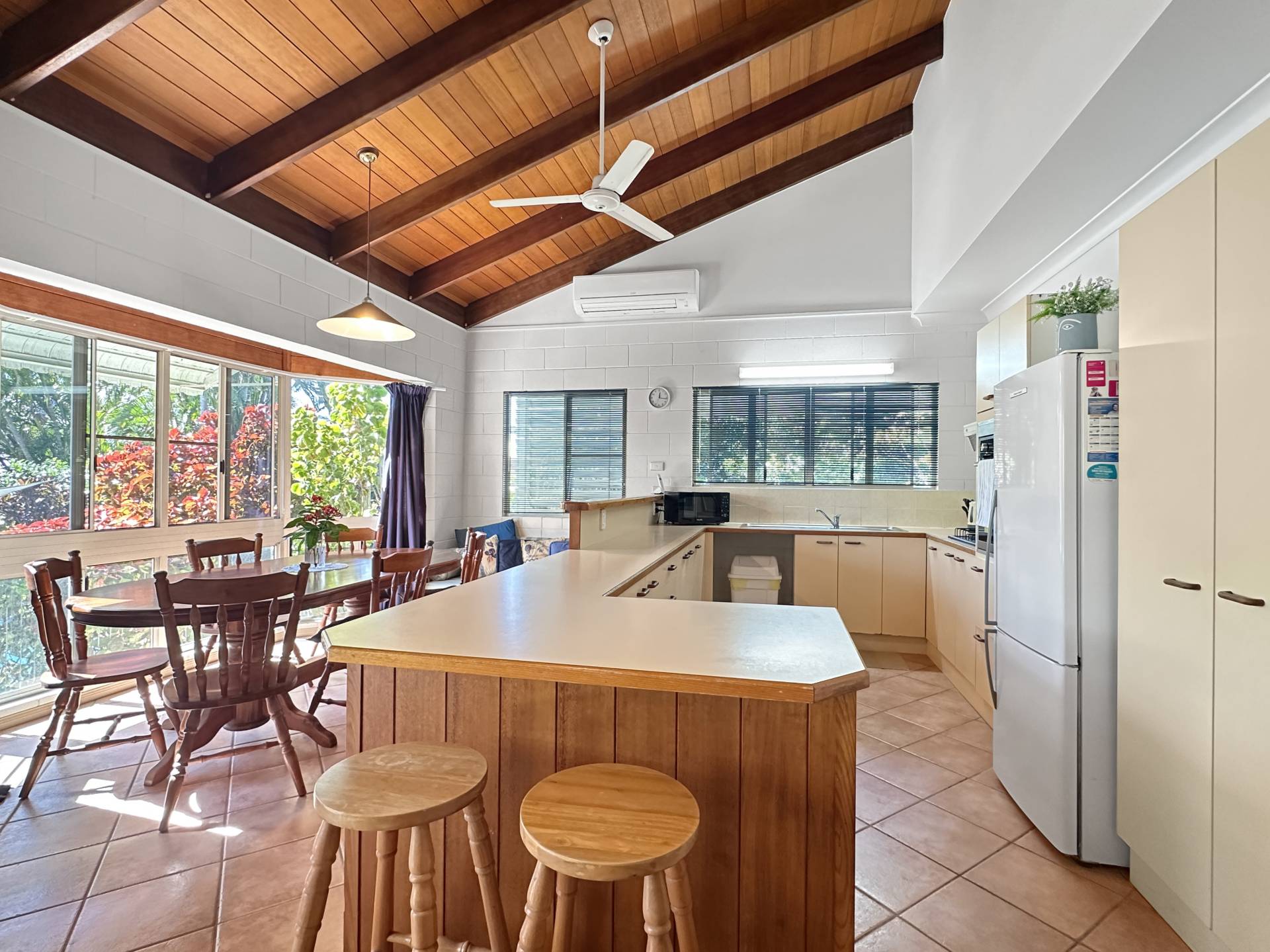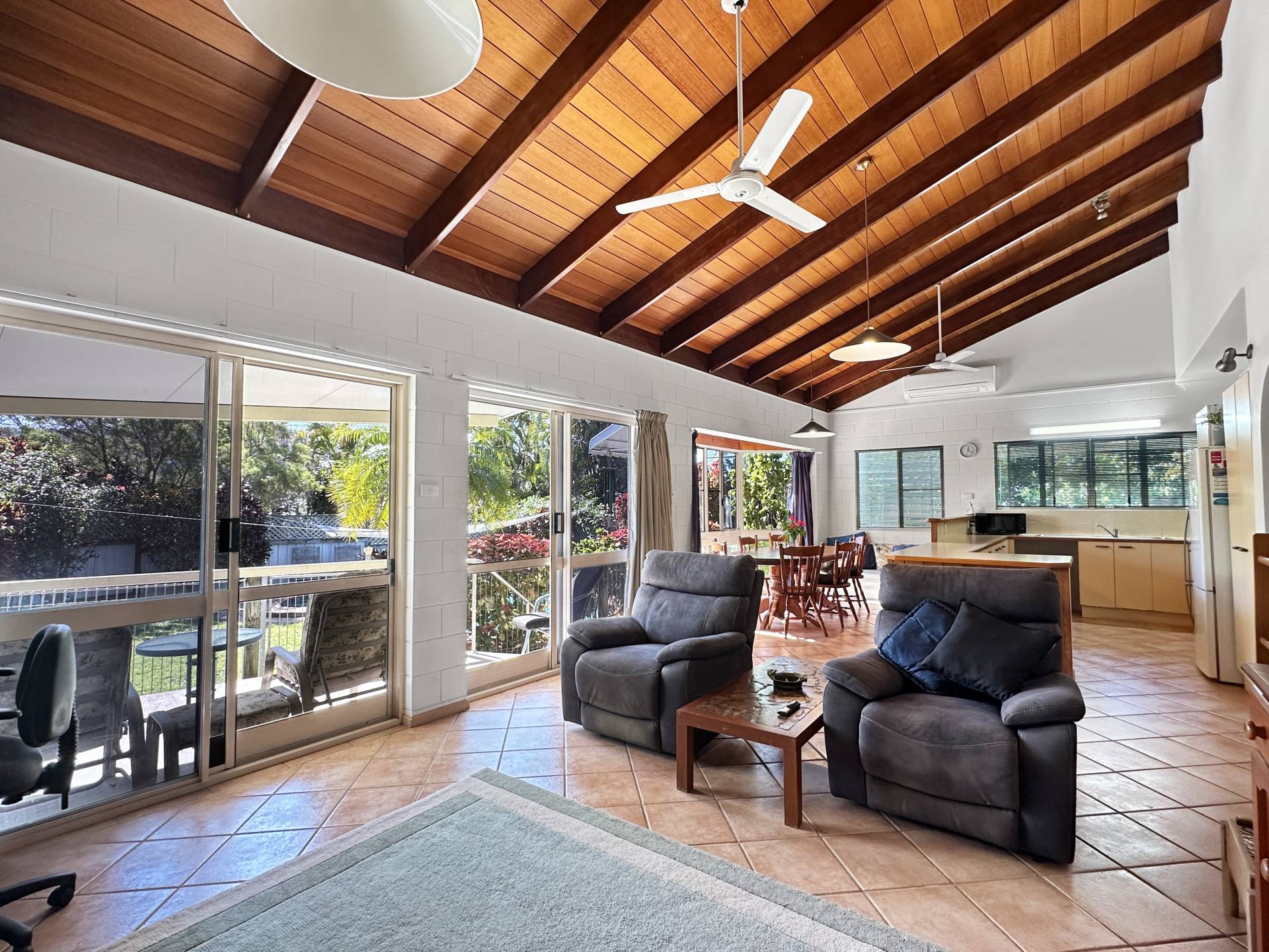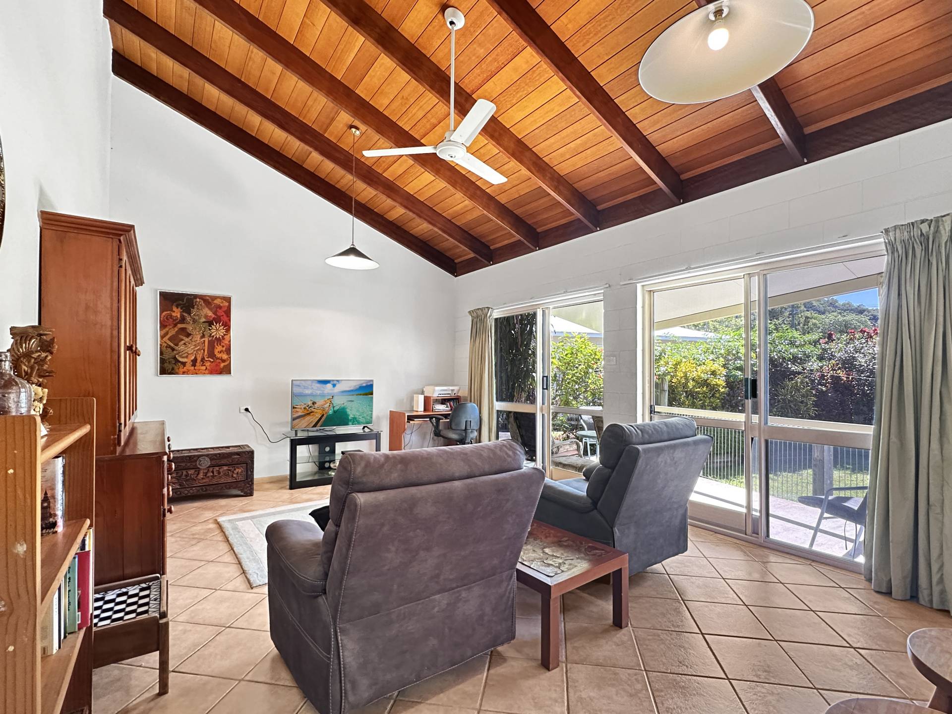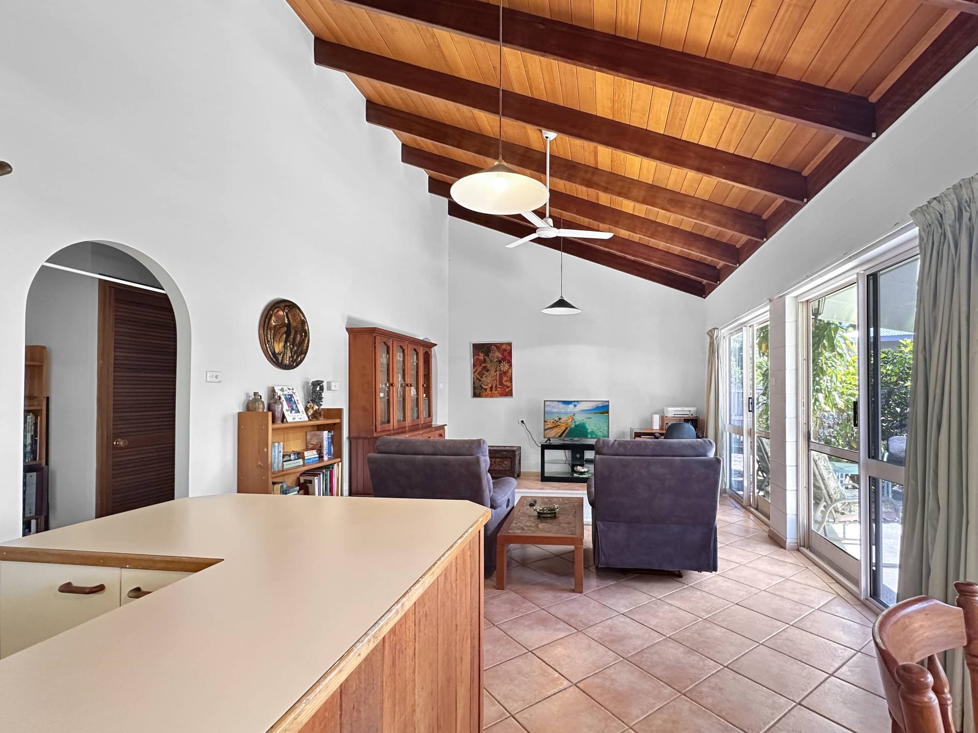 • Cathedral ceilings to the air-conditioned living area which is light and bright and opens onto the covered patio