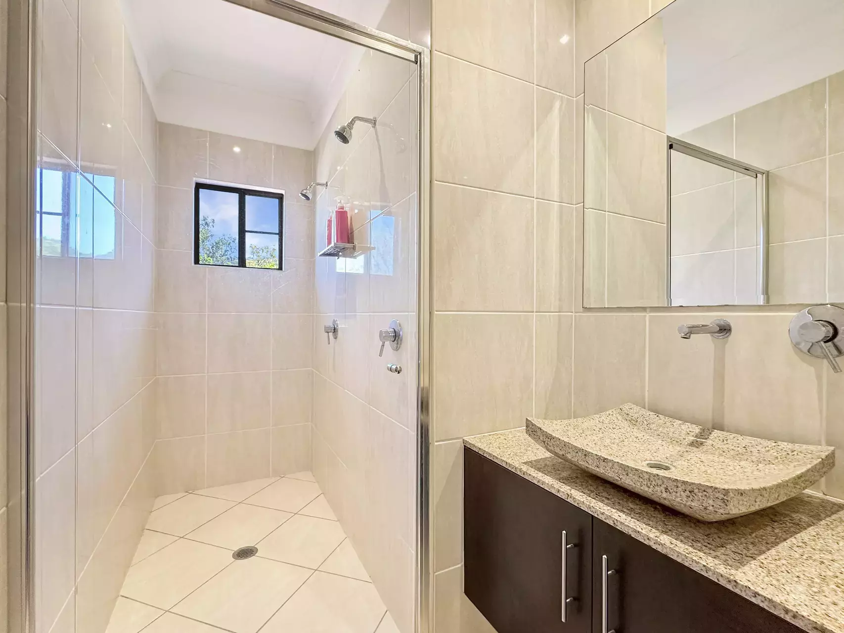 Upstairs you will find three bedrooms, all air-conditioned with built-in wardrobes. The master bedroom has a small balcony and ensuite with spa bath and shower over, which has access through to the two way toilet, and further double shower and vanity which also services bedrooms 2 & 3.