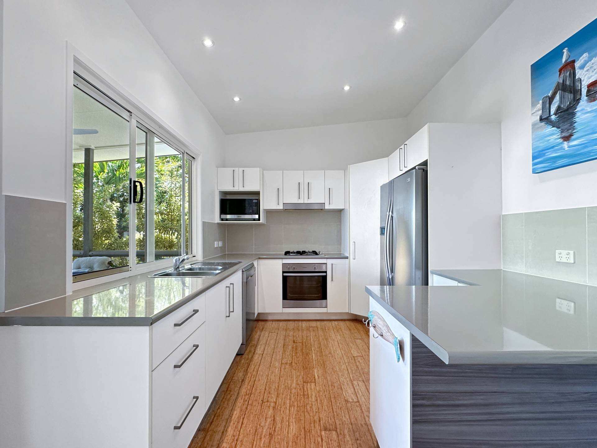 Step inside and enjoy the open-plan living with high ceilings, bamboo floors, and a seamless flow to the north-facing deck – the ideal spot to relax or entertain while overlooking lush tropical gardens and the inground magnesium pool. The modern kitchen features ample storage, stainless steel appliances, and connects effortlessly to the dining and living areas, with a servery window to the deck.