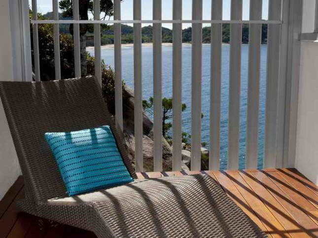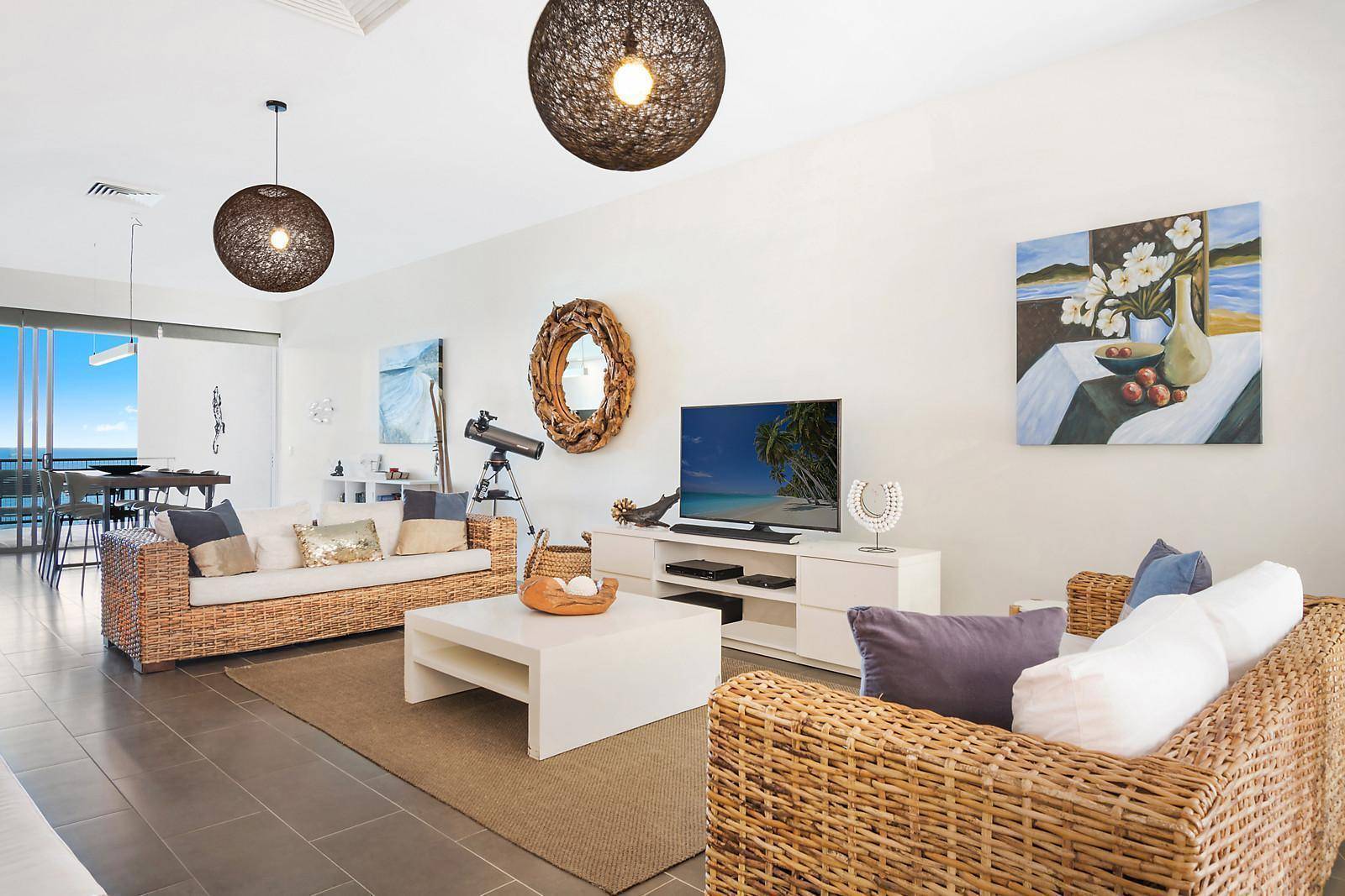 Entering the apartment brings you into the large 'beach room' open at one end to the rolling granite boulders that seemingly tumble down into the sea, whilst huge floor to ceiling glass doors pull your eyes through the bright open living area to the 180 degree ocean views beyond.