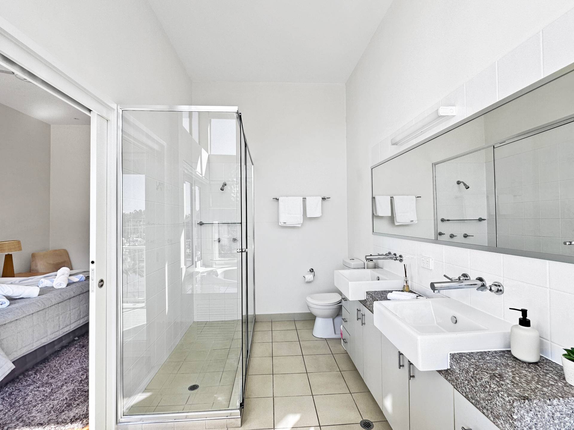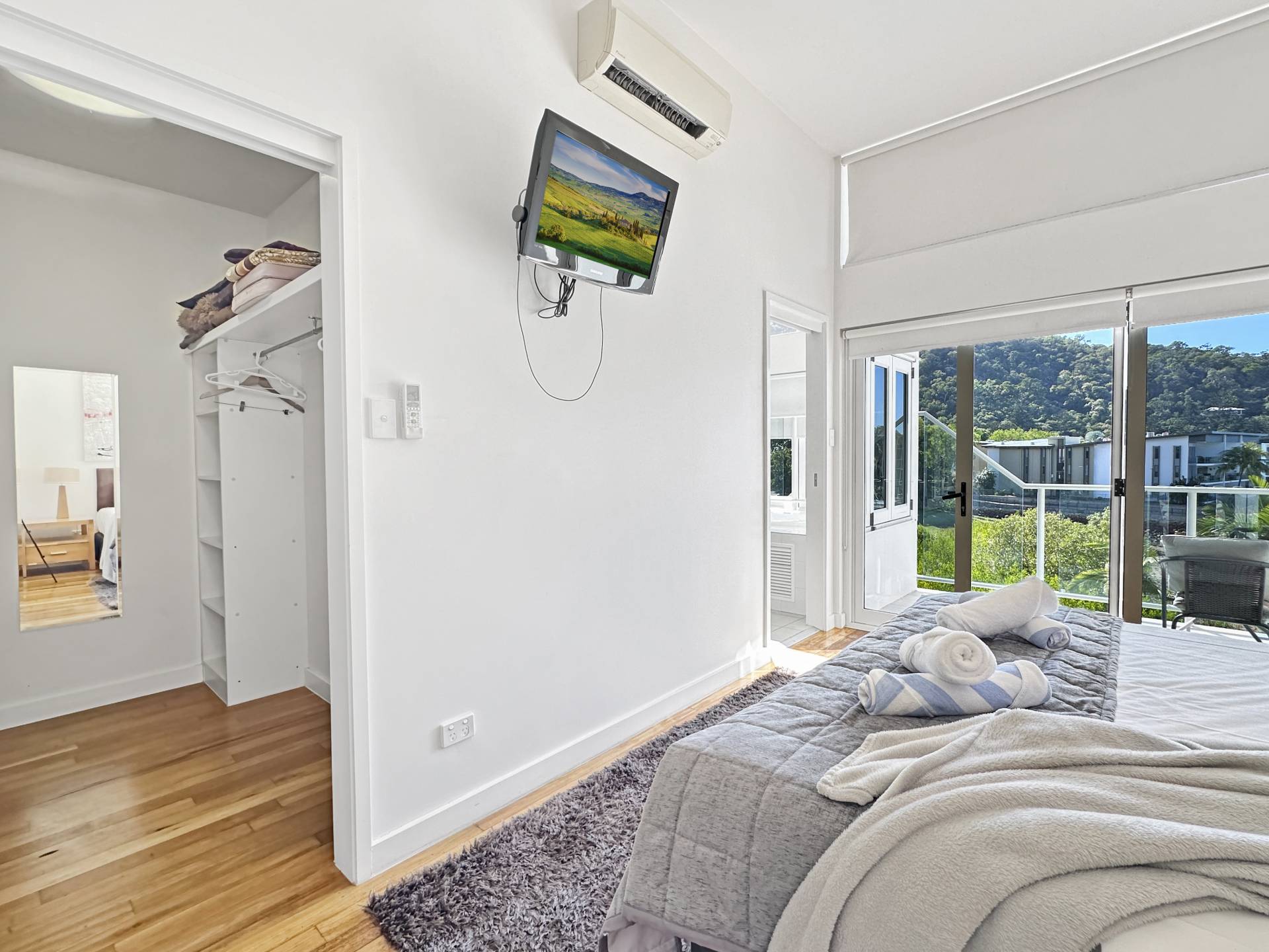 Upstairs, the spacious master bedroom opens onto a balcony with views over the marina and Coral Sea, and has a large walk-in wardrobe and ensuite bathroom with a luxurious spa bath, shower and his-and-hers vanities.