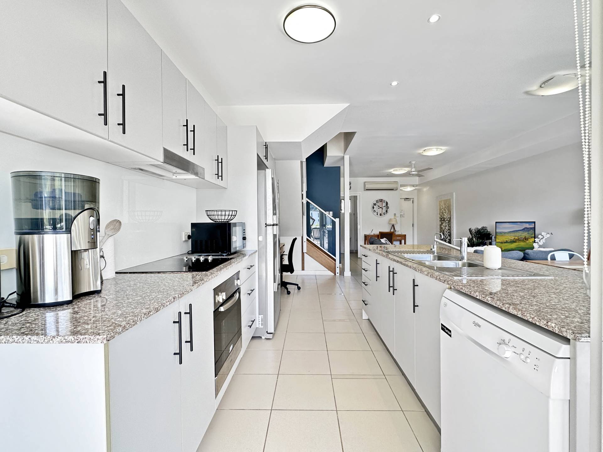 On entering the townhouse the open-plan living room flows through to the dining area, kitchen and out to the large covered balcony giving a lovely open feel. The modern kitchen features granite benchtops and plenty of cupboard and bench space and is designed to cater for indoor or outdoor entertaining. This level also has a large lockable store-cupboard, laundry and convenient toilet with handbasin.