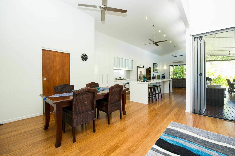 * open-plan living with lots of doors and louvres to bring the outside in and soaring ceiling to give a feeling of space and light