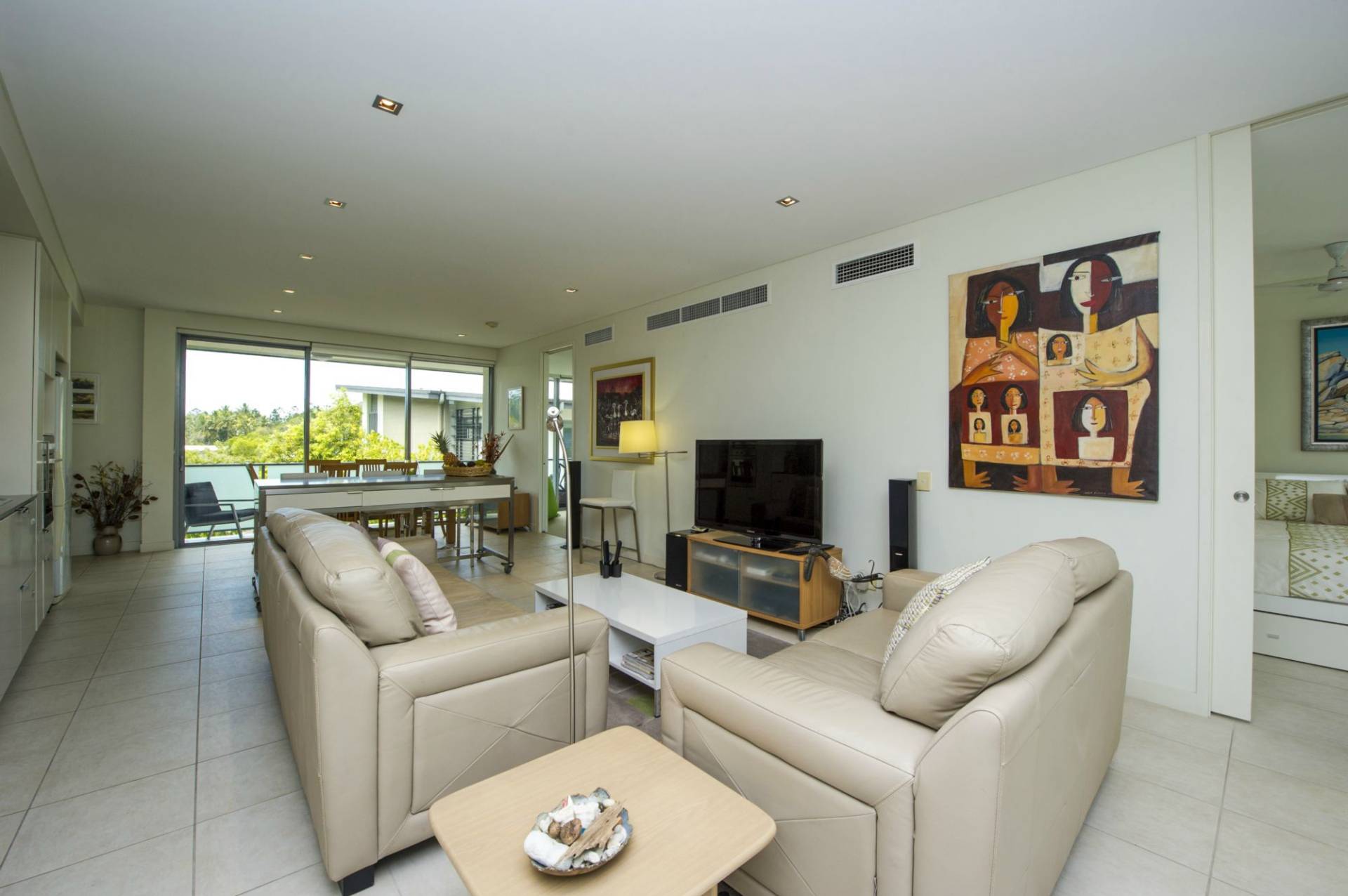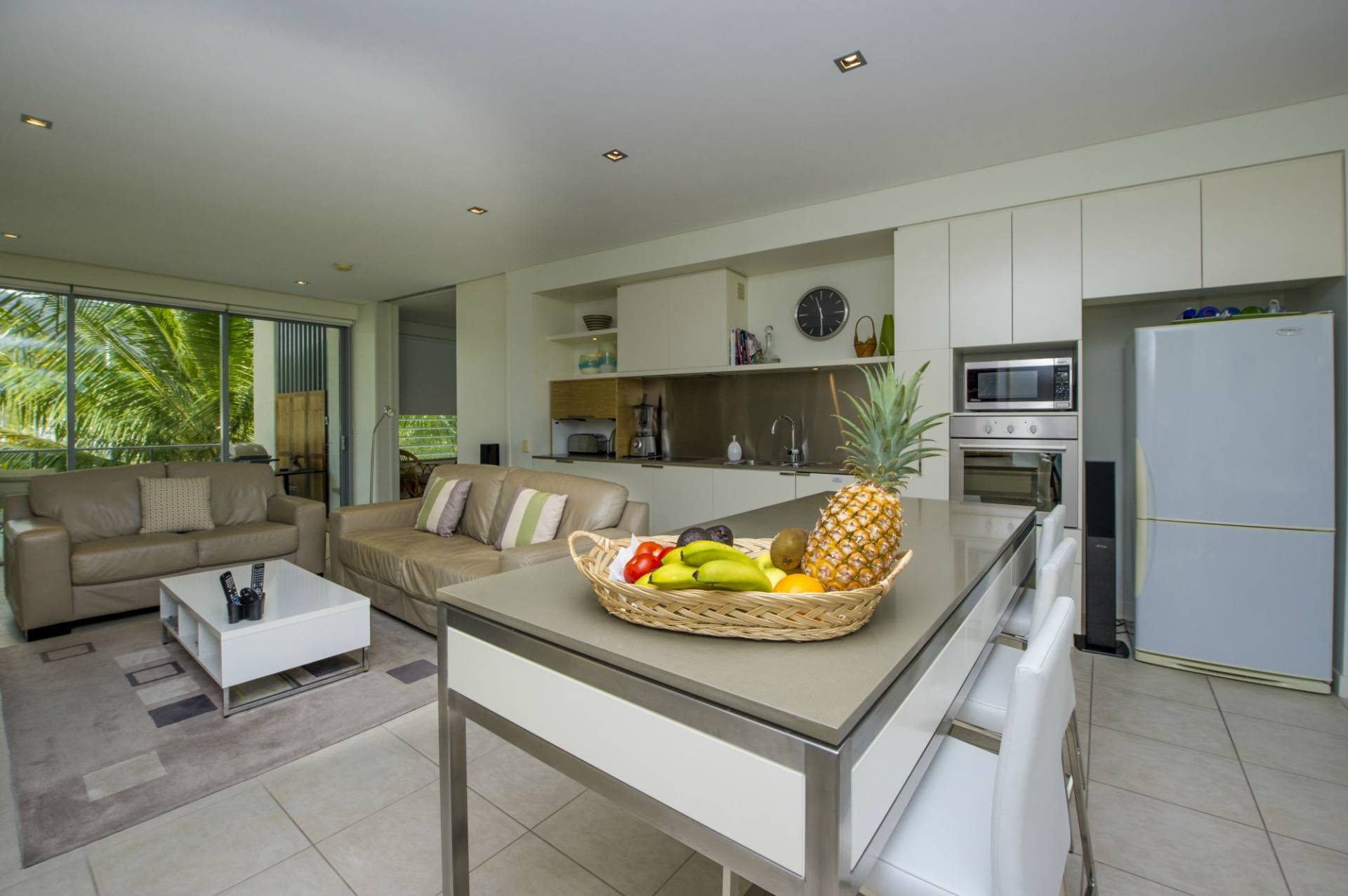 The apartment is offered fully furnished, ready to move into or let out, or simply as your private Island getaway. The open-plan living area opens up through floor-to-ceiling glass doors at either end onto spacious covered verandahs allowing the cross-breeze to flow through and bringing plenty of light in.