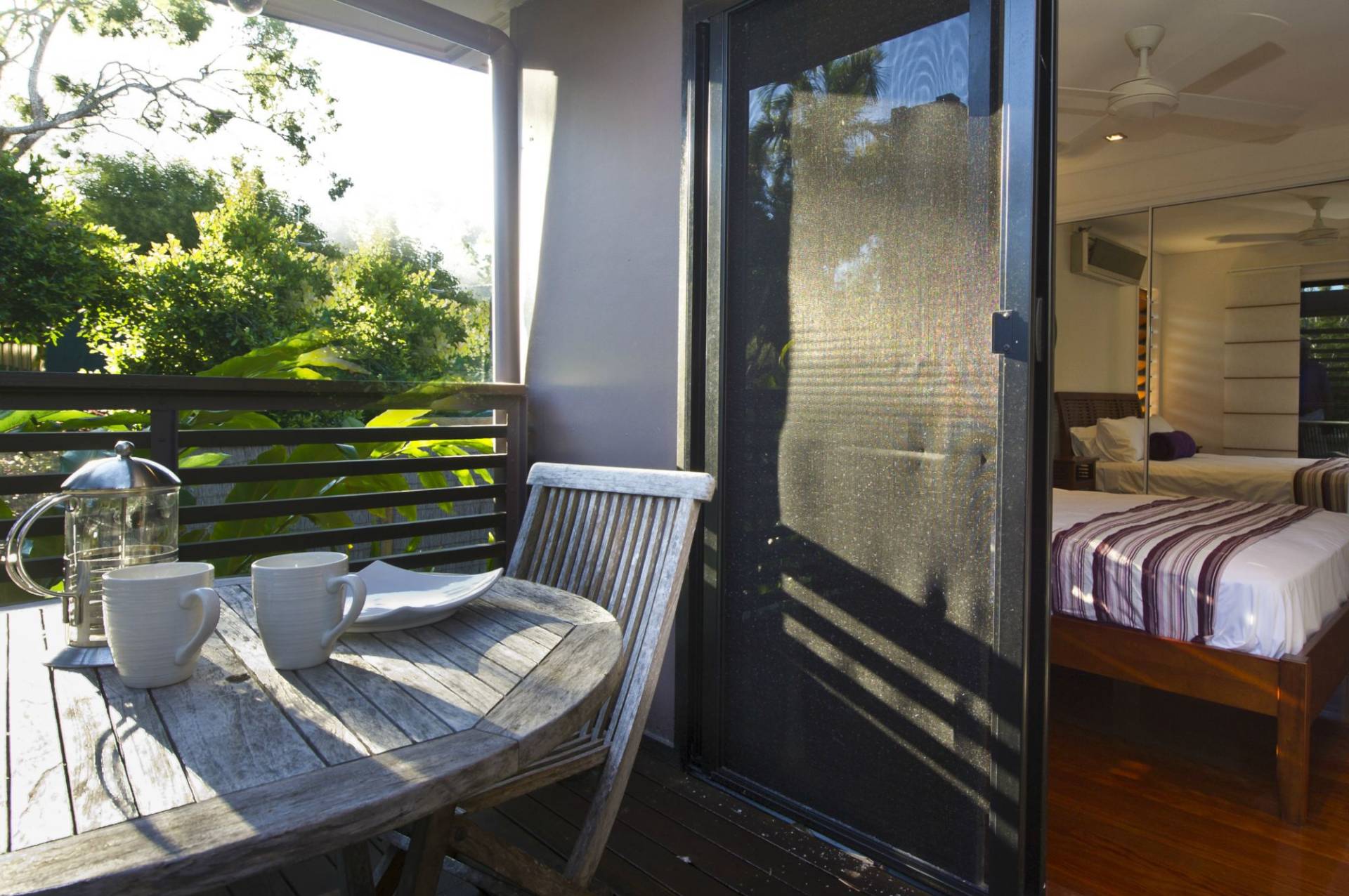 * Master bedroom with its own very private deck, built-in-wardrobes and louvred windows to allow the breeze to flow through