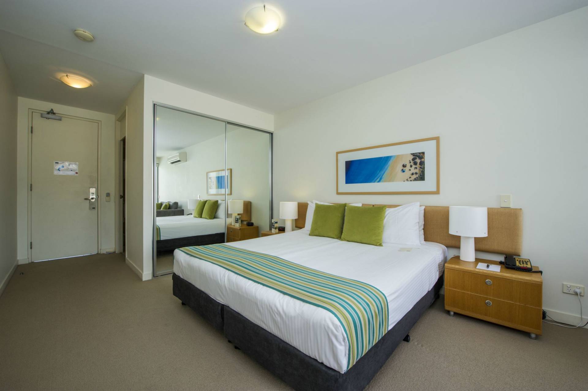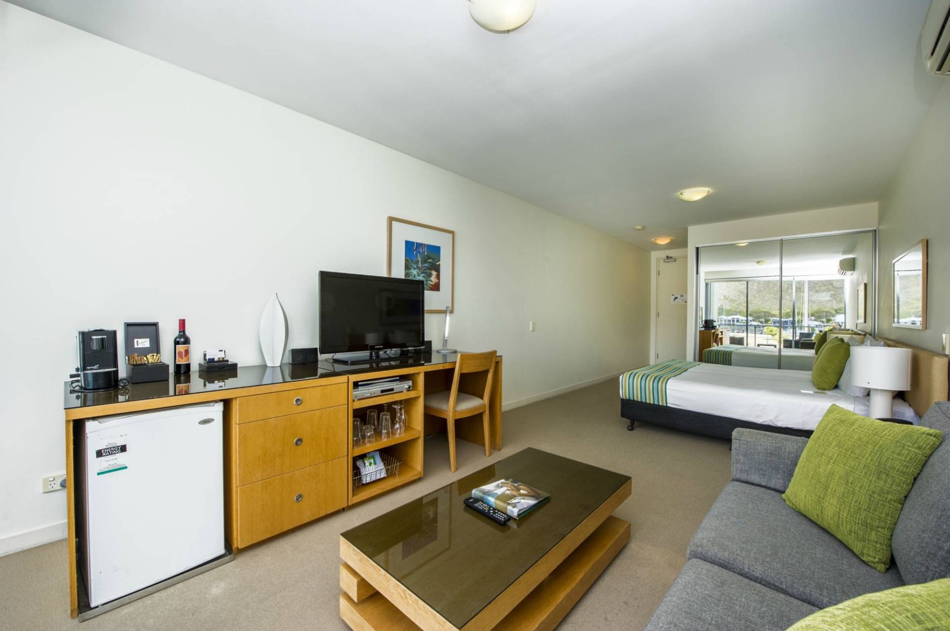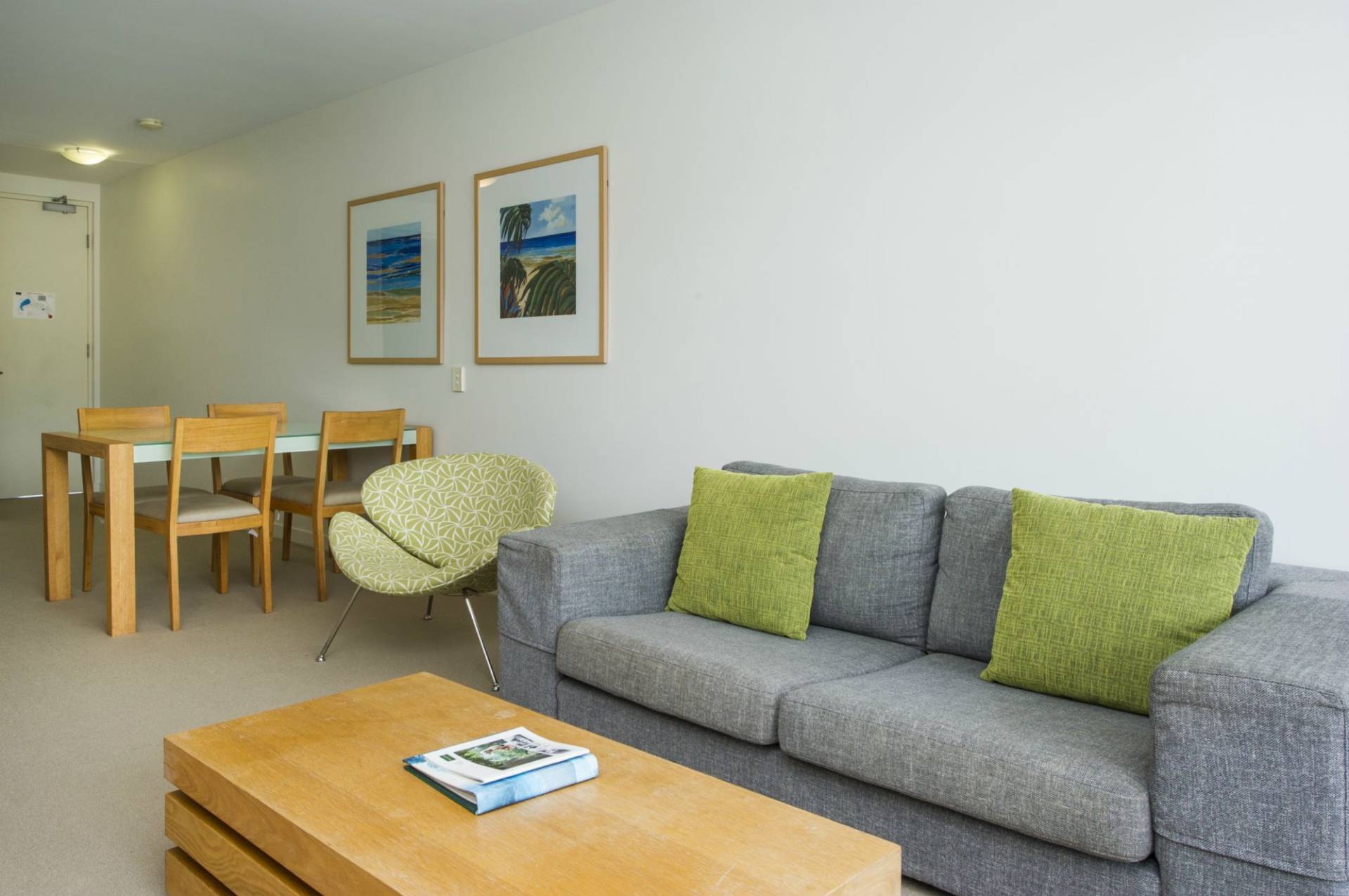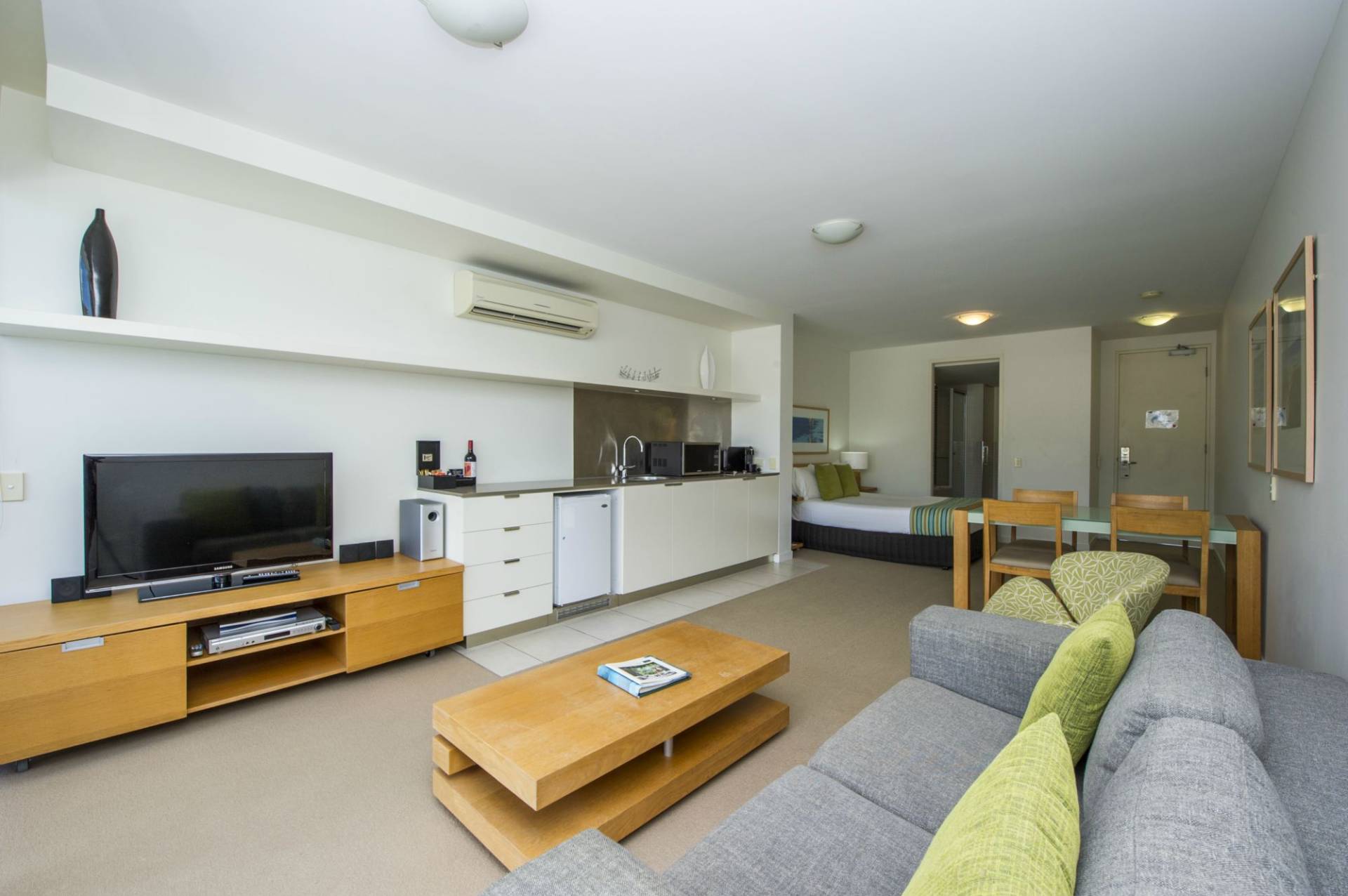 * The larger studio unit is comfortable for longer stays with a kitchenette, dining area, lounge, bathroom and laundry. Floor to ceiling glass doors open onto the balcony with its beautiful water views.