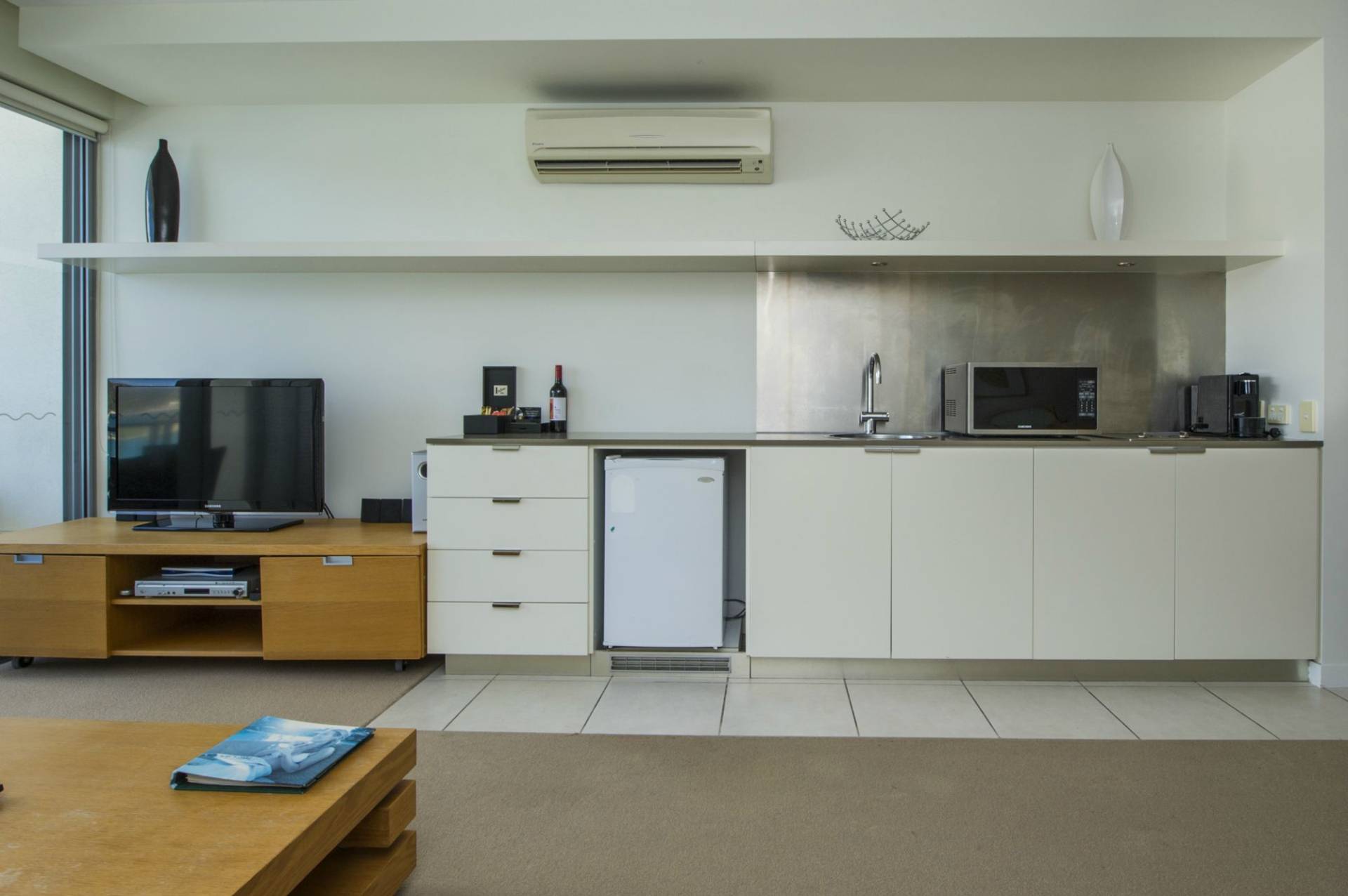 * The hotel-style second studio unit also has a lounge area and balcony as well as its own bathroom. The divider between the two balconies can be opened up to use the property as a two bedroom, two bathroom apartment.