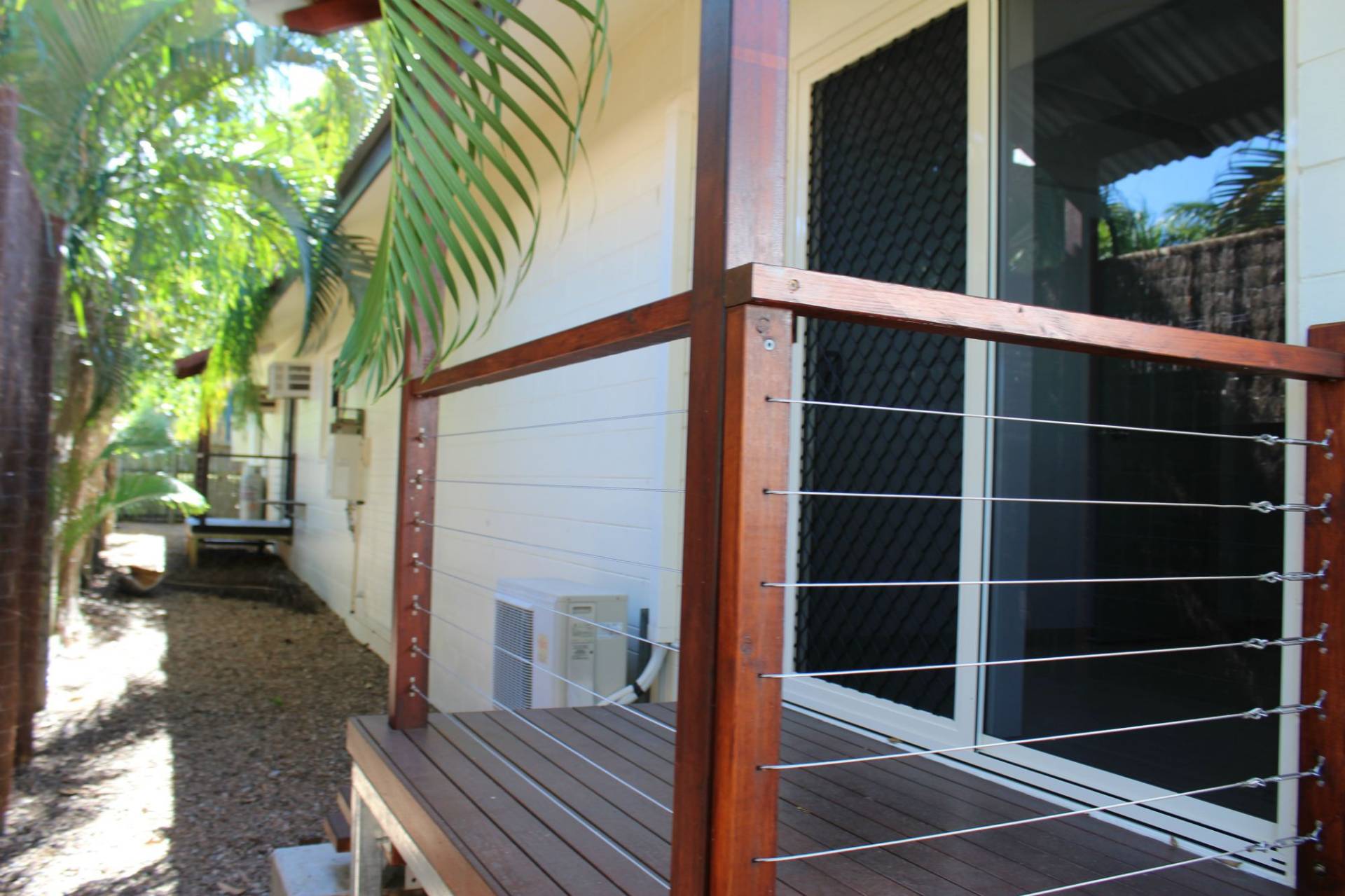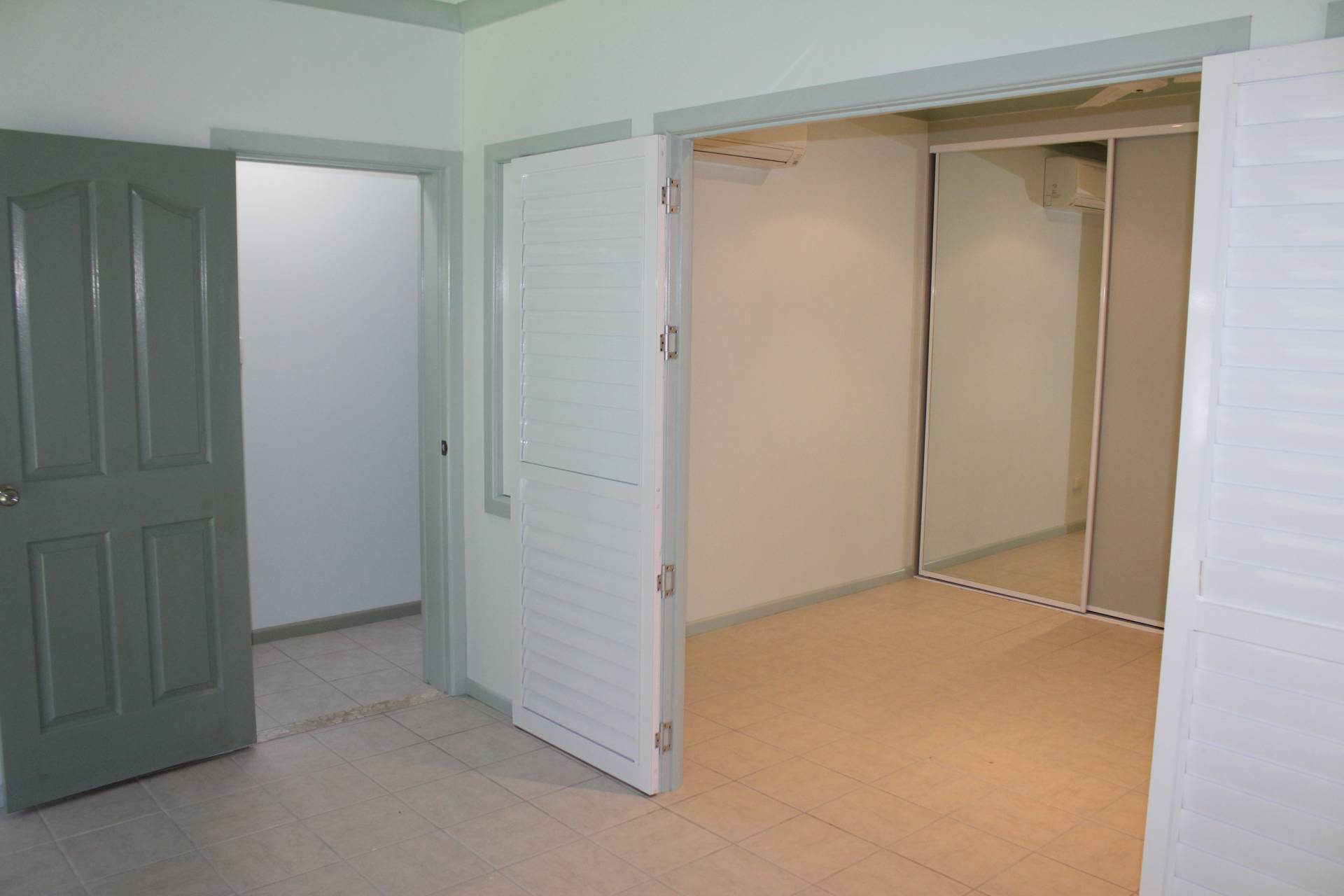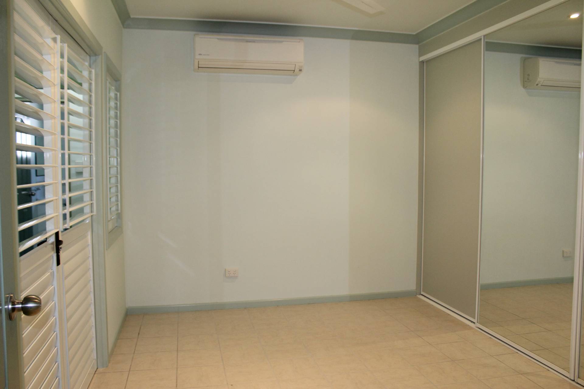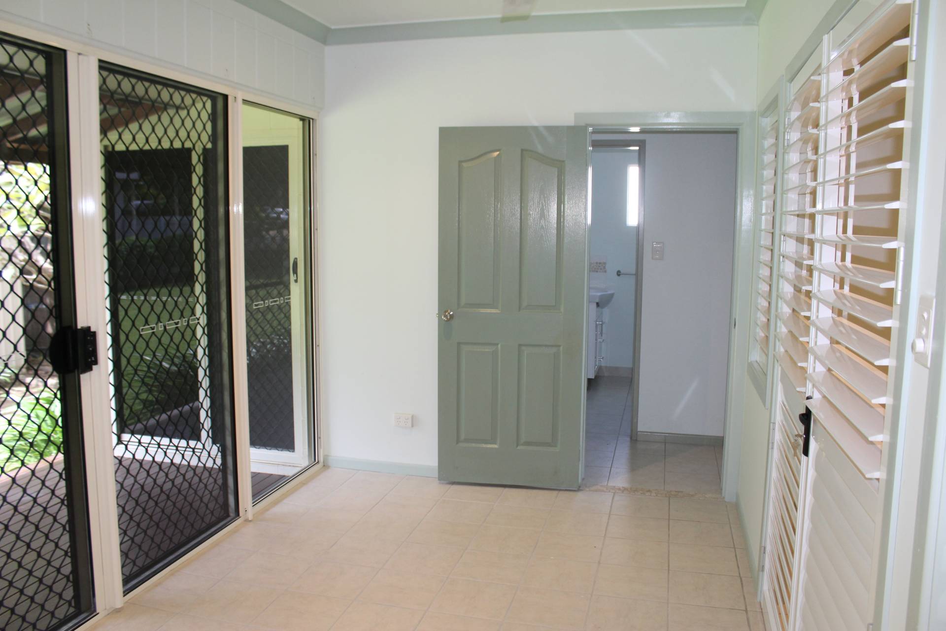 * The master bedroom has huge built-in-wardrobes, air-con and ceiling fan with shuttered doors and windows that can be opened up for light and air or closed up for privacy. These doors open onto the study/hallway which in turn opens onto a covered deck that adjoins the patio that runs the length of the living area.