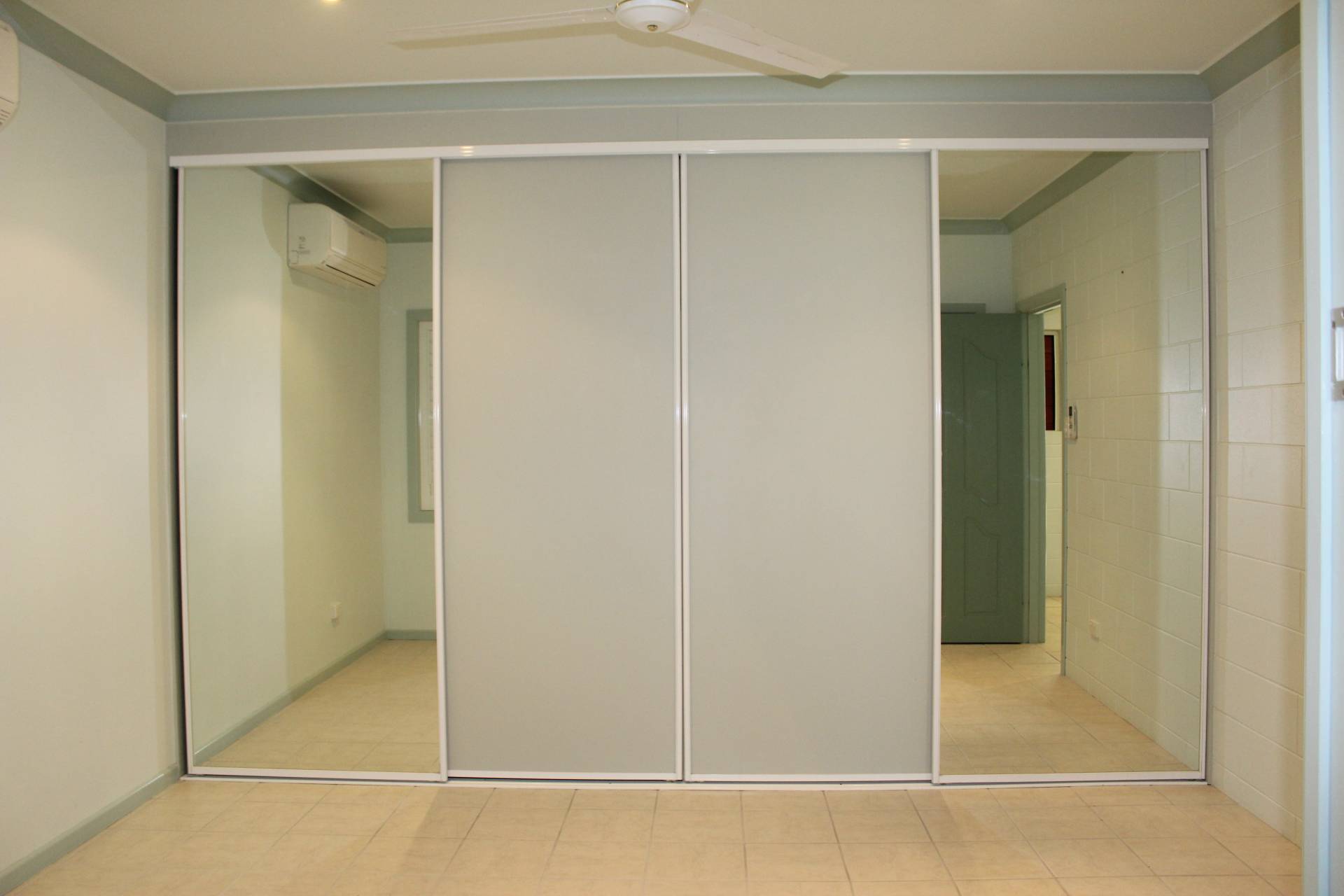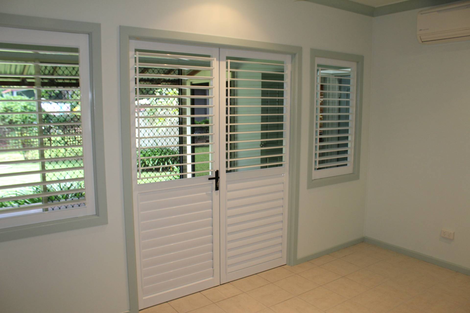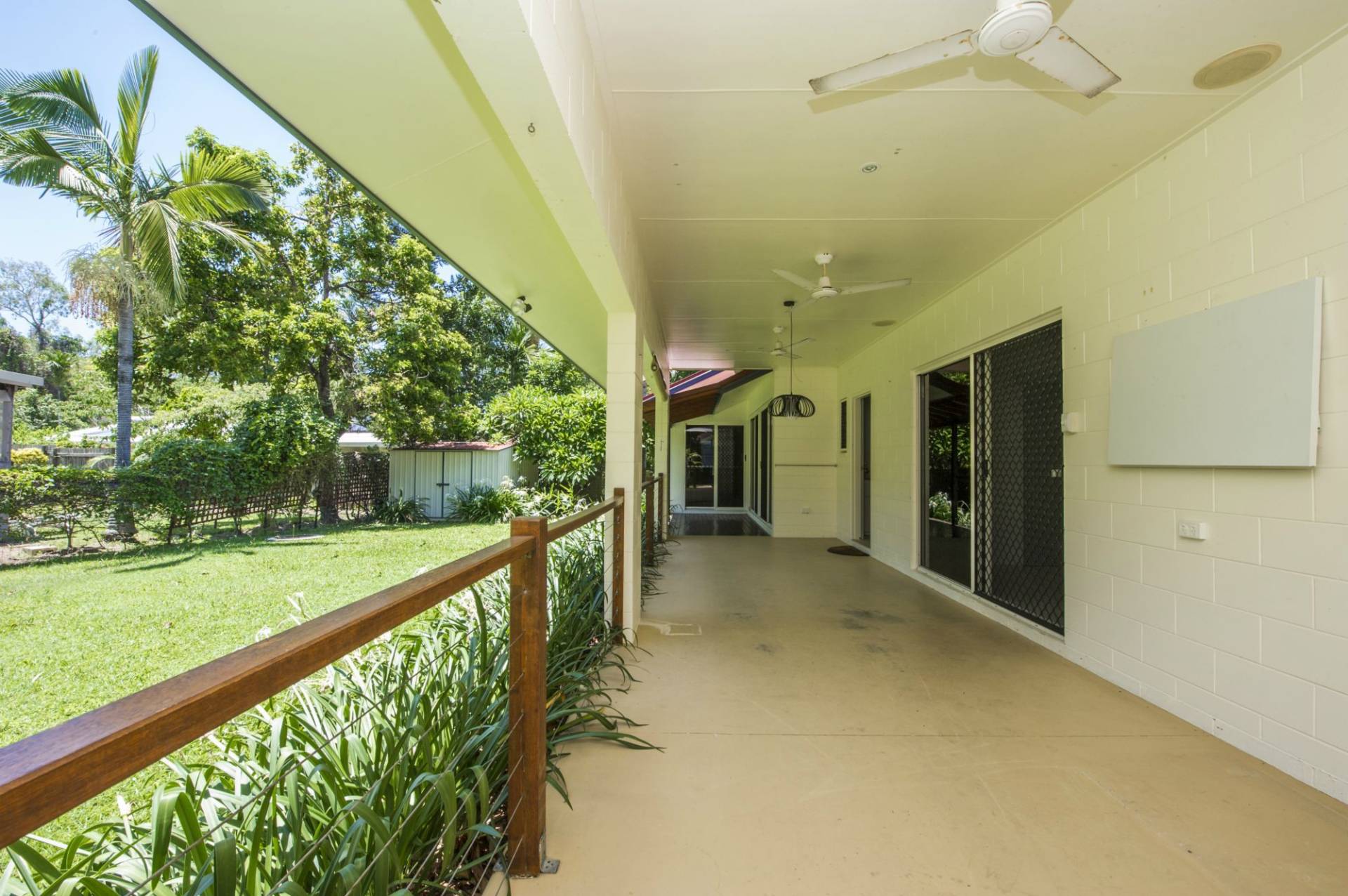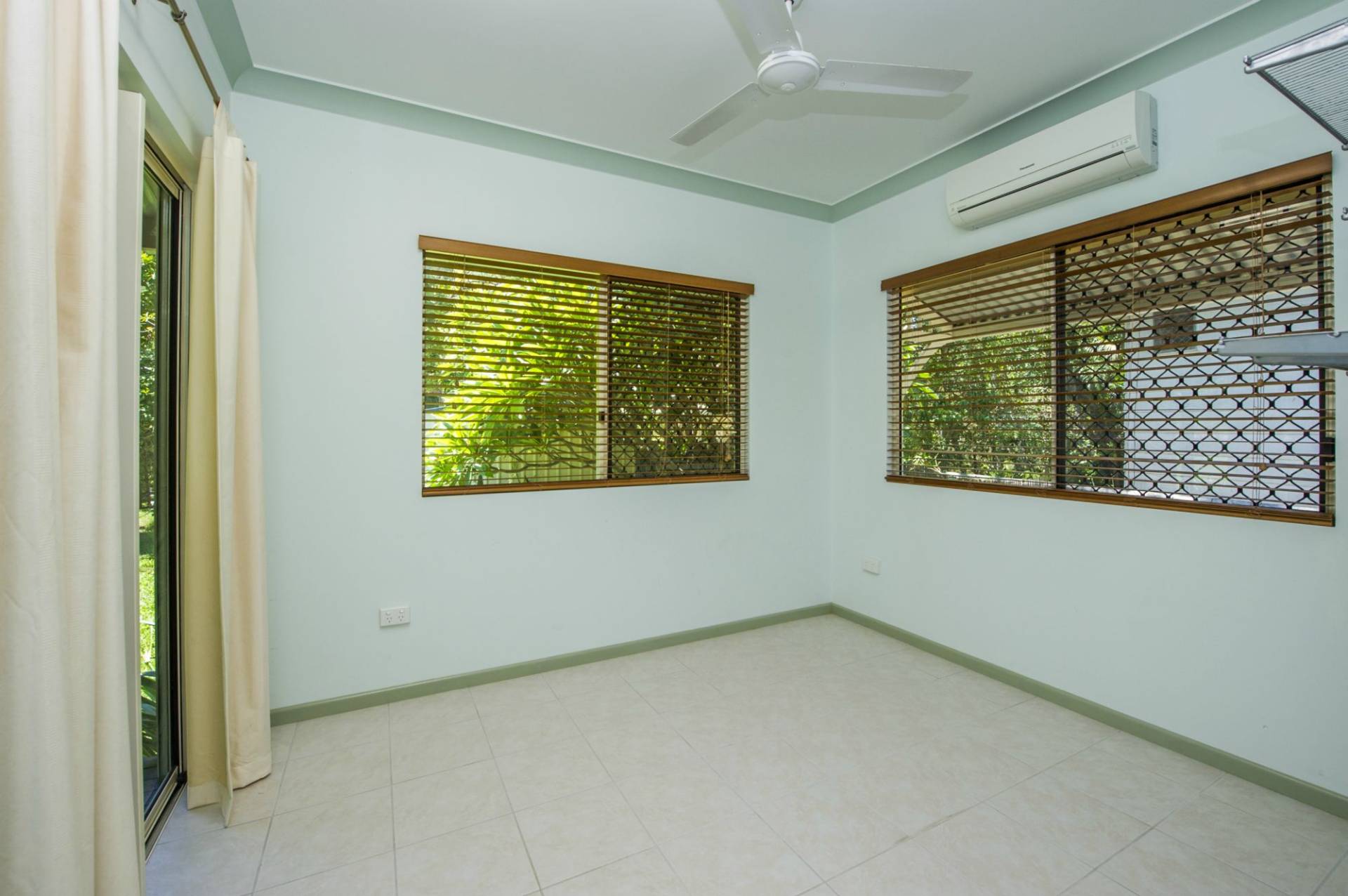 * The master bedroom has huge built-in-wardrobes, air-con and ceiling fan with shuttered doors and windows that can be opened up for light and air or closed up for privacy. These doors open onto the study/hallway which in turn opens onto a covered deck that adjoins the patio that runs the length of the living area.