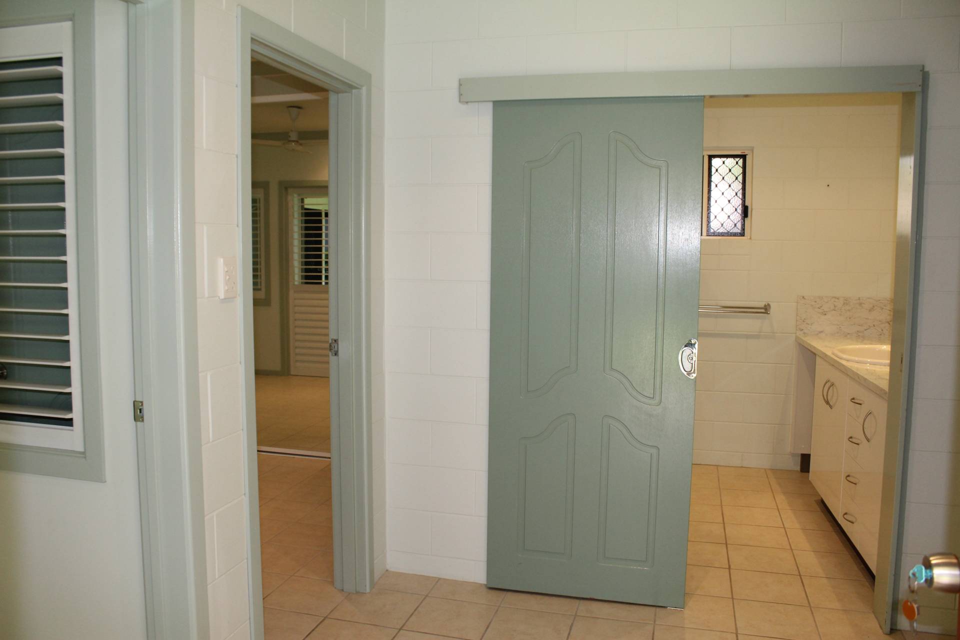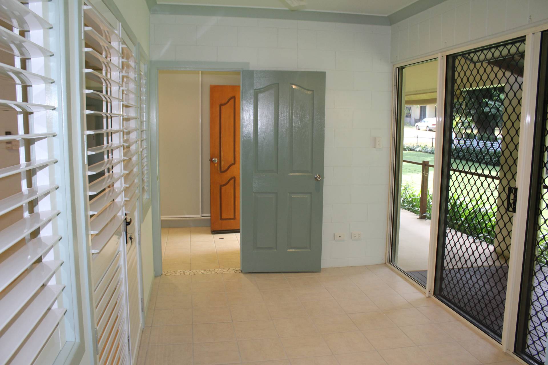 * The entry hall contains a large linen press and connects the living with the bathroom/laundry, master bedroom and study/hallway that leads to further bedrooms and another bathroom.