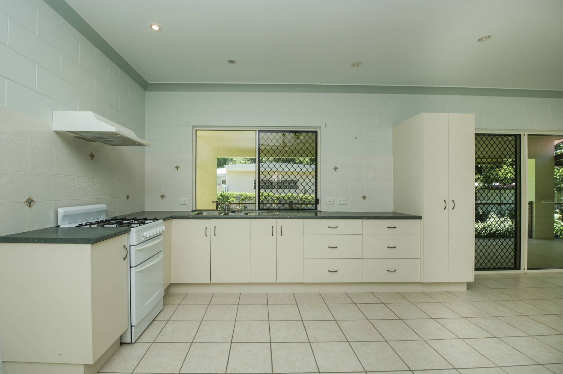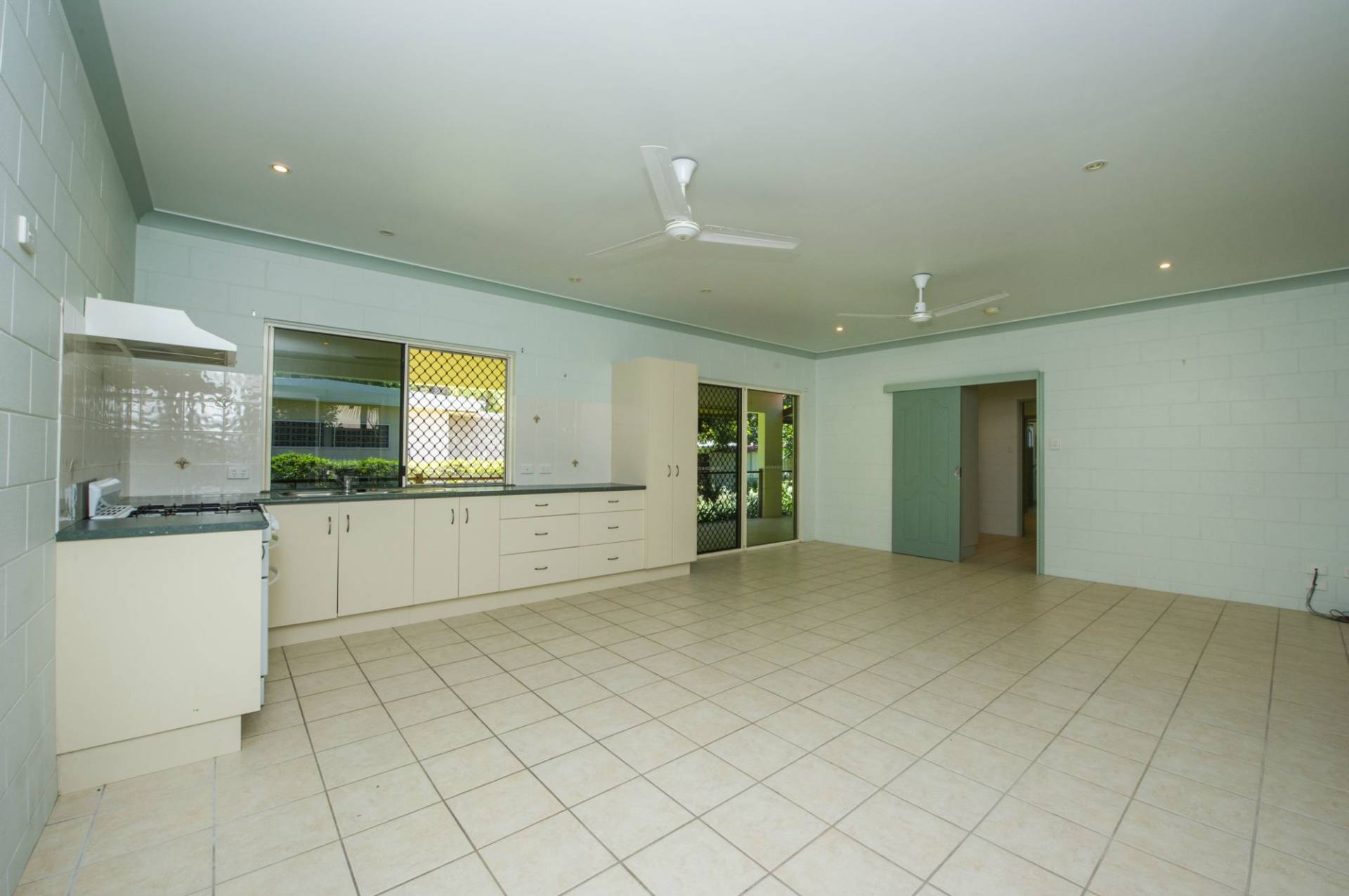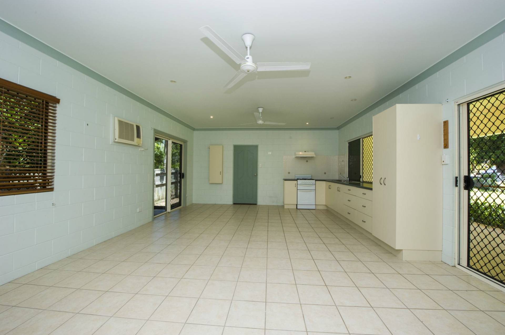 * Open-plan living area with kitchen and plenty of space for lounge and dining with sliding glass doors onto the covered side patio which overlooks the garden. Security screened windows and ceiling fans as well as glass sliding doors also to the rear ensure excellent cross-ventilation, meaning the air-con is rarely used.