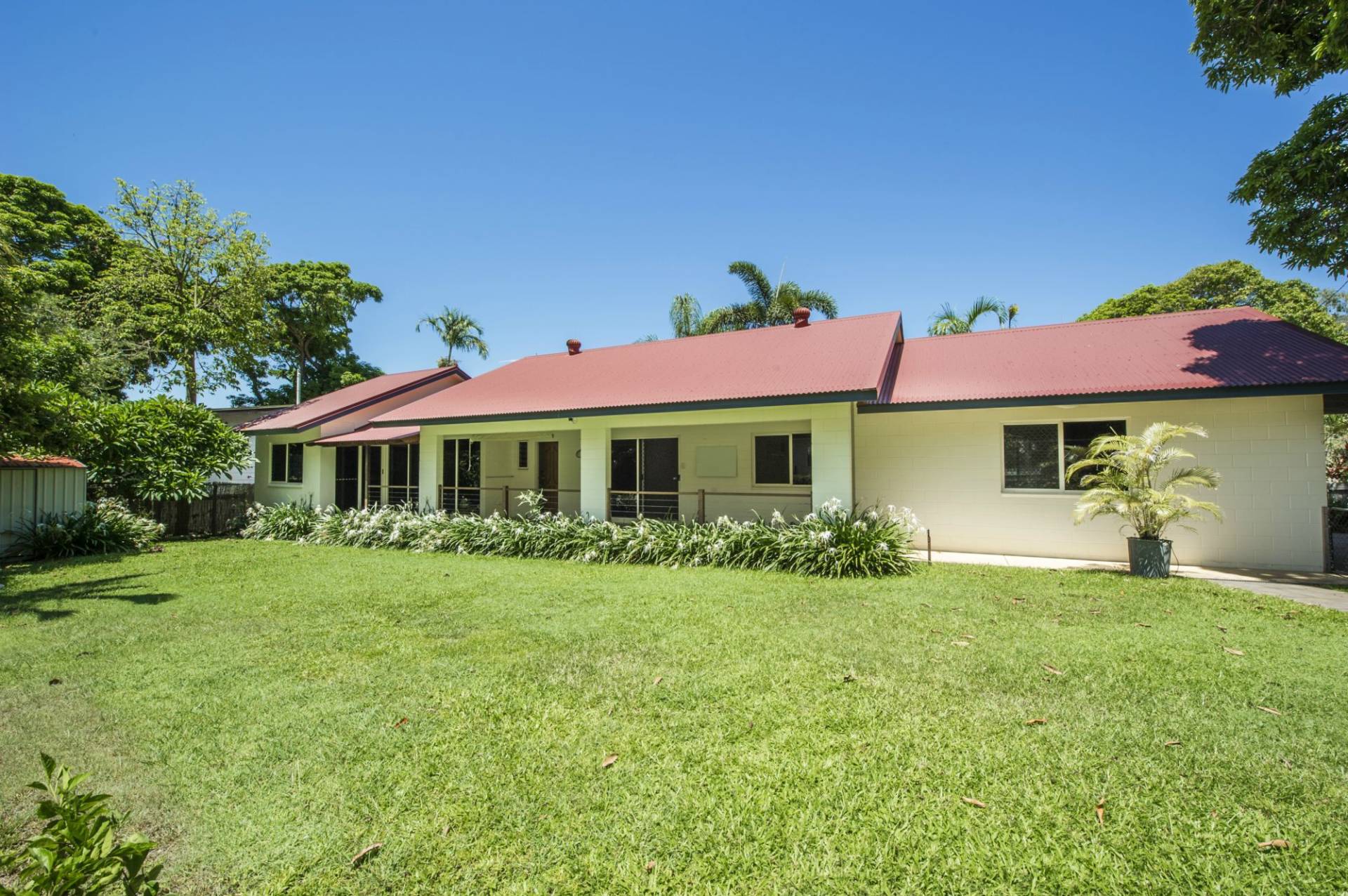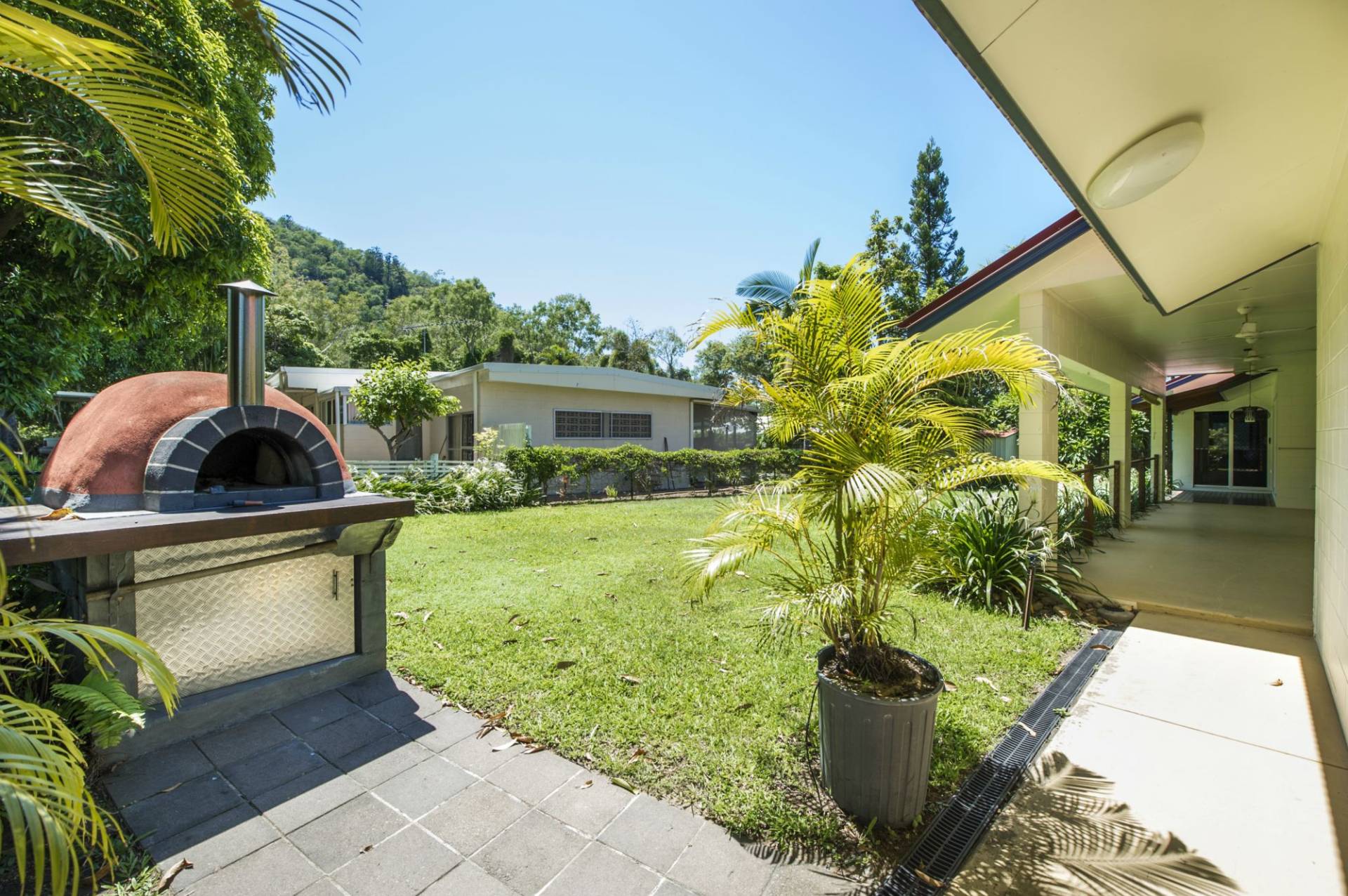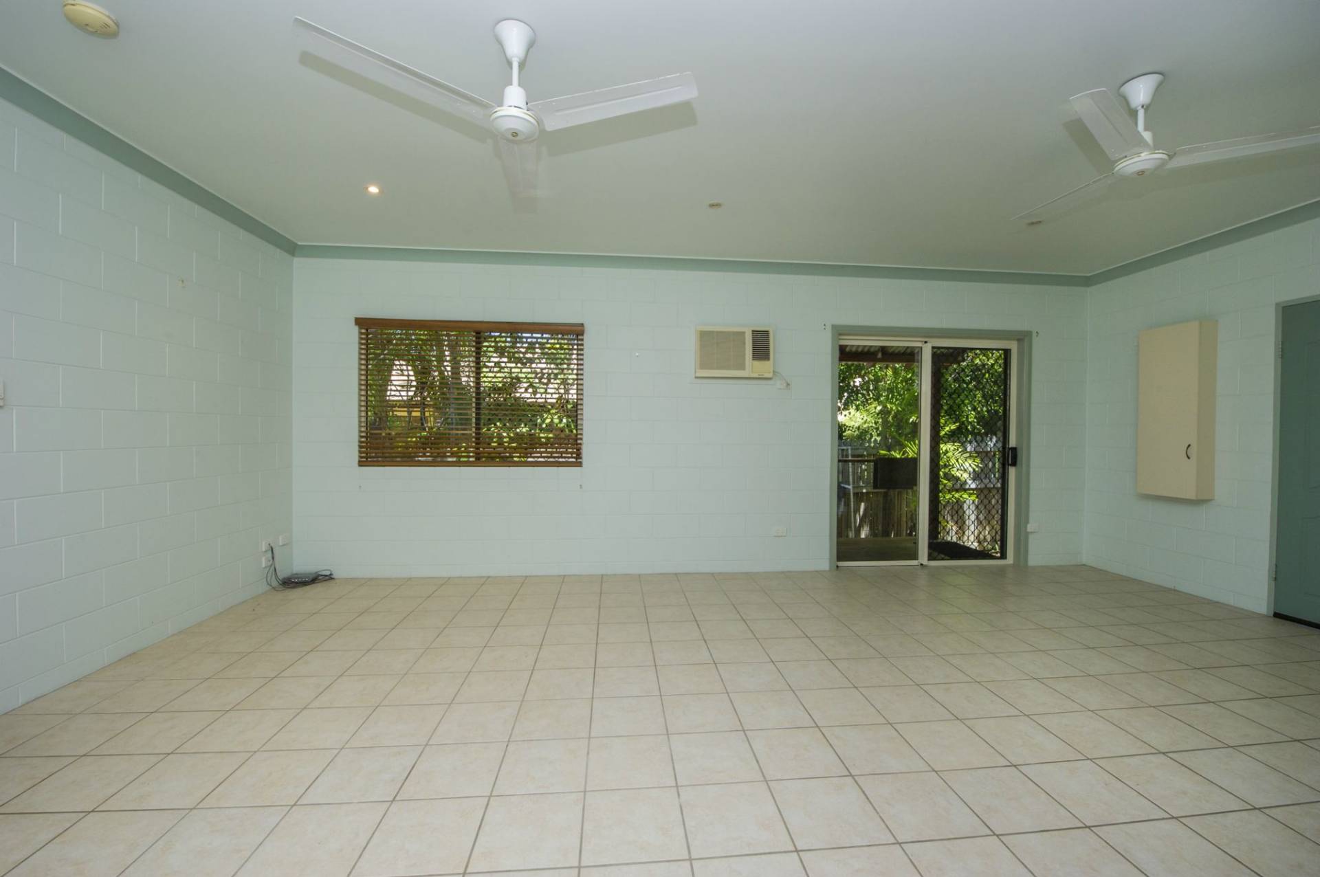 * Open-plan living area with kitchen and plenty of space for lounge and dining with sliding glass doors onto the covered side patio which overlooks the garden. Security screened windows and ceiling fans as well as glass sliding doors also to the rear ensure excellent cross-ventilation, meaning the air-con is rarely used.