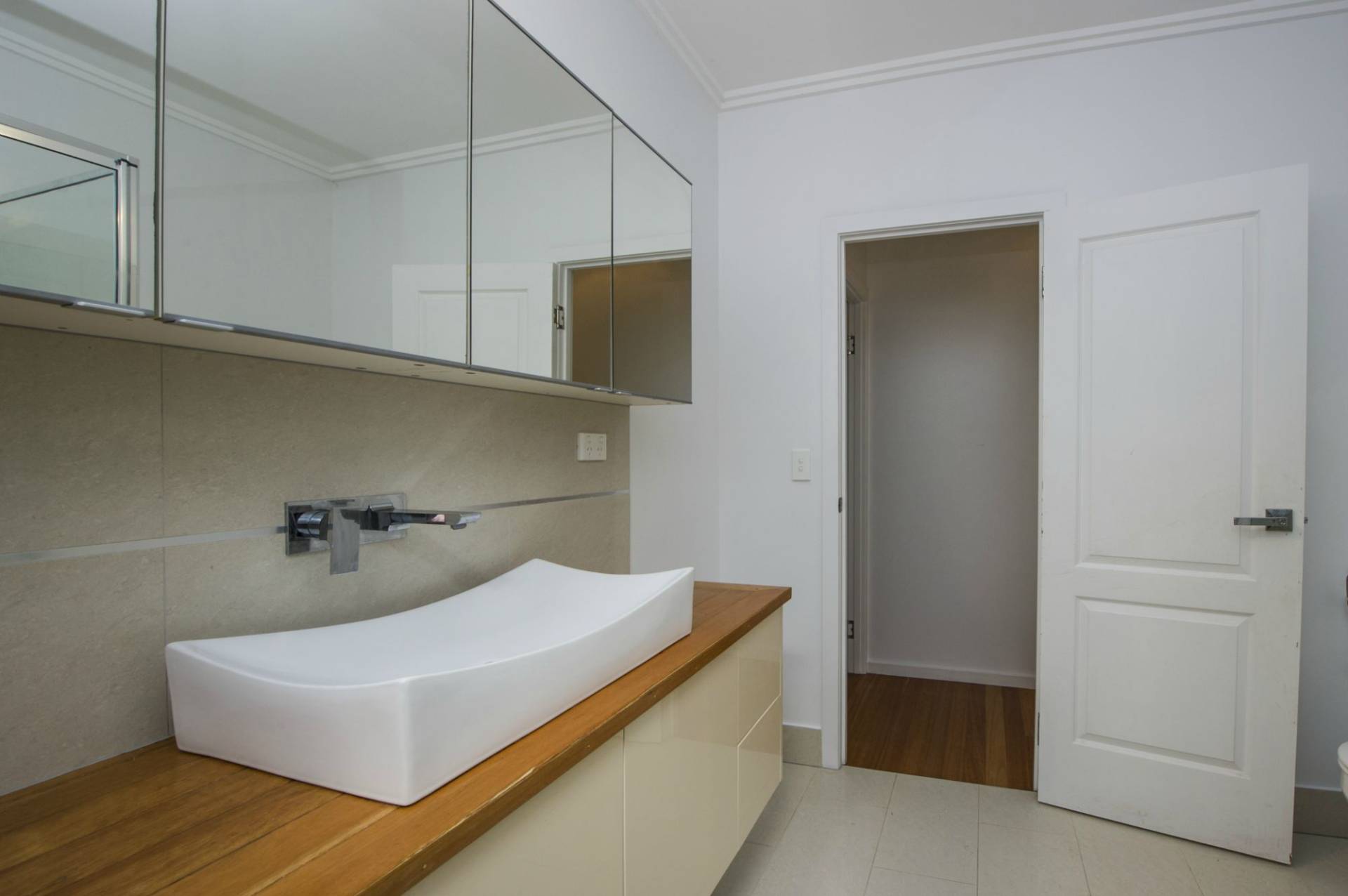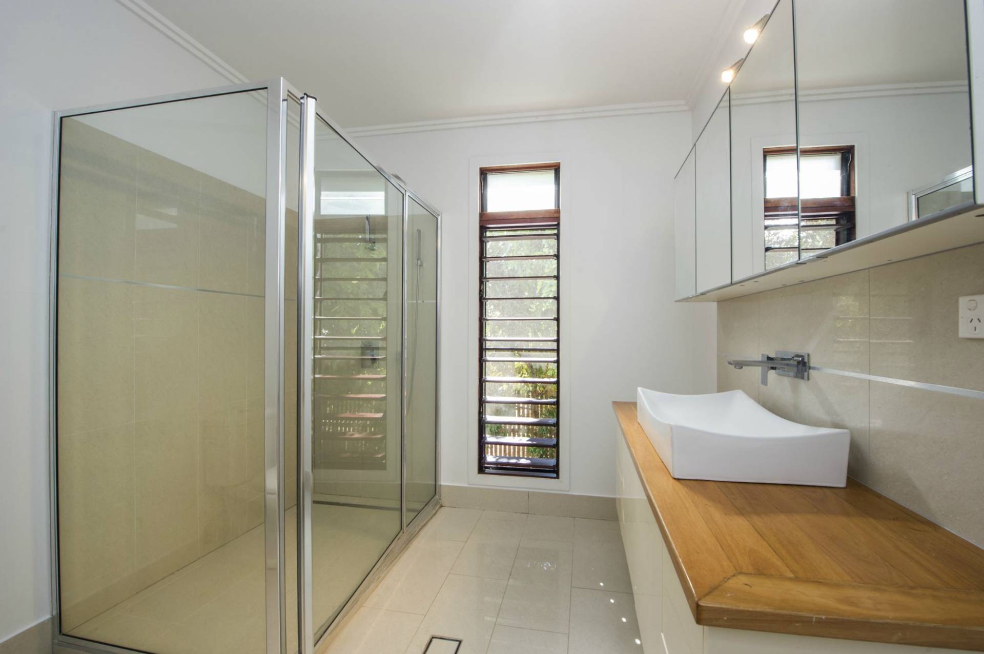 * Tiled bathroom with large shower, wall-hung vanity and toilet